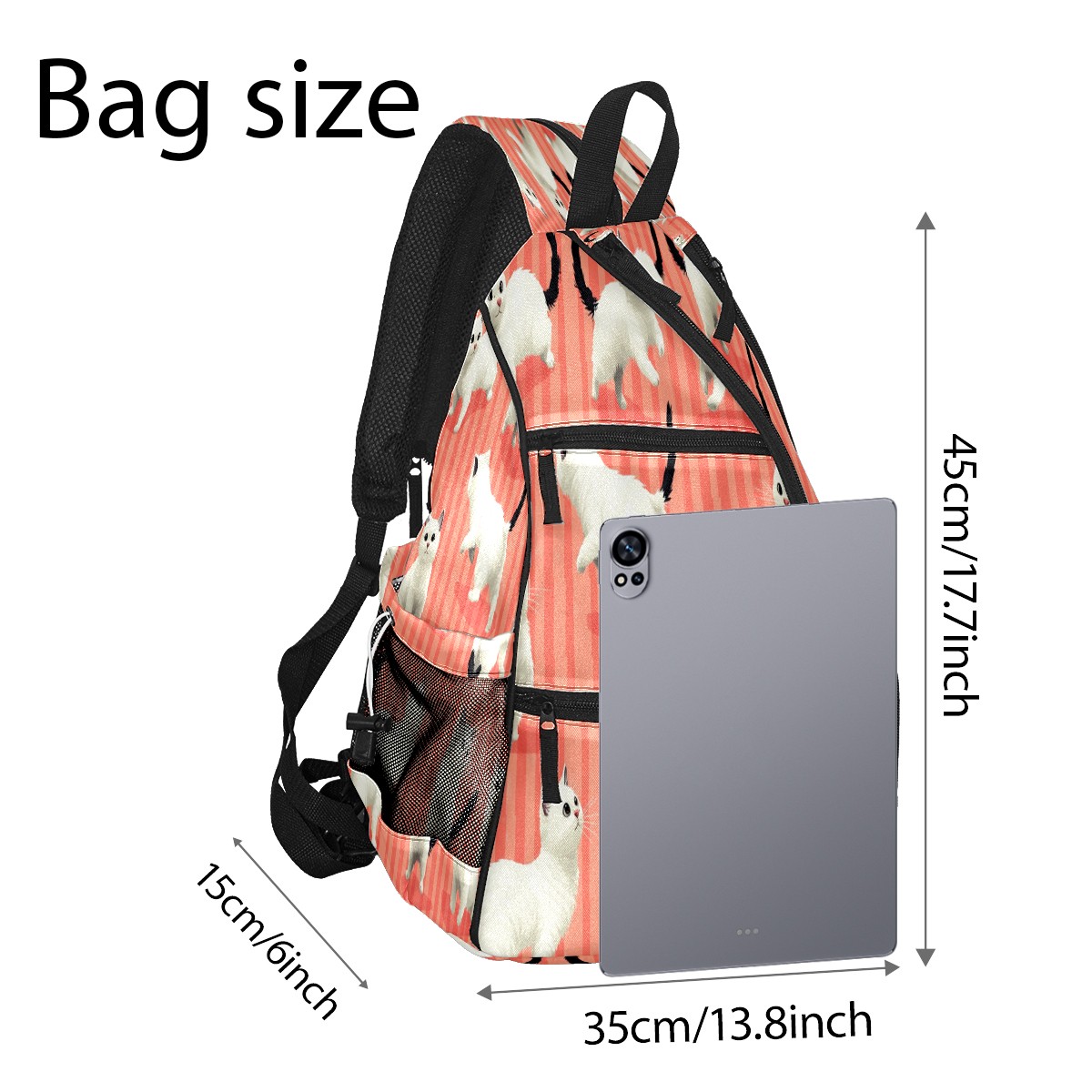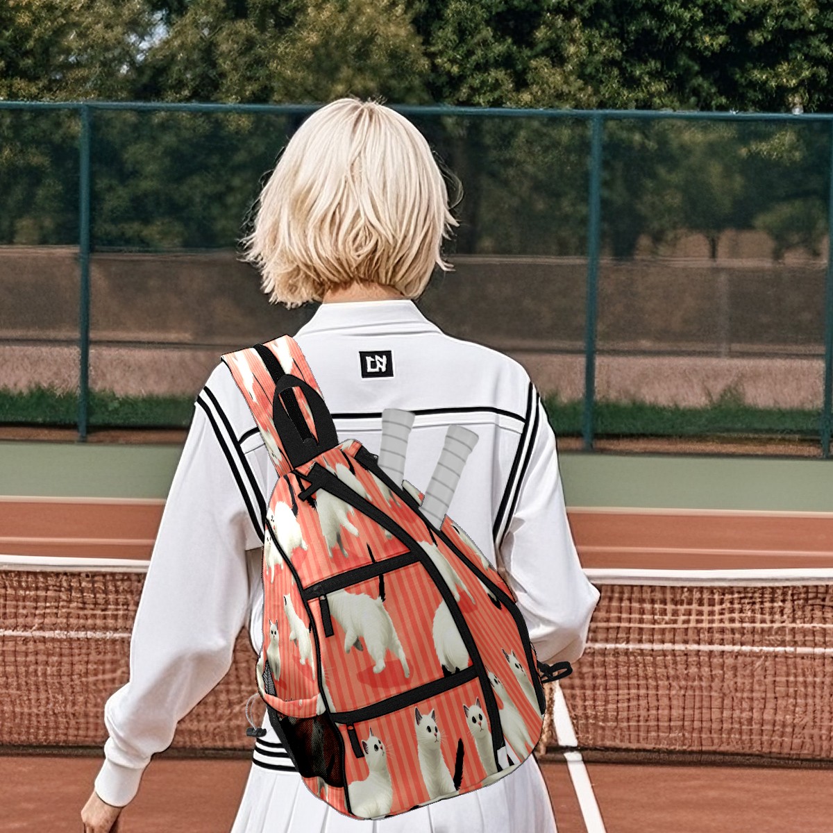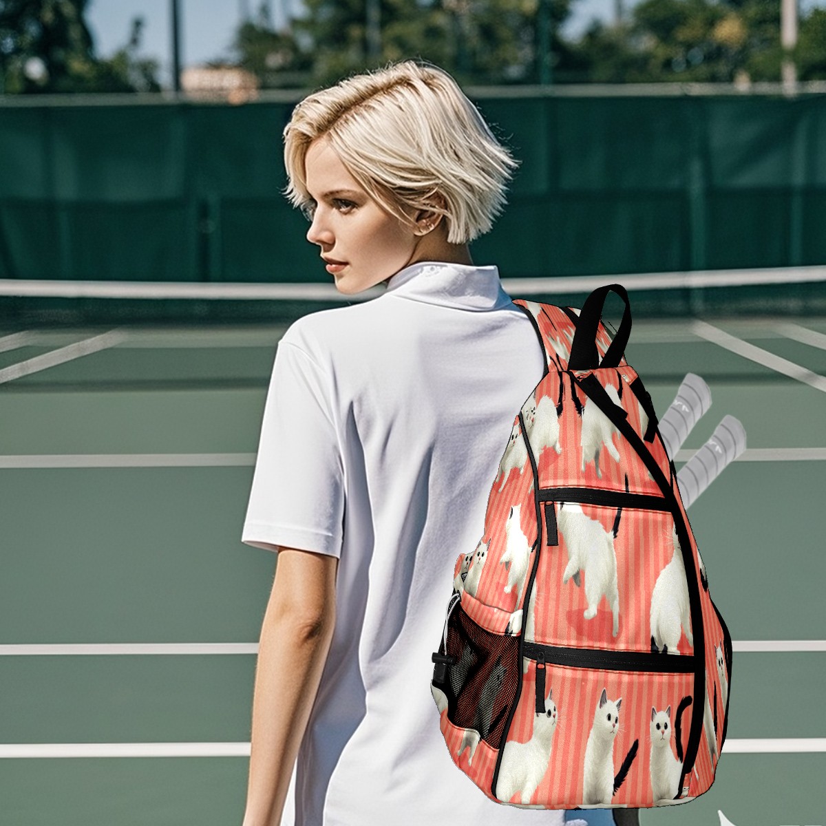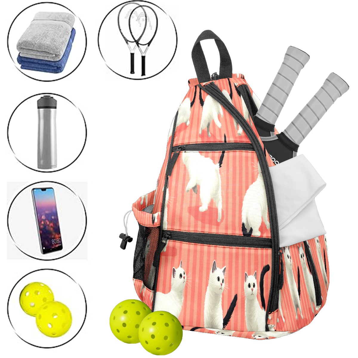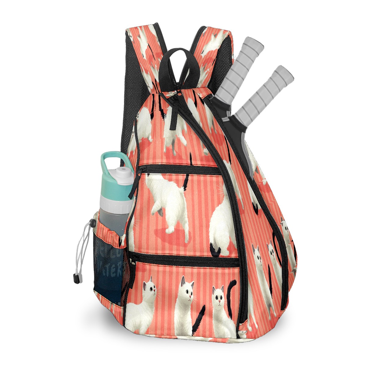 Multifunctional Pickleball Bag,Large Capacity Sports Pickleball Racket Bag, Water Bottle Holder and Fence Hook,Suitable for Both Men Women Pink Striped White Cat