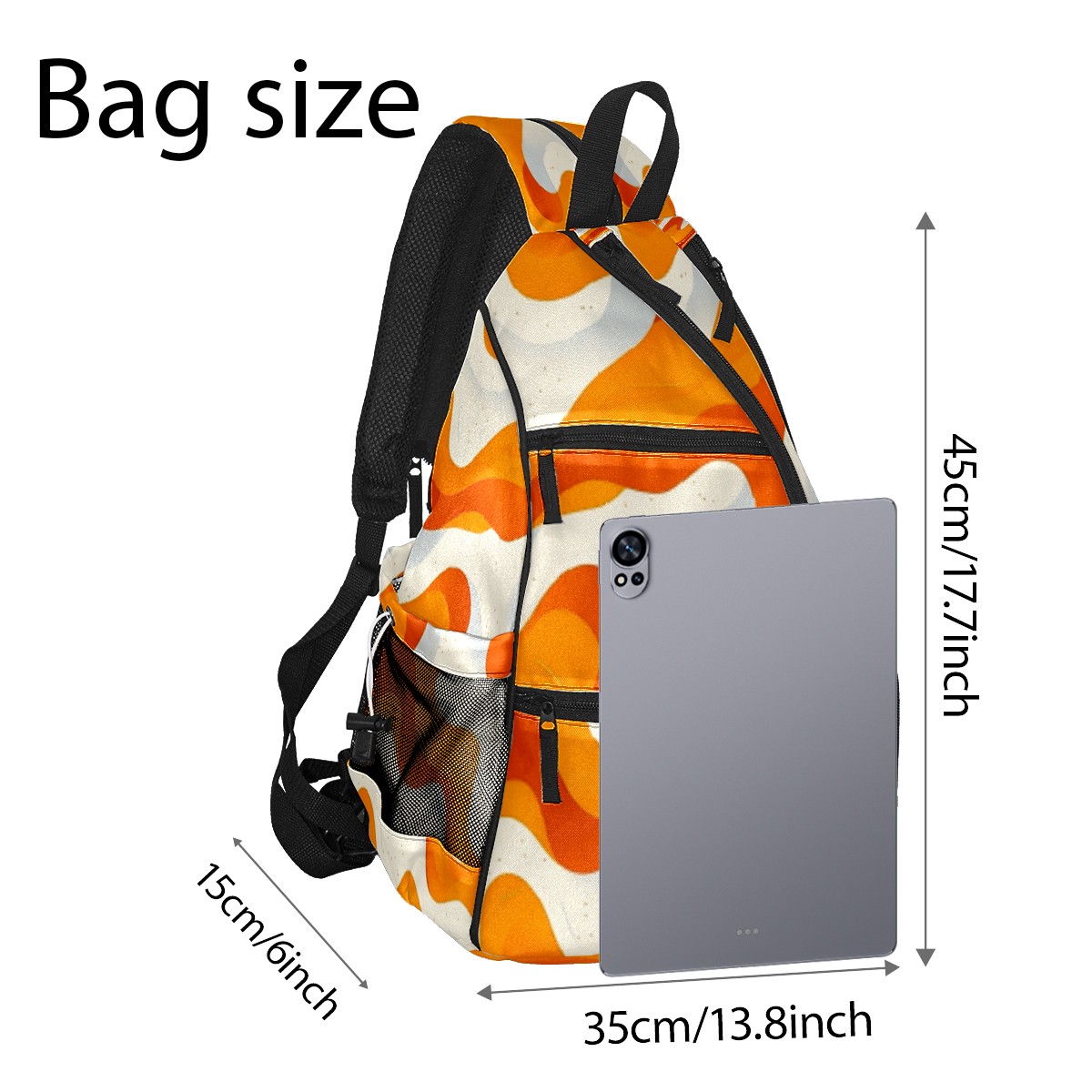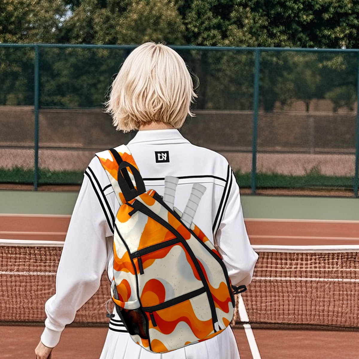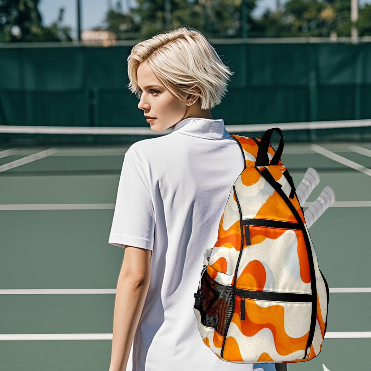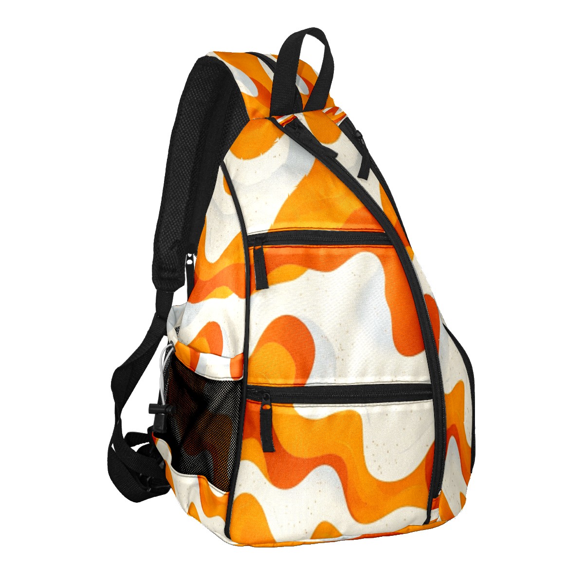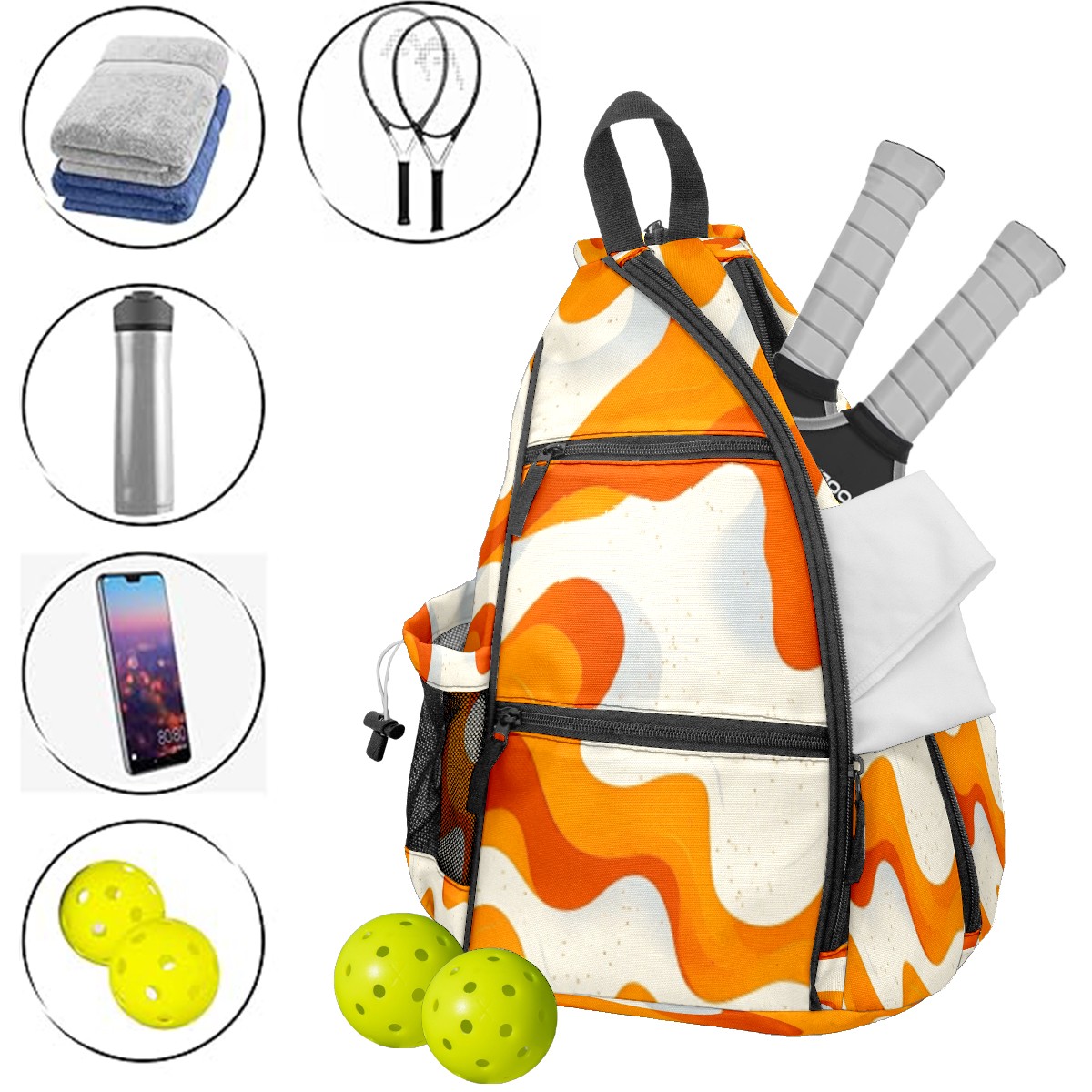 Pickleball Sling Bag for Women and Men - Backpack with Nylon Fabric/Woven Strap/Mesh Pocket/Fence Hook/Adjustable Bag Orange Curves Pattern