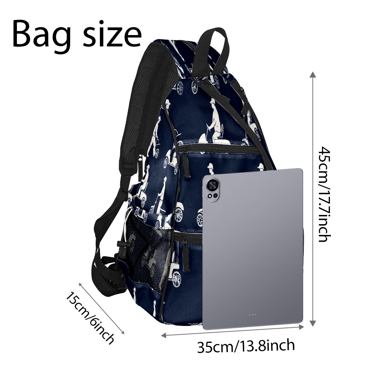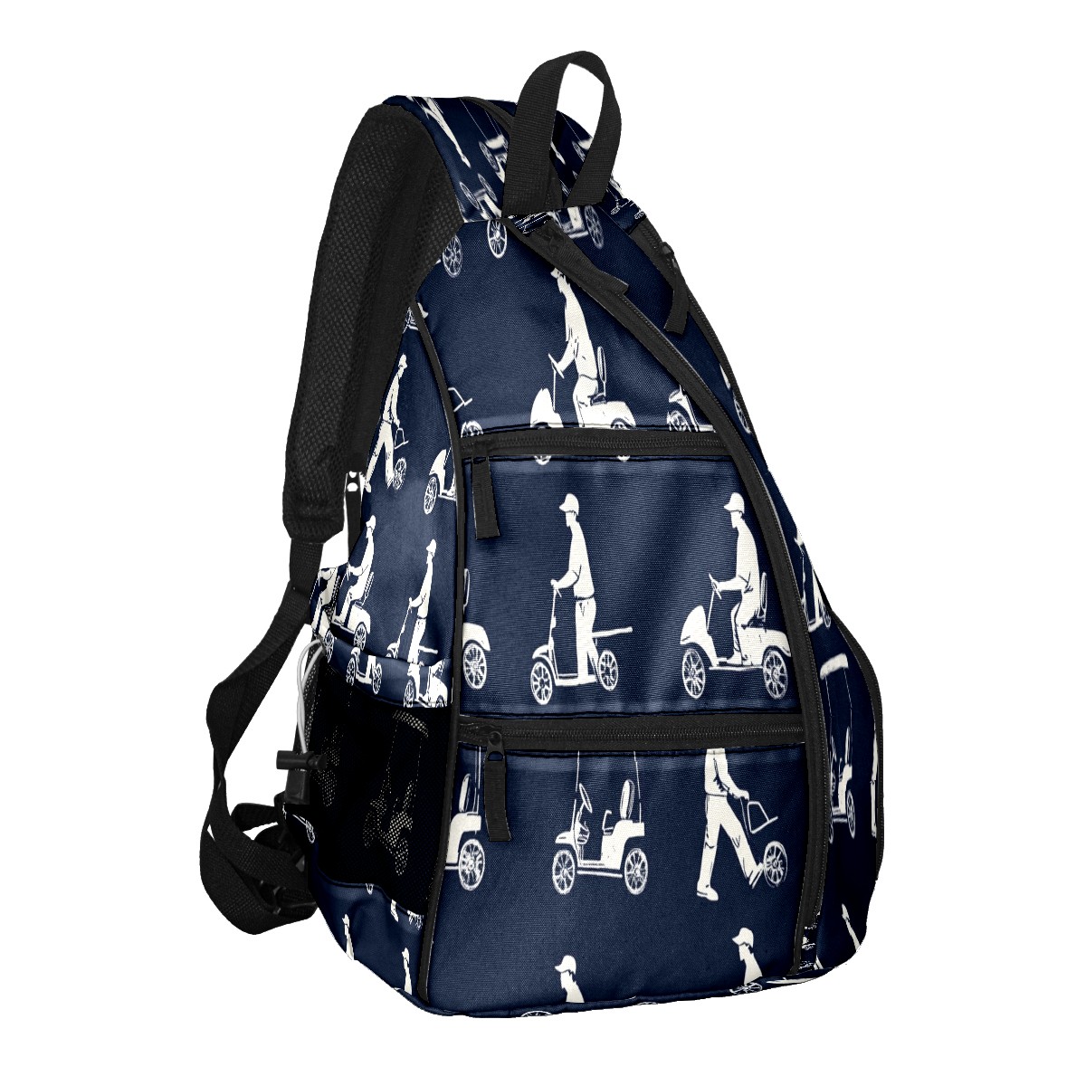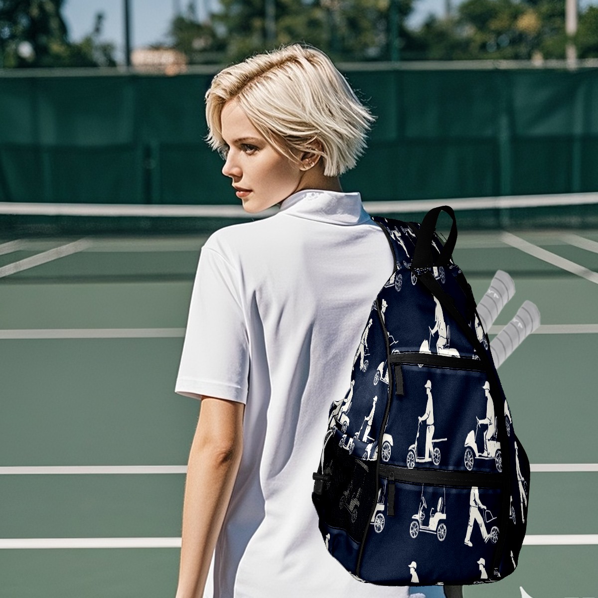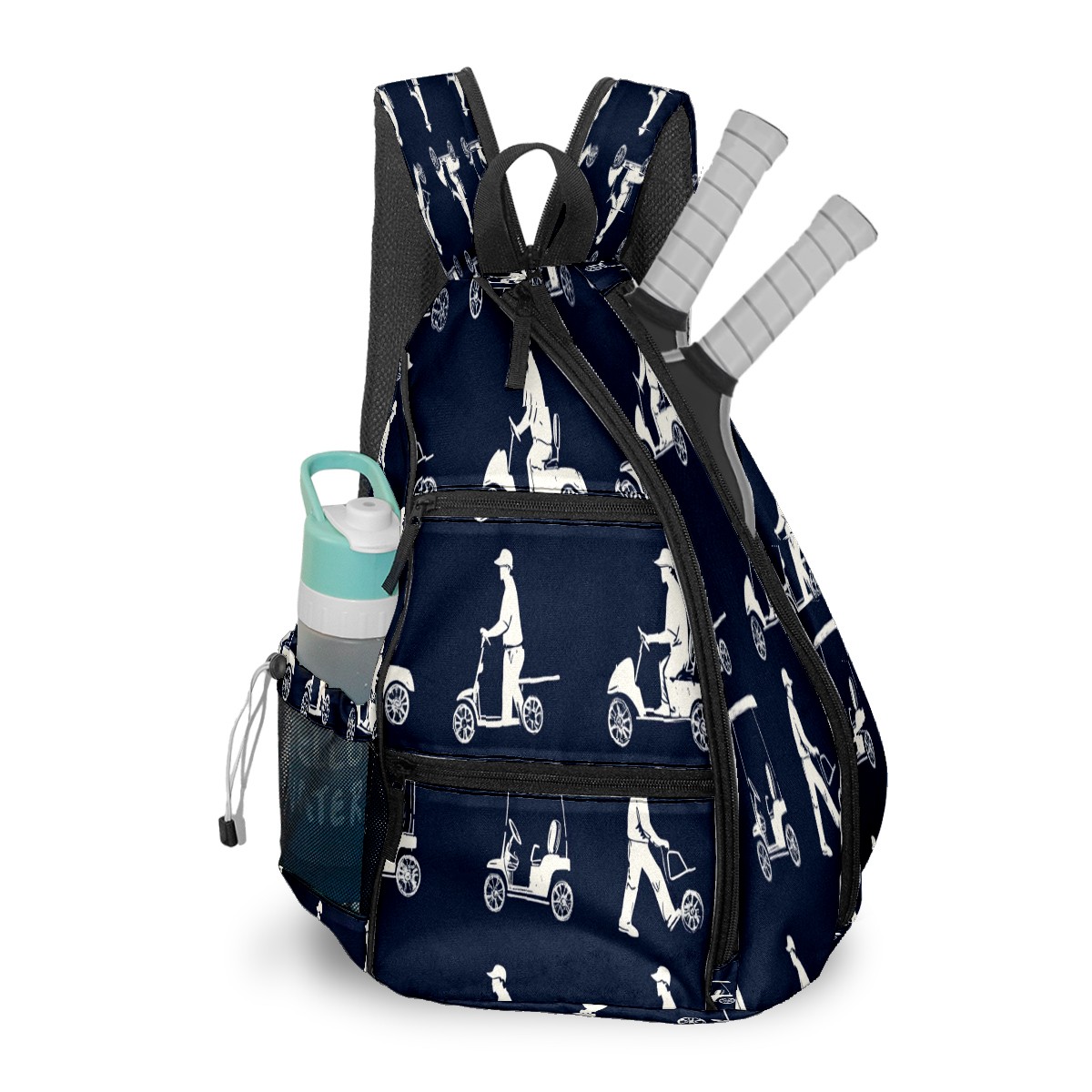 Pickleball Sling Bag for Women and Men - Backpack with Nylon Fabric/Woven Strap/Mesh Pocket/Fence Hook/Adjustable Bag Blue Golfers Poses Pattern