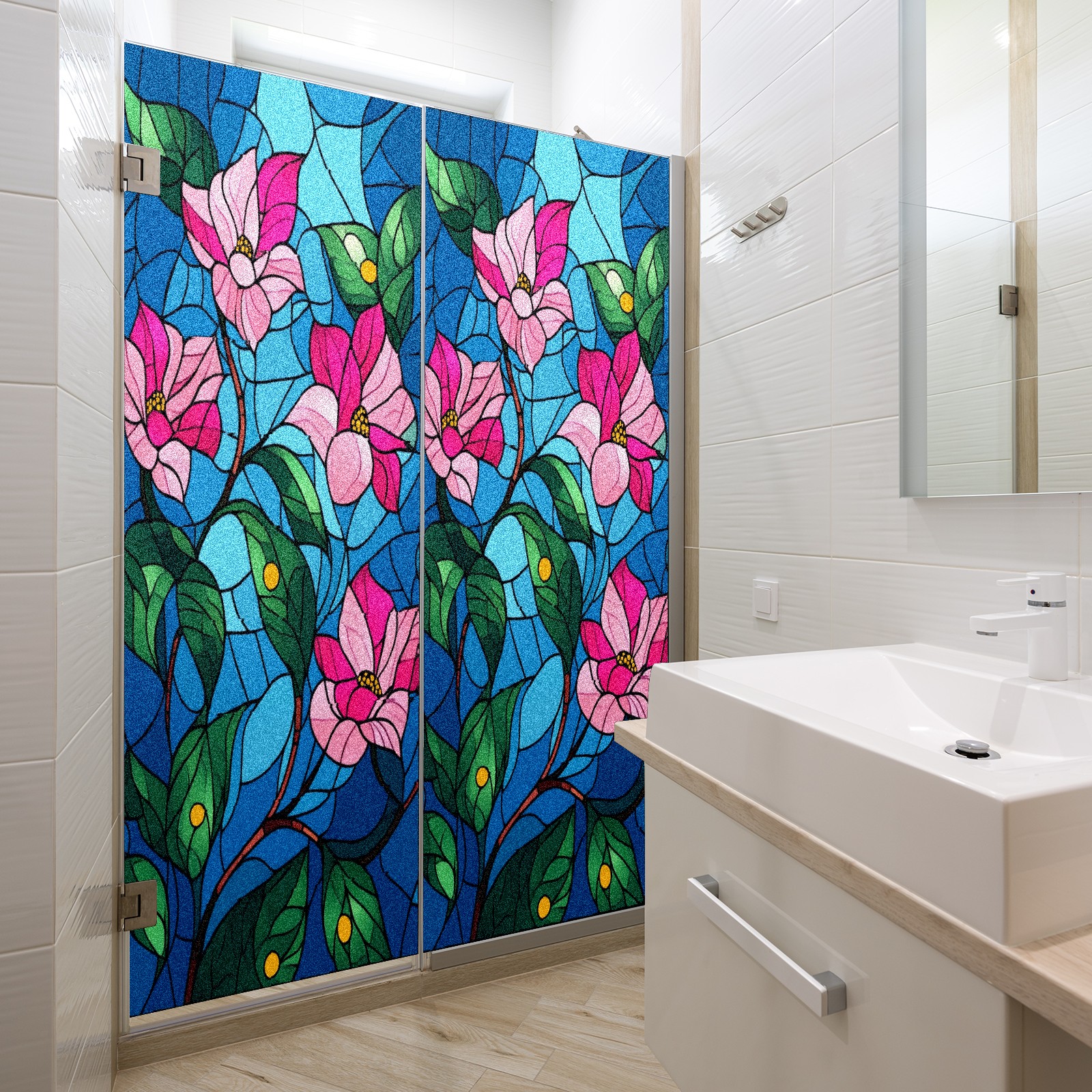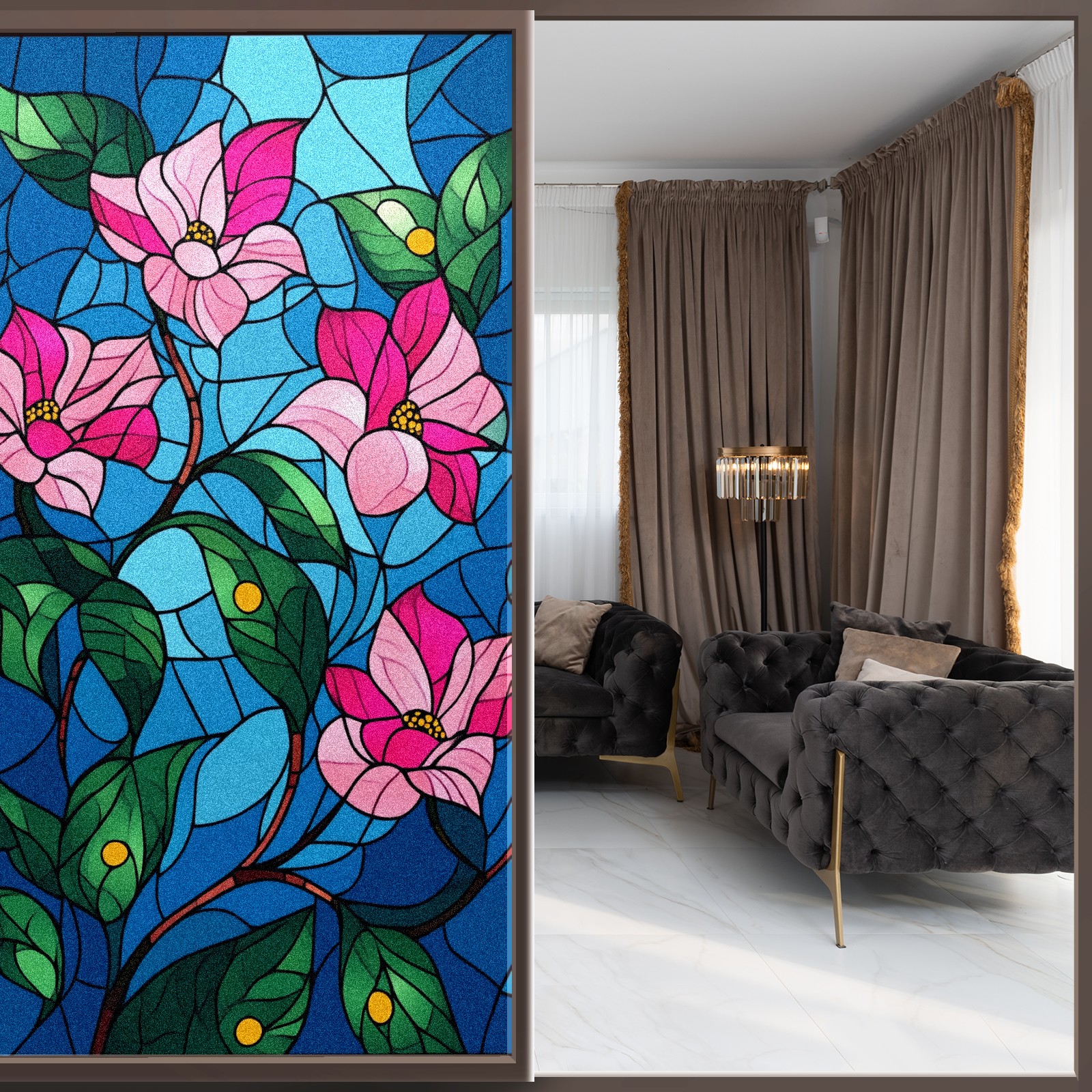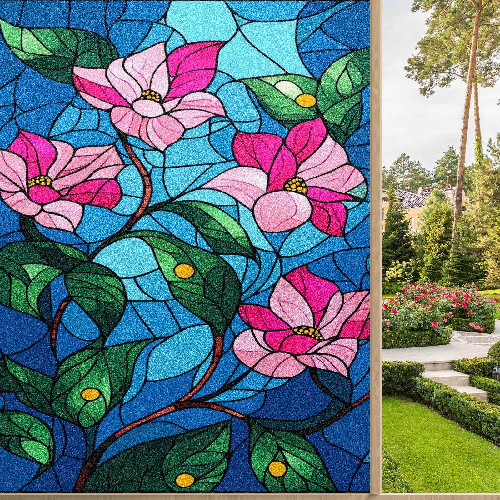 Stained Glass Window Film - Decorative Privacy Film for Windows, Peel and Stick Window Film for Bathroom/Office/Shower, Reusable and Easy to Cut 17.7"x23.6" (Pink Flowers)