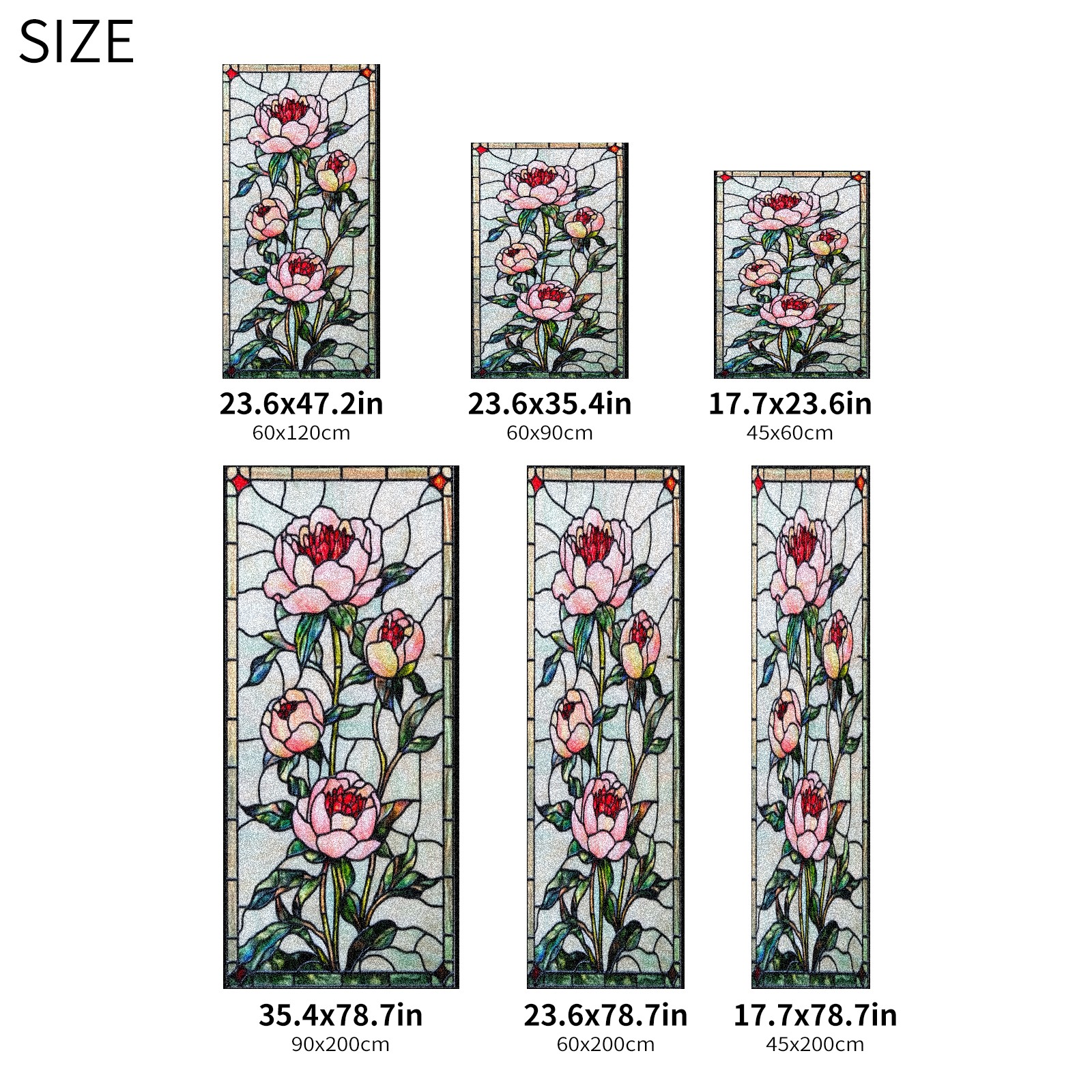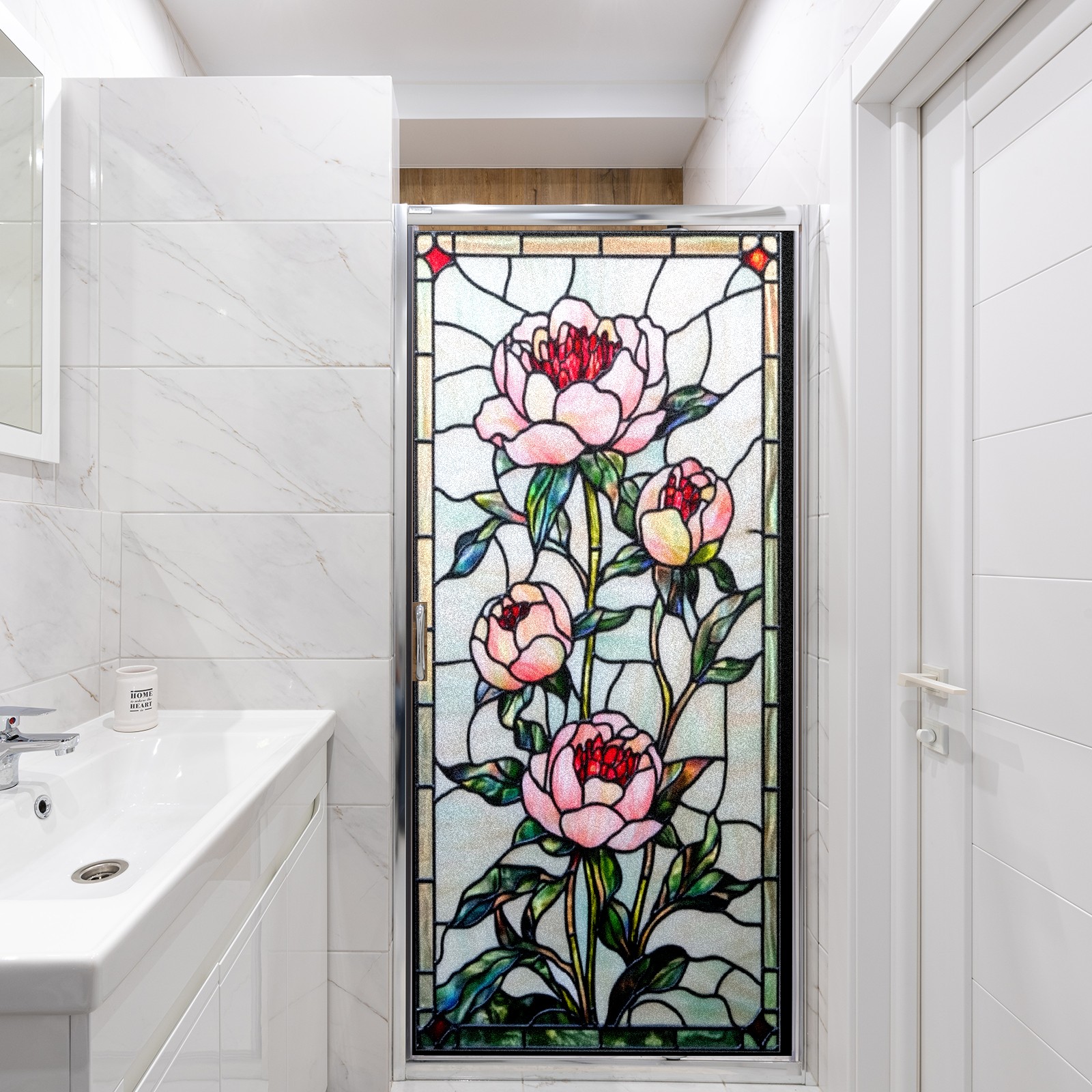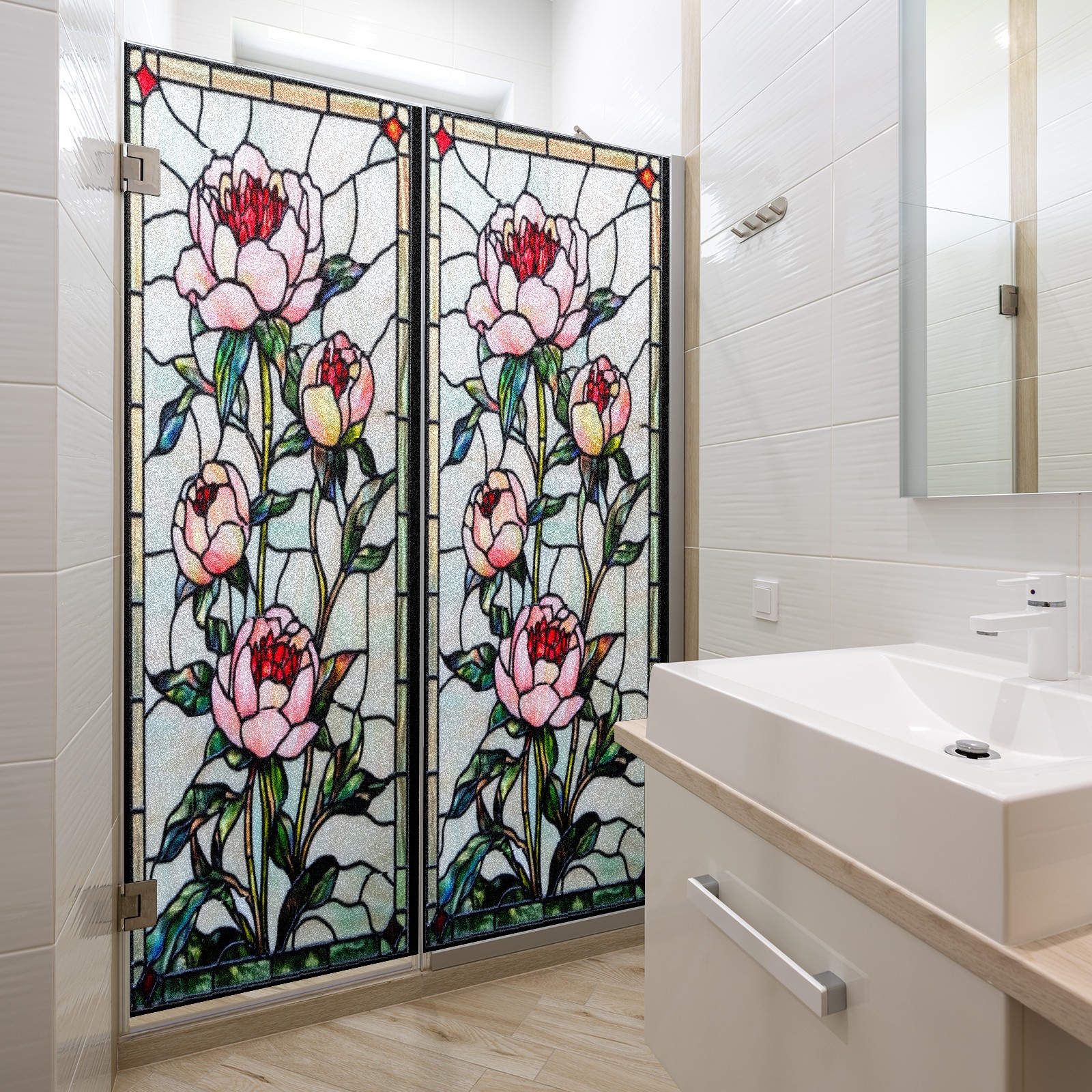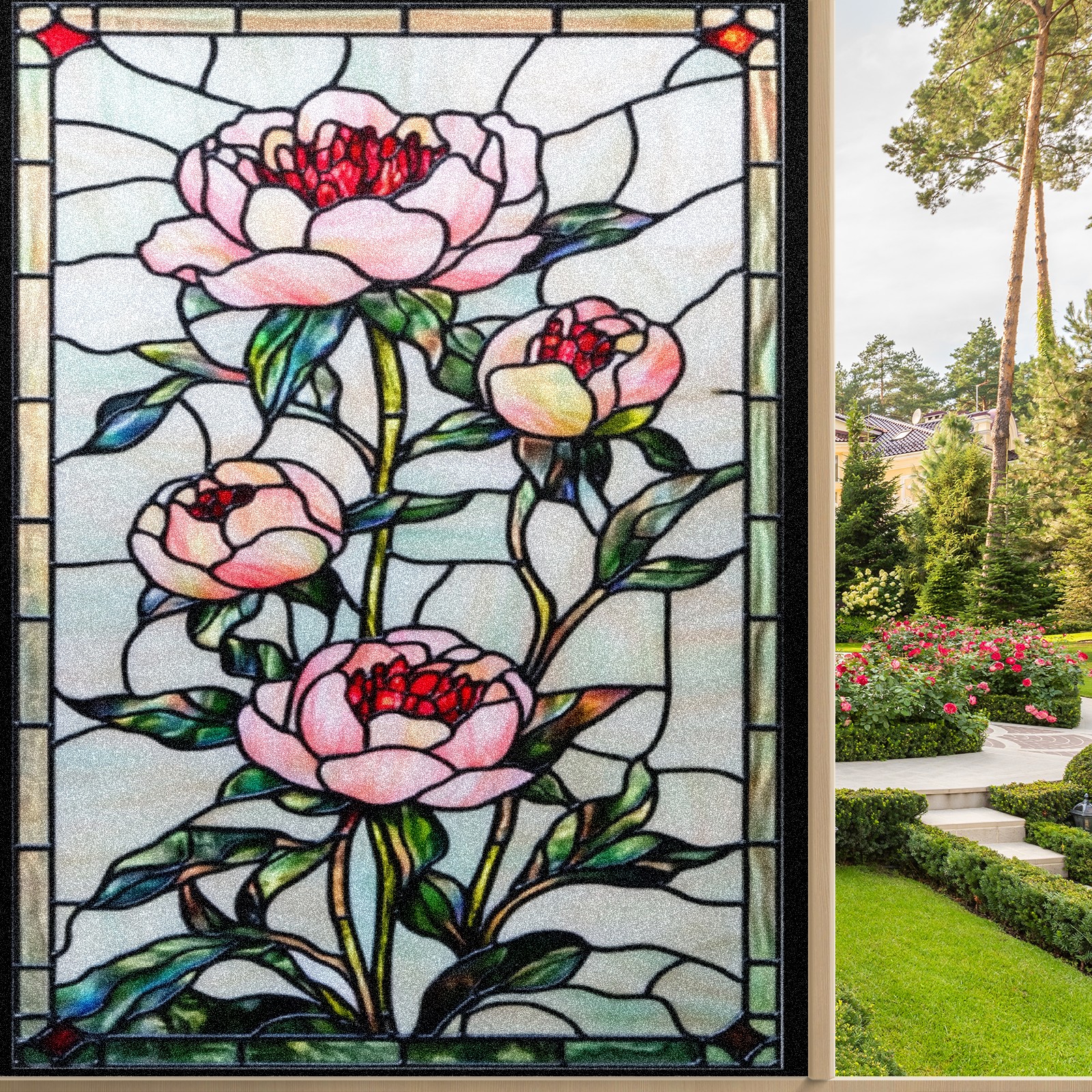 Stained Glass Window Film - Decorative Privacy Film for Windows, Peel and Stick Window Film for Bathroom/Office/Shower, Reusable and Easy to Cut 17.7"x23.6" (Pink And Green Flowers)