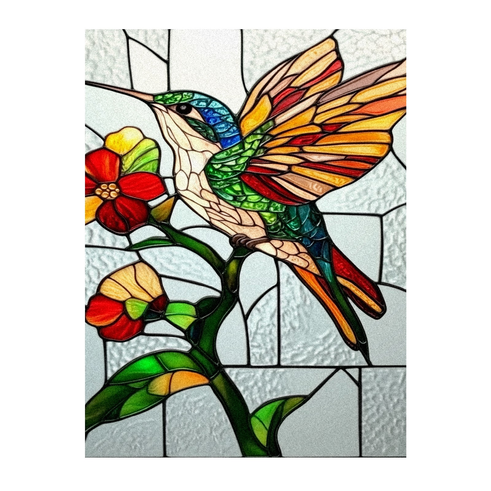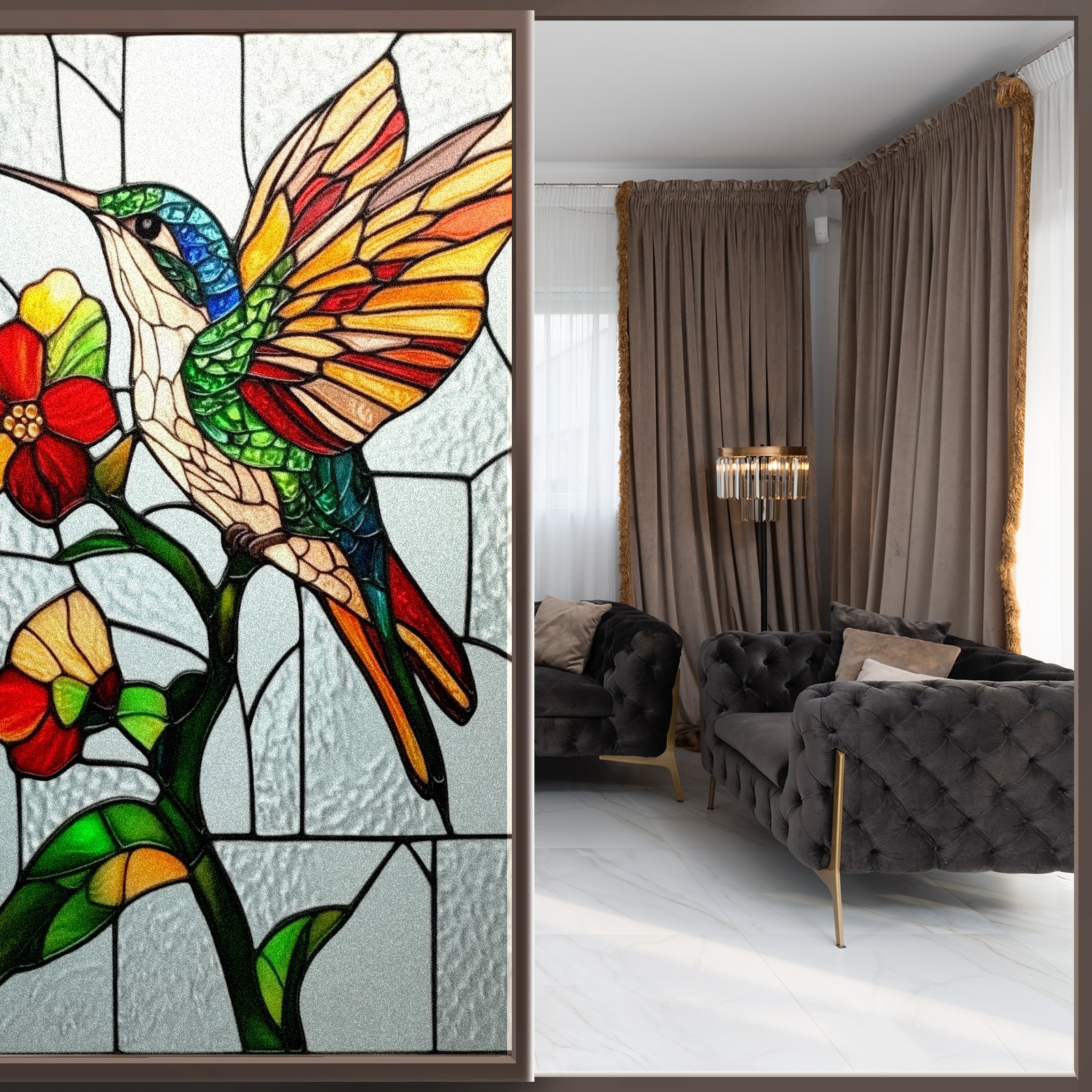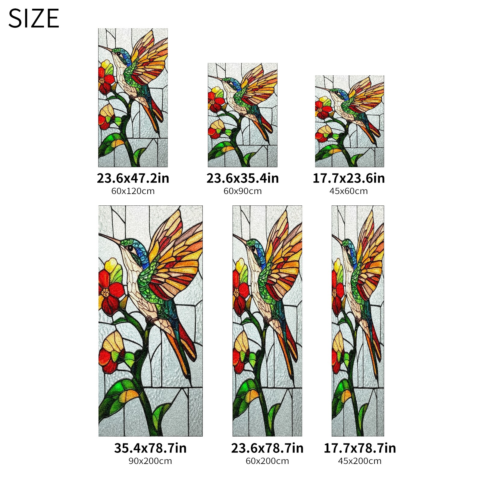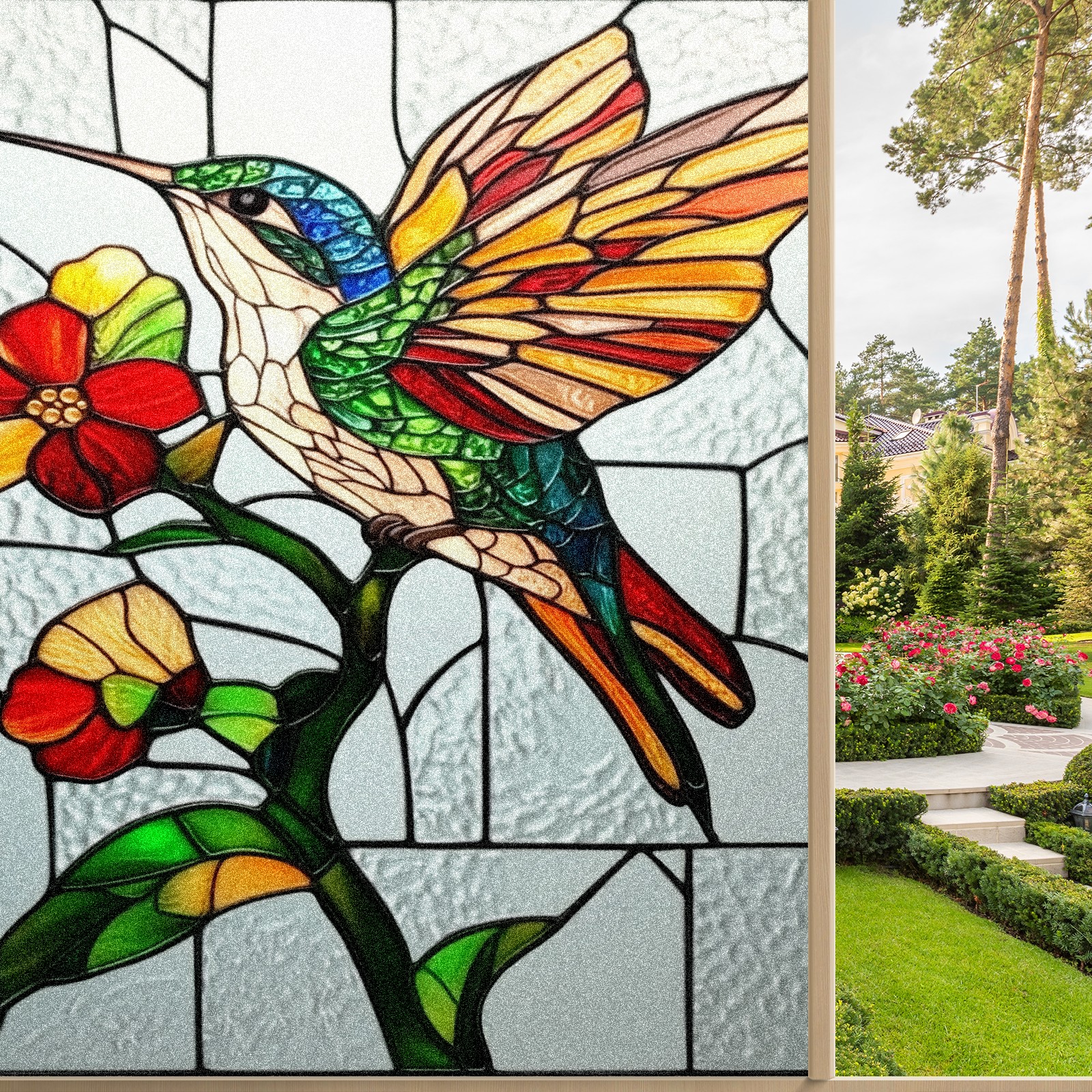 Stained Glass Window Film - Decorative Privacy Film for Windows, Peel and Stick Window Film for Bathroom/Office/Shower, Reusable and Easy to Cut 17.7"x23.6" (Hummingbird With Flowers)