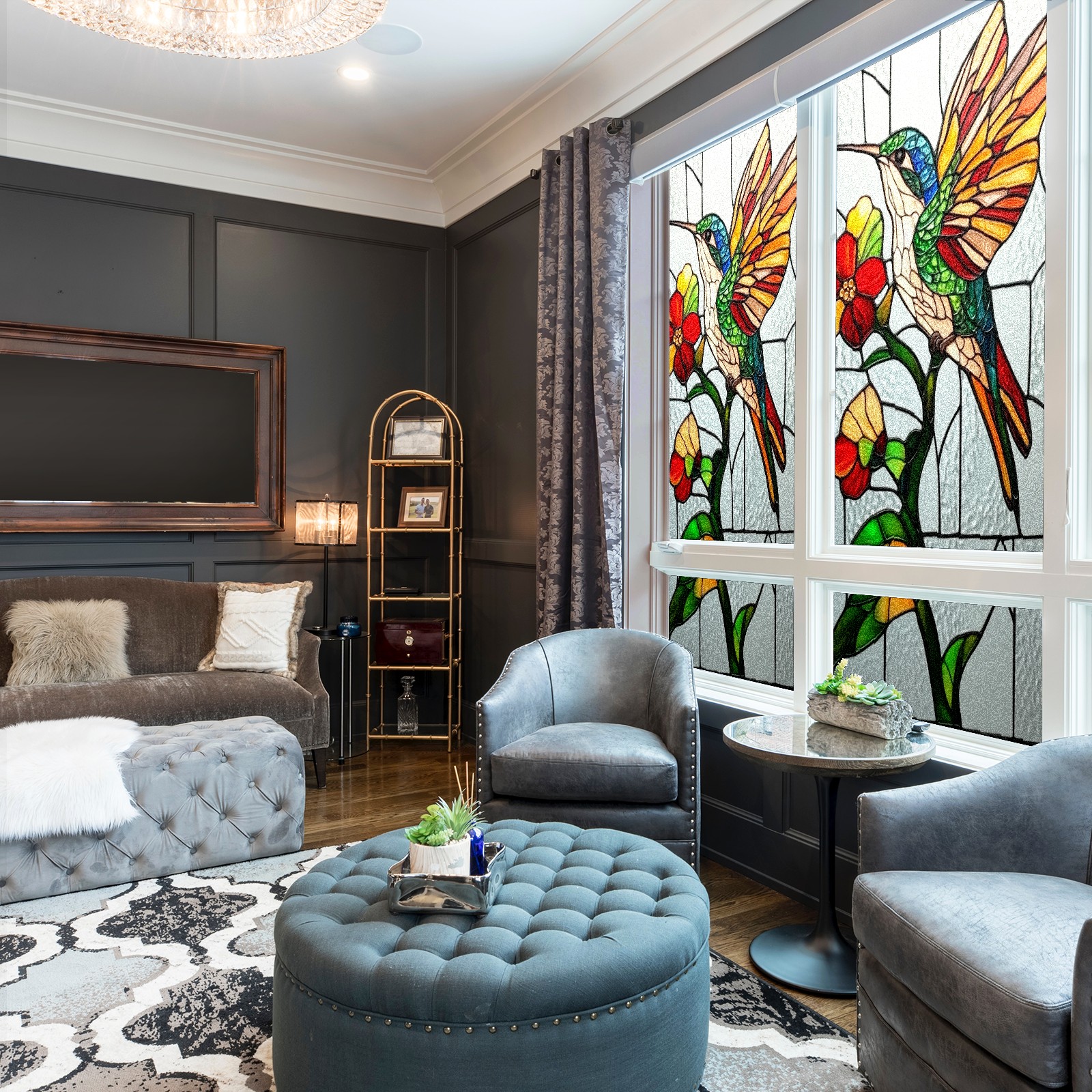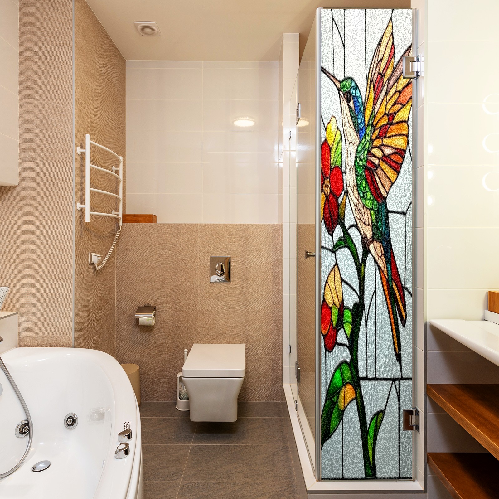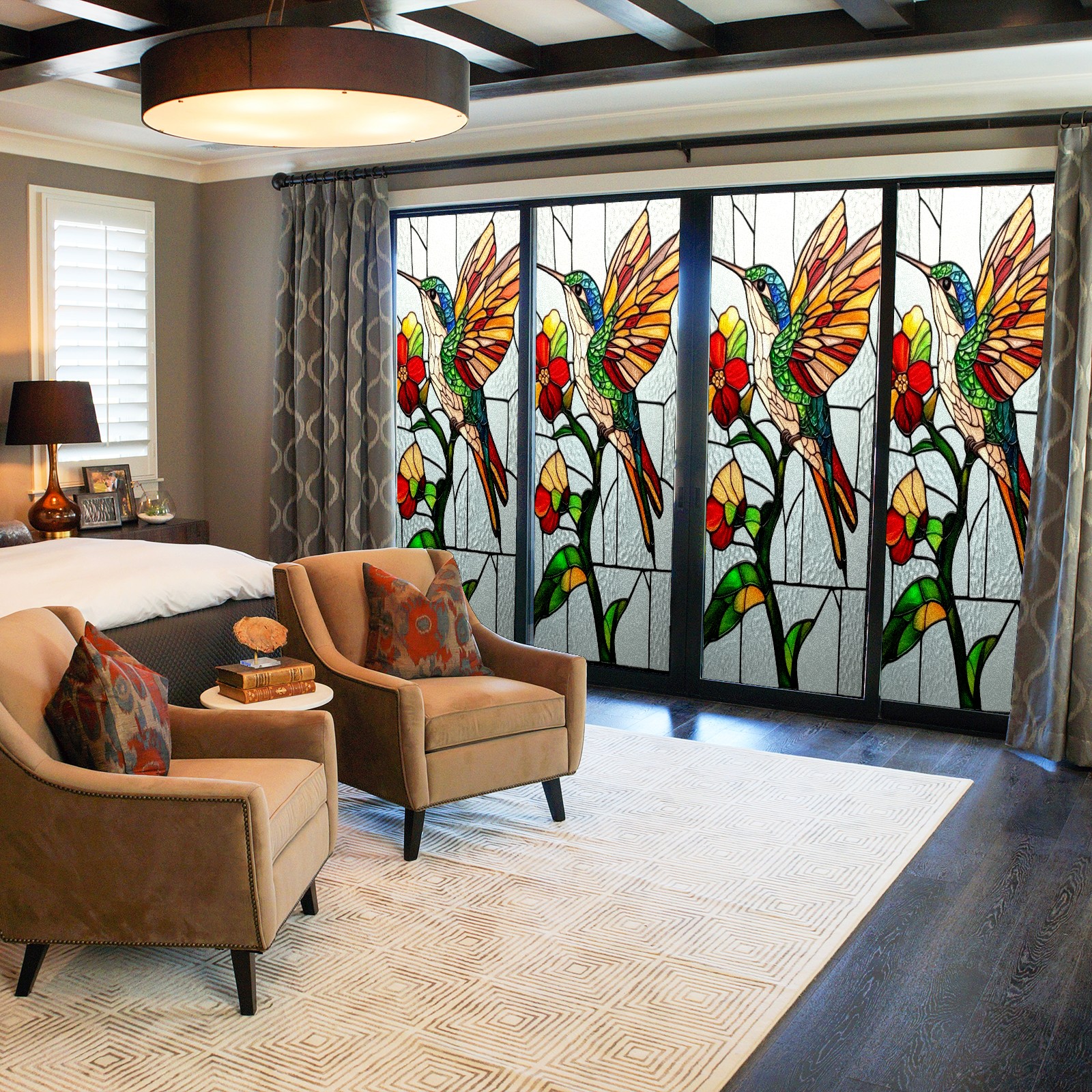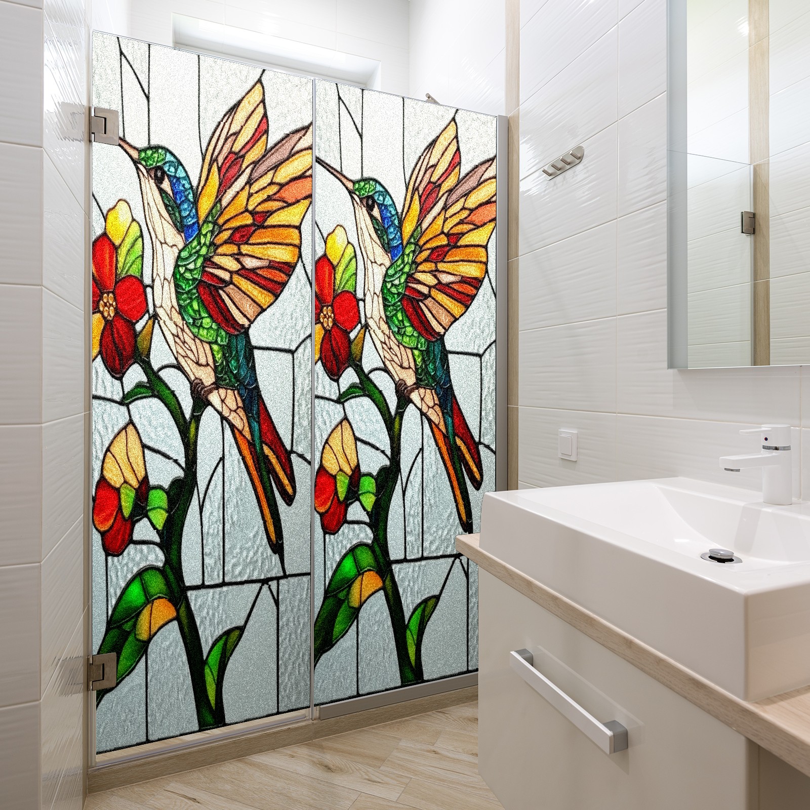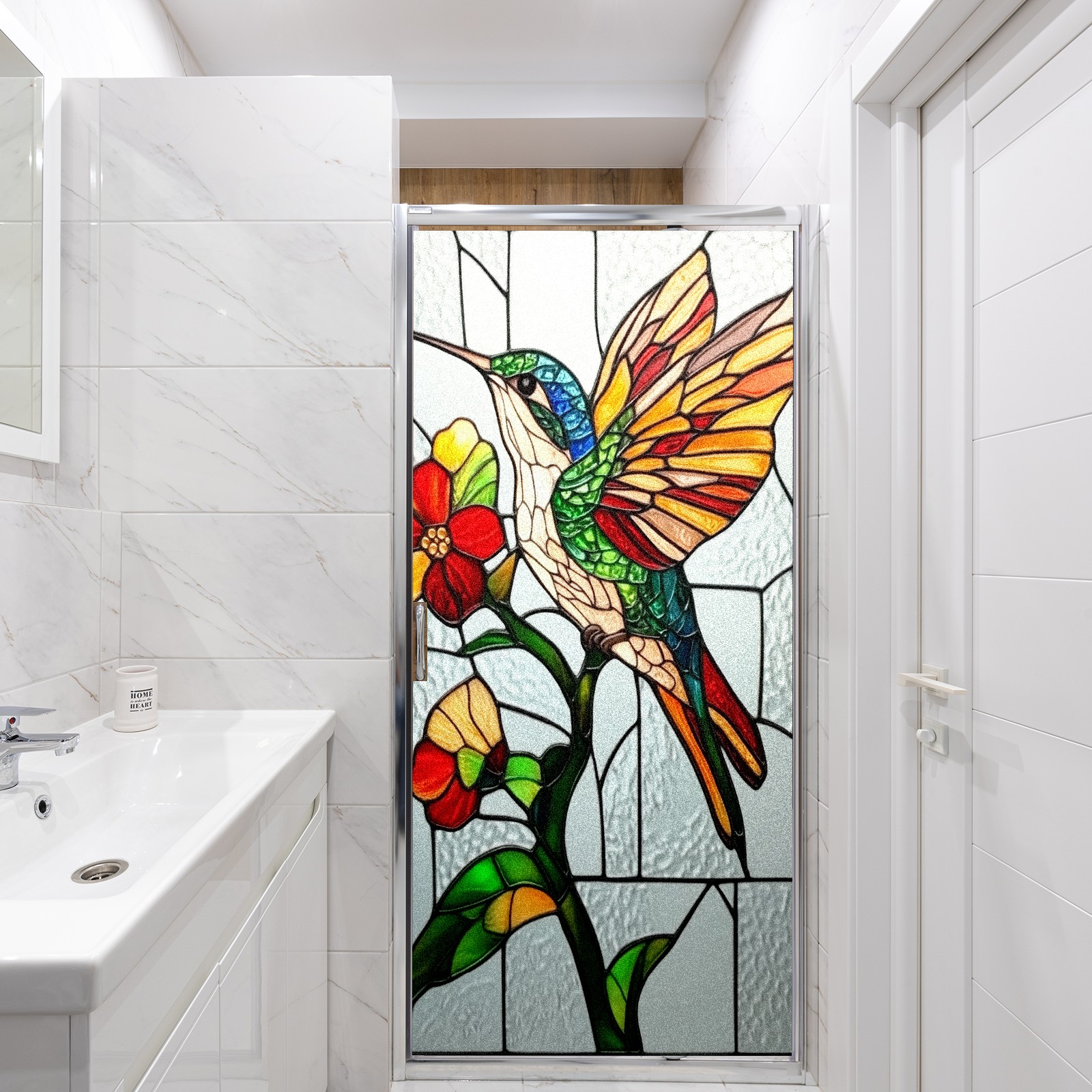 Stained Glass Window Film - Decorative Privacy Film for Windows, Peel and Stick Window Film for Bathroom/Office/Shower, Reusable and Easy to Cut 17.7"x23.6" (Hummingbird With Flowers)