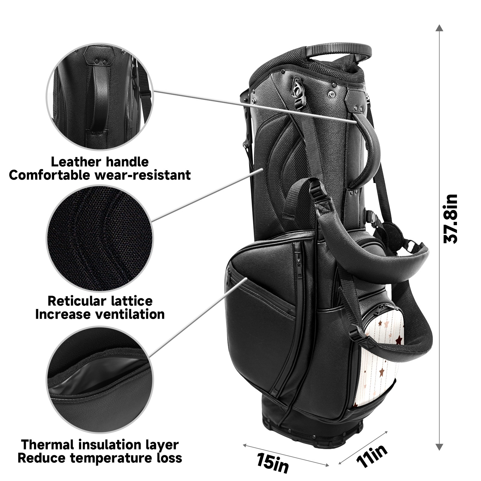<p>This golf cart bag combines versatility with durability, providing comprehensive protection and convenient access for your clubs. The five-way top compartments provide strategic zoning for easily storing a variety of clubs and protecting them from impacts and wear. The PU fabric and sturdy plastic base combine premium quality with durability. The versatile storage system includes multiple zippered pockets and a separate cooler compartment for storing equipment, accessories, and drinks. The portable rear handle allows for easy transport. The ergonomic, padded shoulder straps are adjustable and removable to fit your shoulder and reduce weight. A built-in rain cover effectively keeps out moisture, ensuring your clubs stay dry and protected in wet weather. This is the ideal golf bag for your golfing adventure.<br></p>