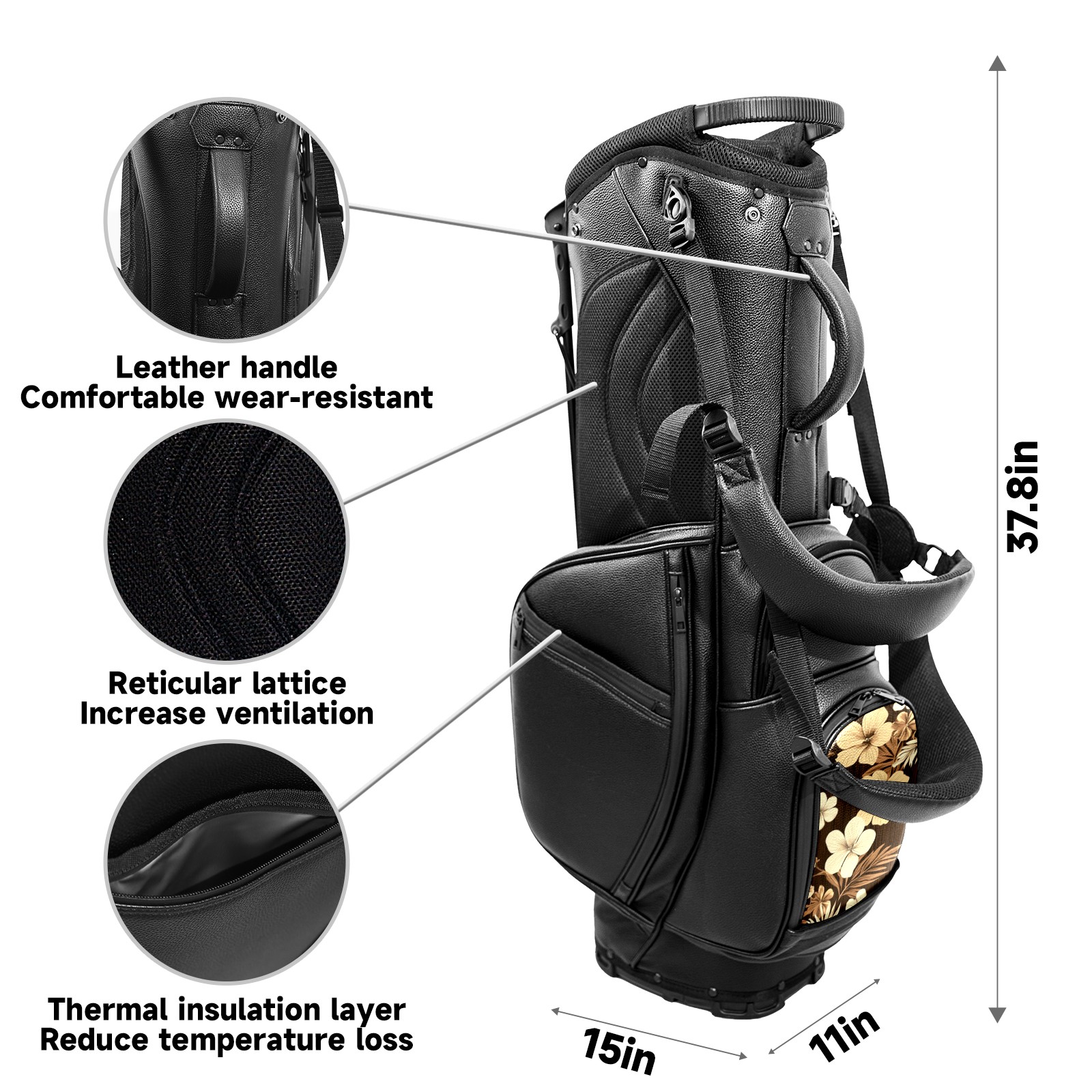 <p>This golf cart bag combines versatility with durability, providing comprehensive protection and convenient access for your clubs. The five-way top compartments provide strategic zoning for easily storing a variety of clubs and protecting them from impacts and wear. The PU fabric and sturdy plastic base combine premium quality with durability. The versatile storage system includes multiple zippered pockets and a separate cooler compartment for storing equipment, accessories, and drinks. The portable rear handle allows for easy transport. The ergonomic, padded shoulder straps are adjustable and removable to fit your shoulder and reduce weight. A built-in rain cover effectively keeps out moisture, ensuring your clubs stay dry and protected in wet weather. This is the ideal golf bag for your golfing adventure.<br></p>