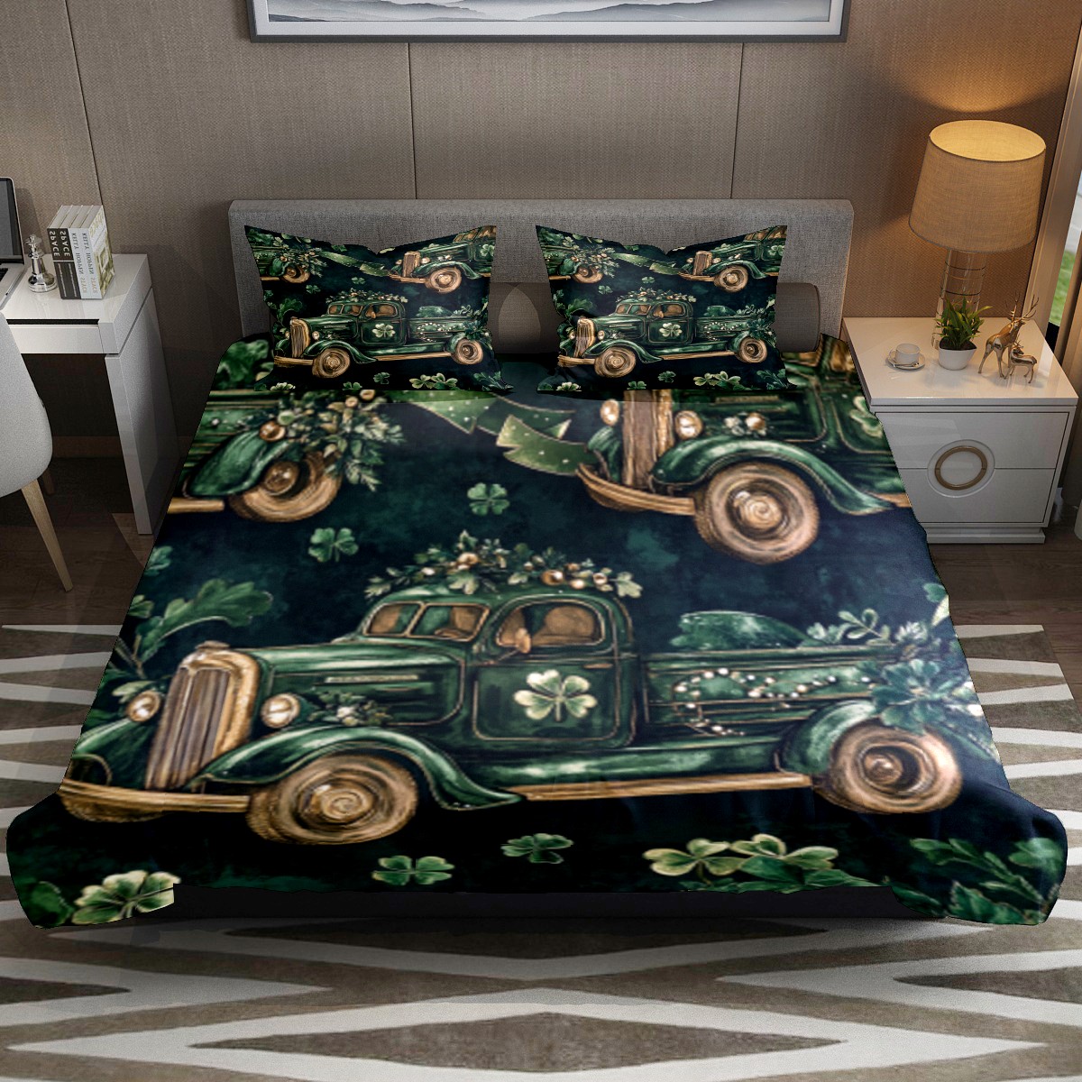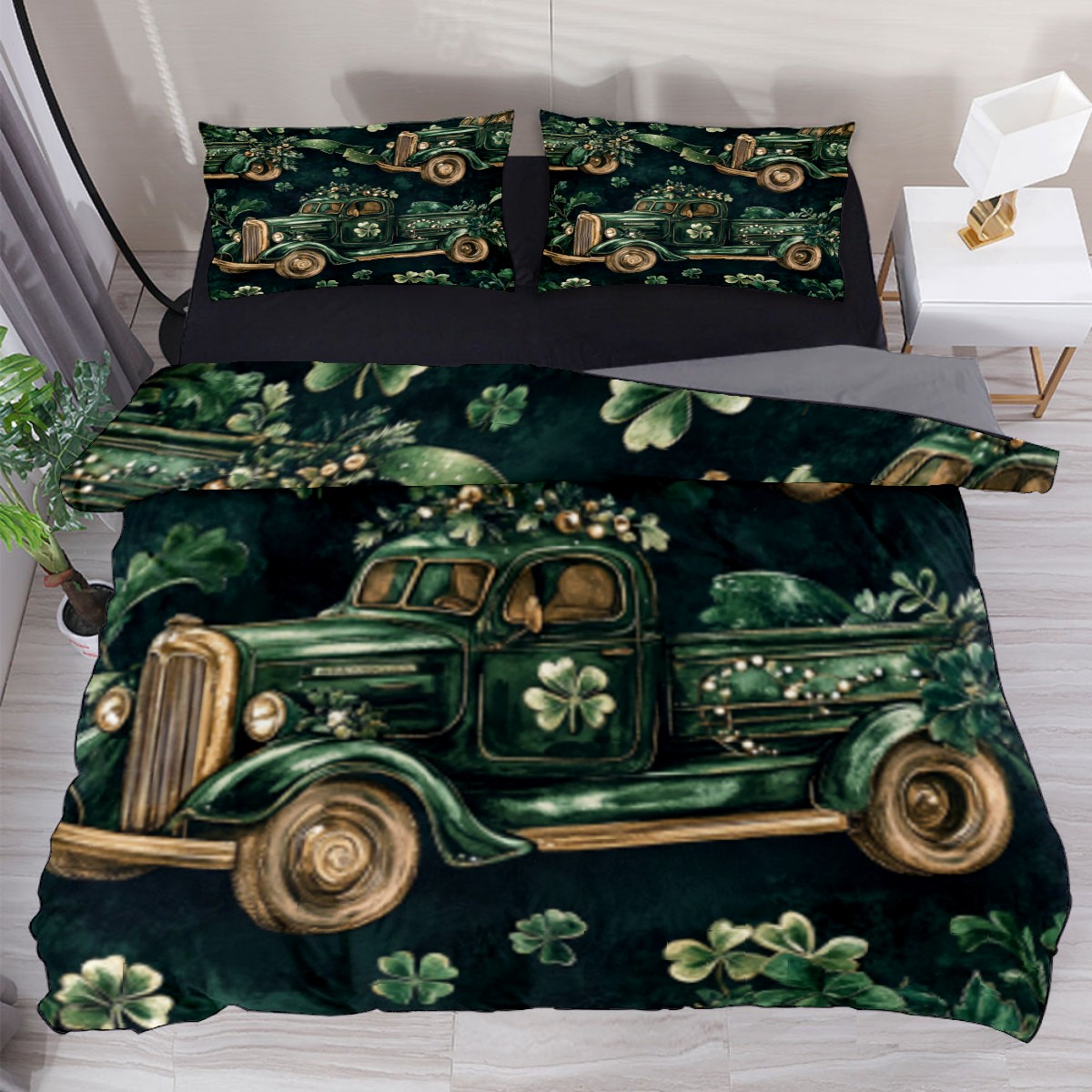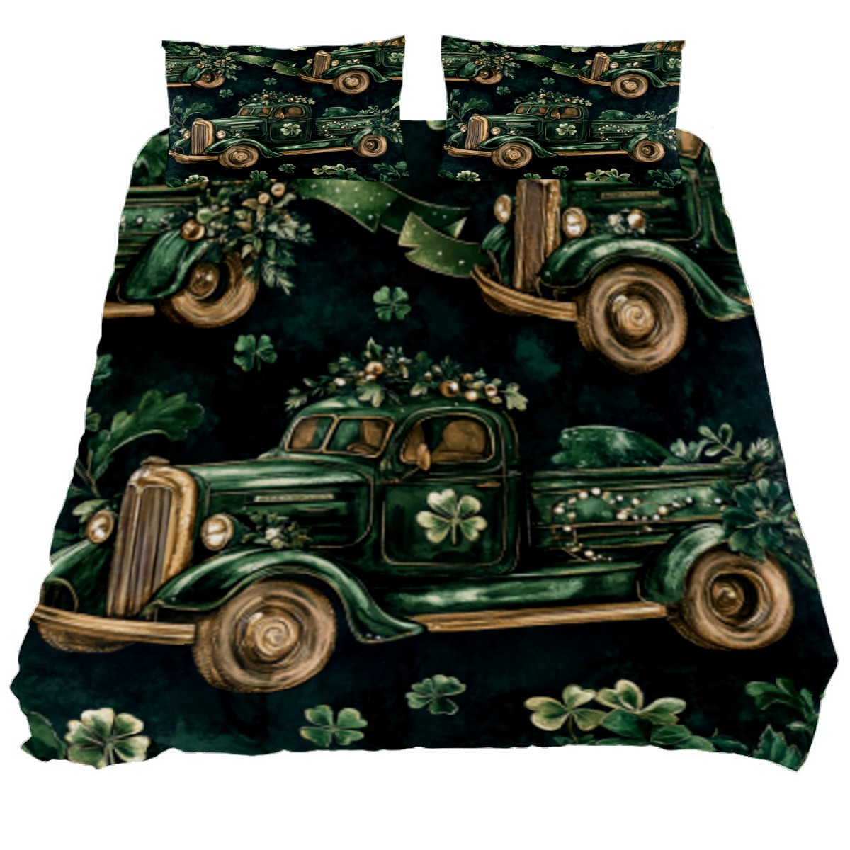 HELVOON 3-Piece Bed Set - Soft Microfiber Bedding (1 Duvet Cover + 2 Pillowcases), Vibrant Heat-Transfer Print, Fade & Pilling Resistant, Qu- ee-n/King Size Green Truck Pattern