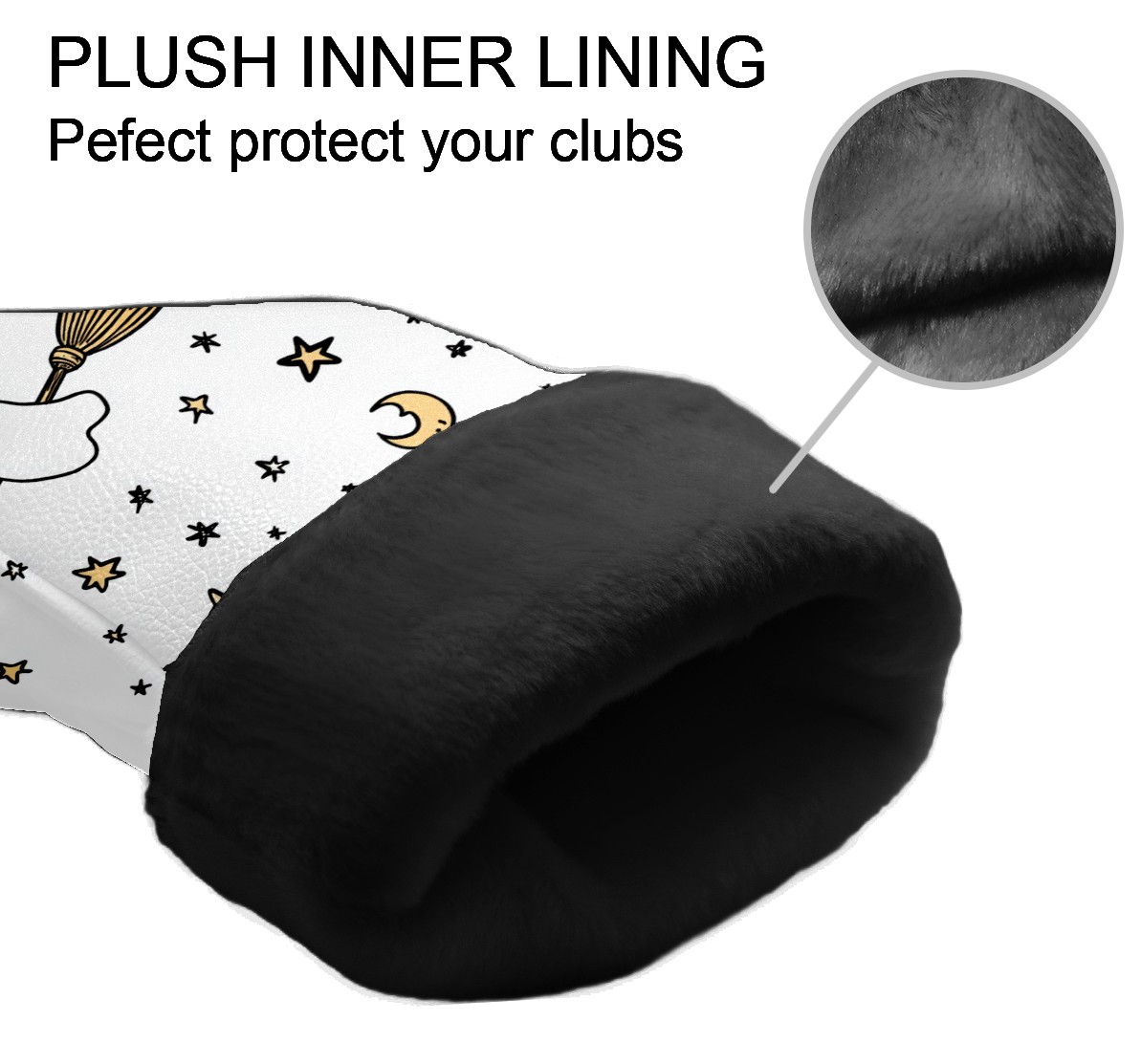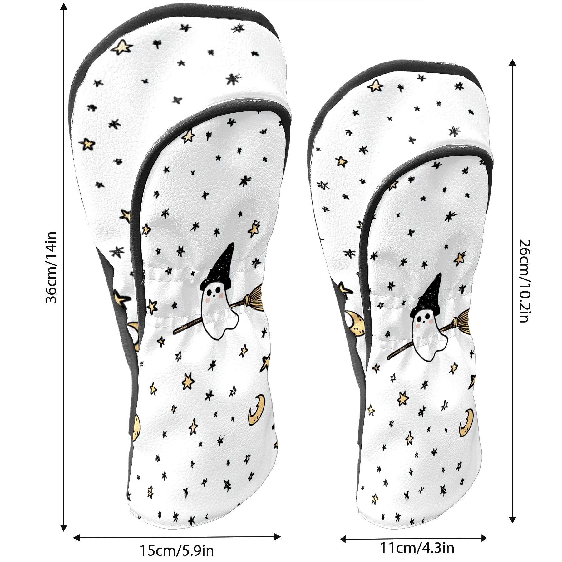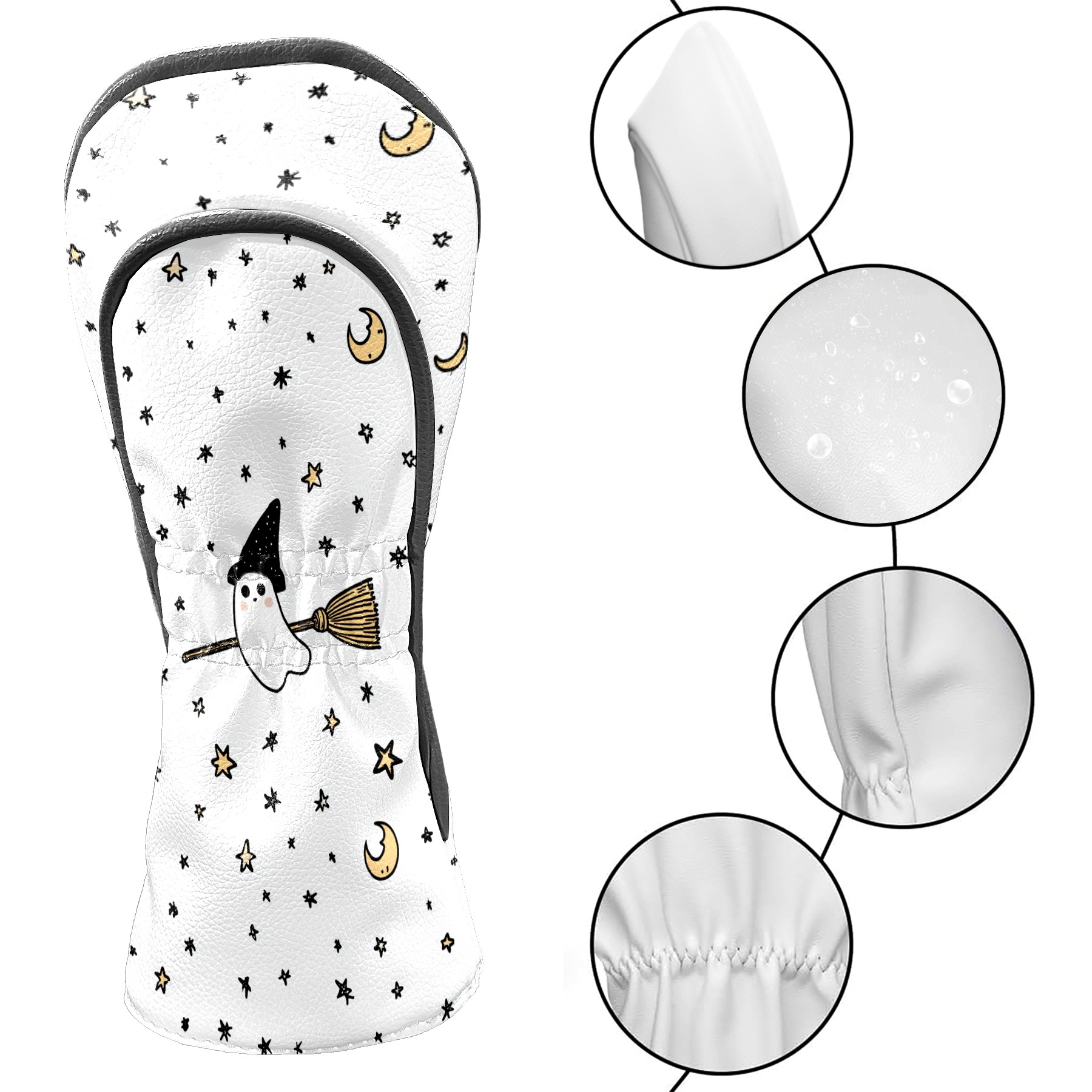 Golf Club Head Covers - While Mini Ghost Broom Design, Premium PU Leather Driver/Fairway Wood Cover with Velvet Lining, Waterproof | Unisex Golf Gift