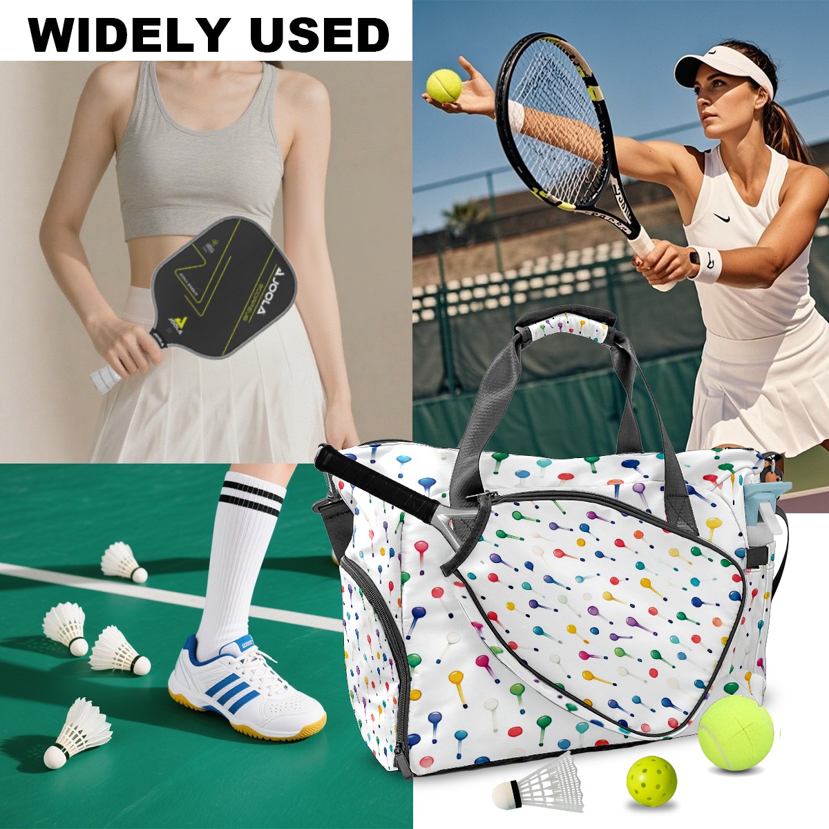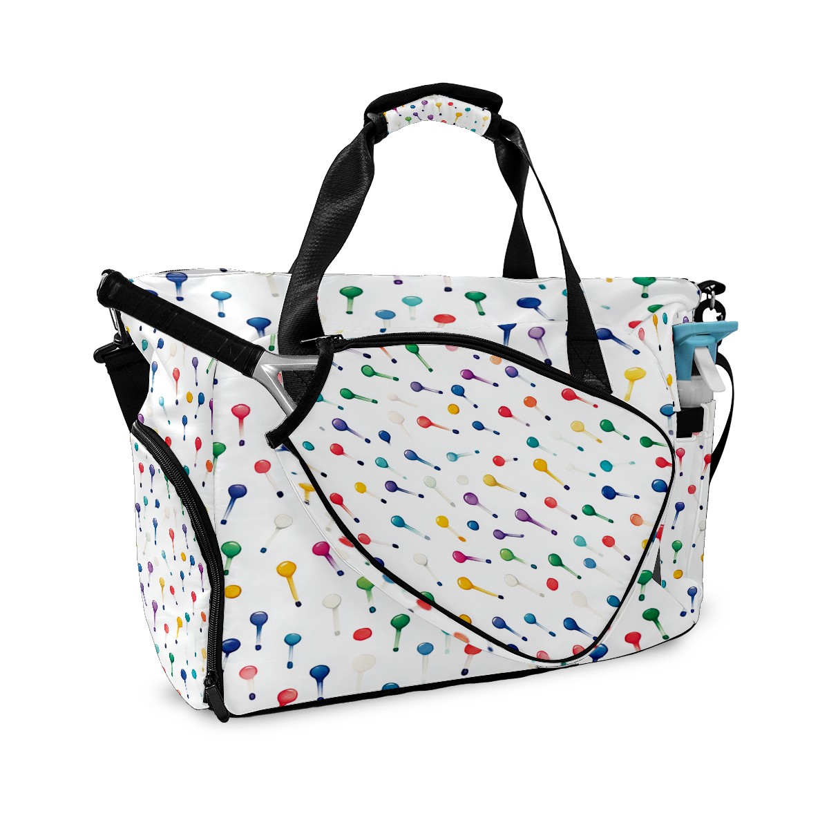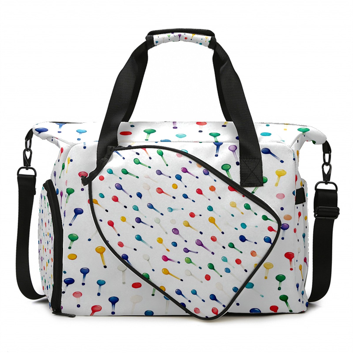 Lightweight Pickleball Tote Bag with Large Capacity, Shoe Compartment, Large Paddle Storage, Water Bottle Holder & Fence Hook for Women & Men Colorful Golf Tee Pattern