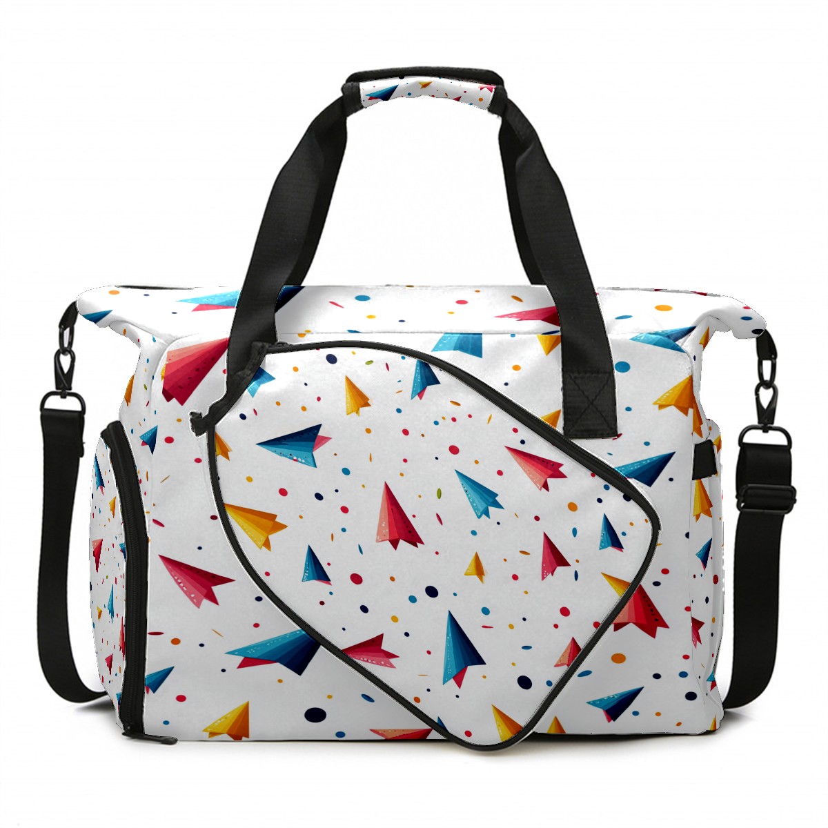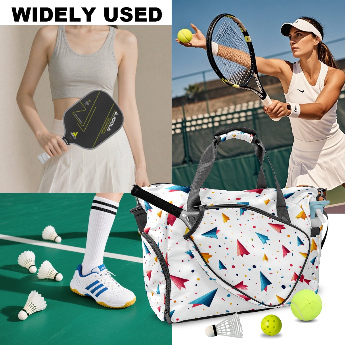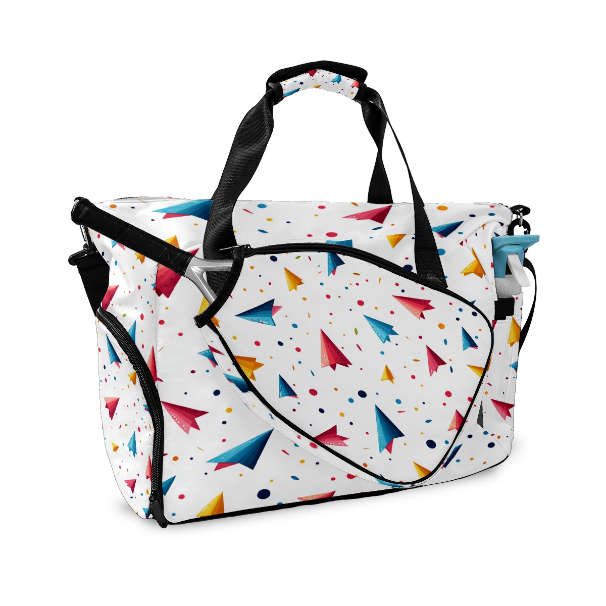 Lightweight Pickleball Tote Bag with Large Capacity, Shoe Compartment, Large Paddle Storage, Water Bottle Holder & Fence Hook for Women & Men Colored Paper Airplane Pattern