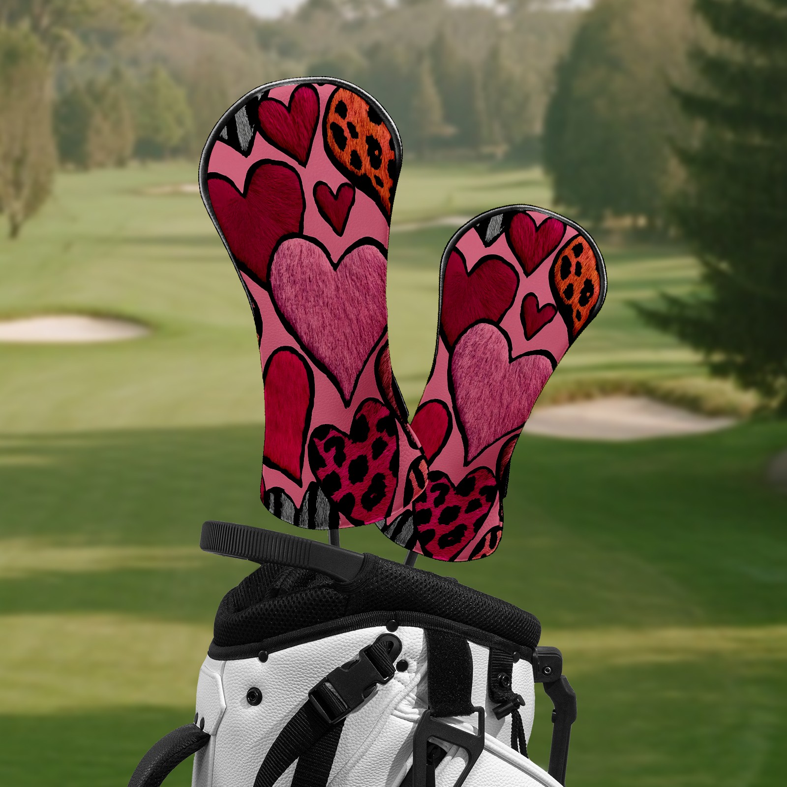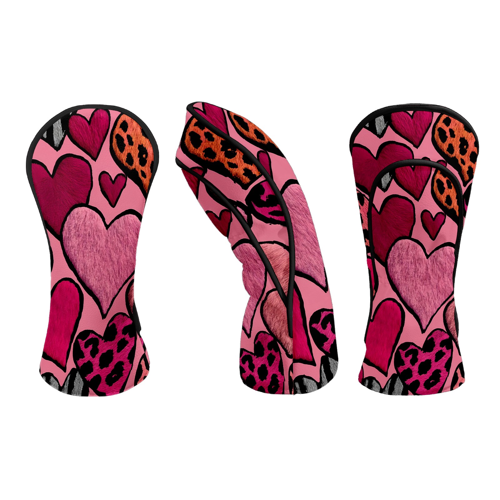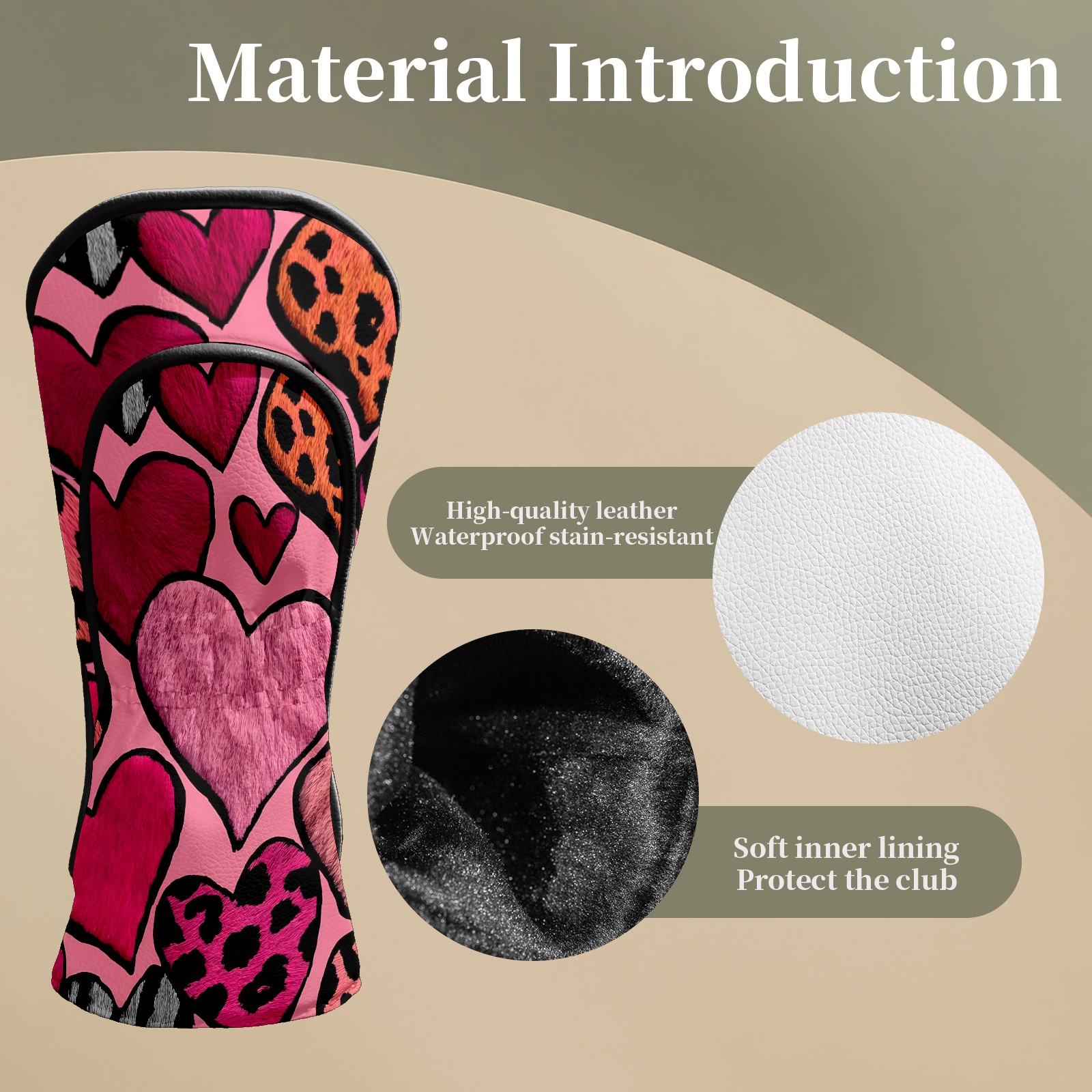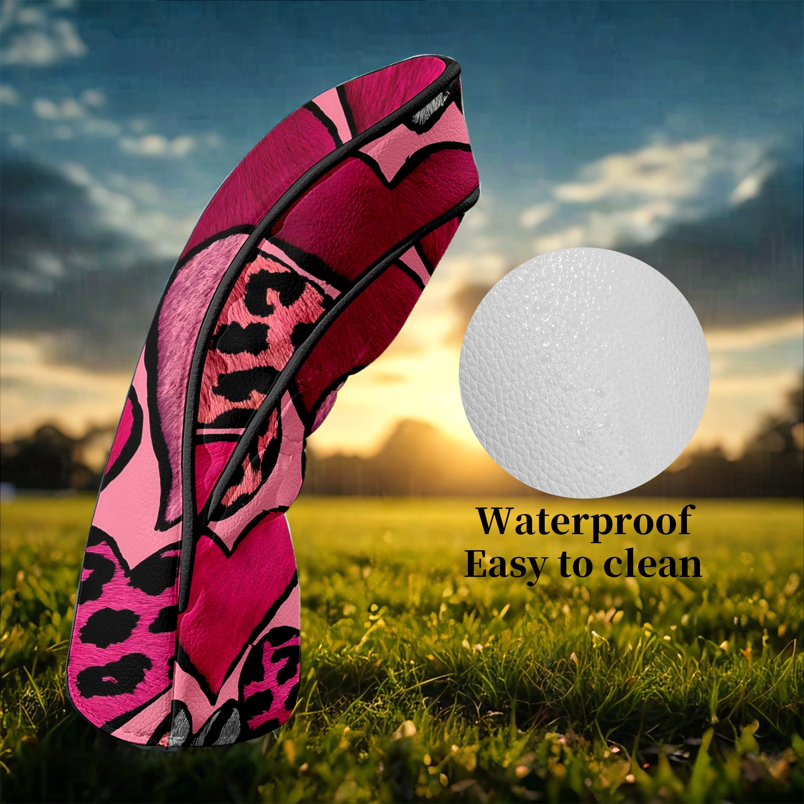 Golf Club Head Covers – Romantic Heart Pink with Soft Plush Lining, Waterproof PU Leather for Driver & Fairway Woods | Durable, No-Slip Elastic Fit | Novelty Gift for Men & Women