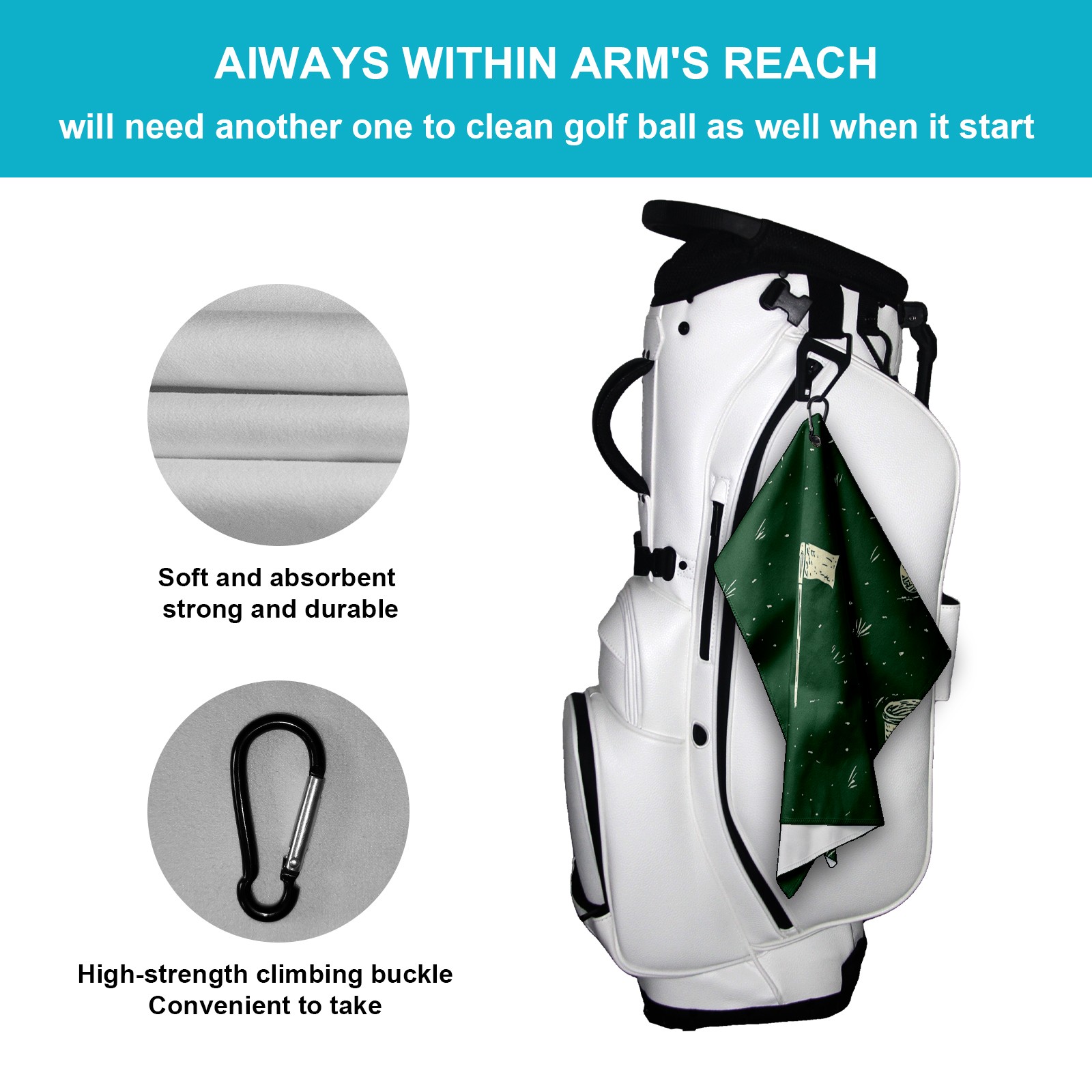 • <p>Designed to care for clubs and balls, this high performance golf towel is a compact and portable 15.7 in x 23.6 in size that cleans precisely without taking up space in your bag.&nbsp;</p> <p>The polyester material creates a dense cleaning network that absorbs dust and grass clippings and removes divot stains in a single wipe.&nbsp;</p> <p>Durable, absorbent fabric stays fluffy through multiple washes and dries quickly when hung, eliminating damp odors. The buckle clip design attaches to the side of the bag for easy access and natural air drying while walking, keeping the towel dry and efficient at all times.&nbsp;</p> <p>Whether it's wiping the ball before teeing off or cleaning the club face on the green side, it's a practical aid for golfers who want to keep their equipment looking fresh and new.</p>