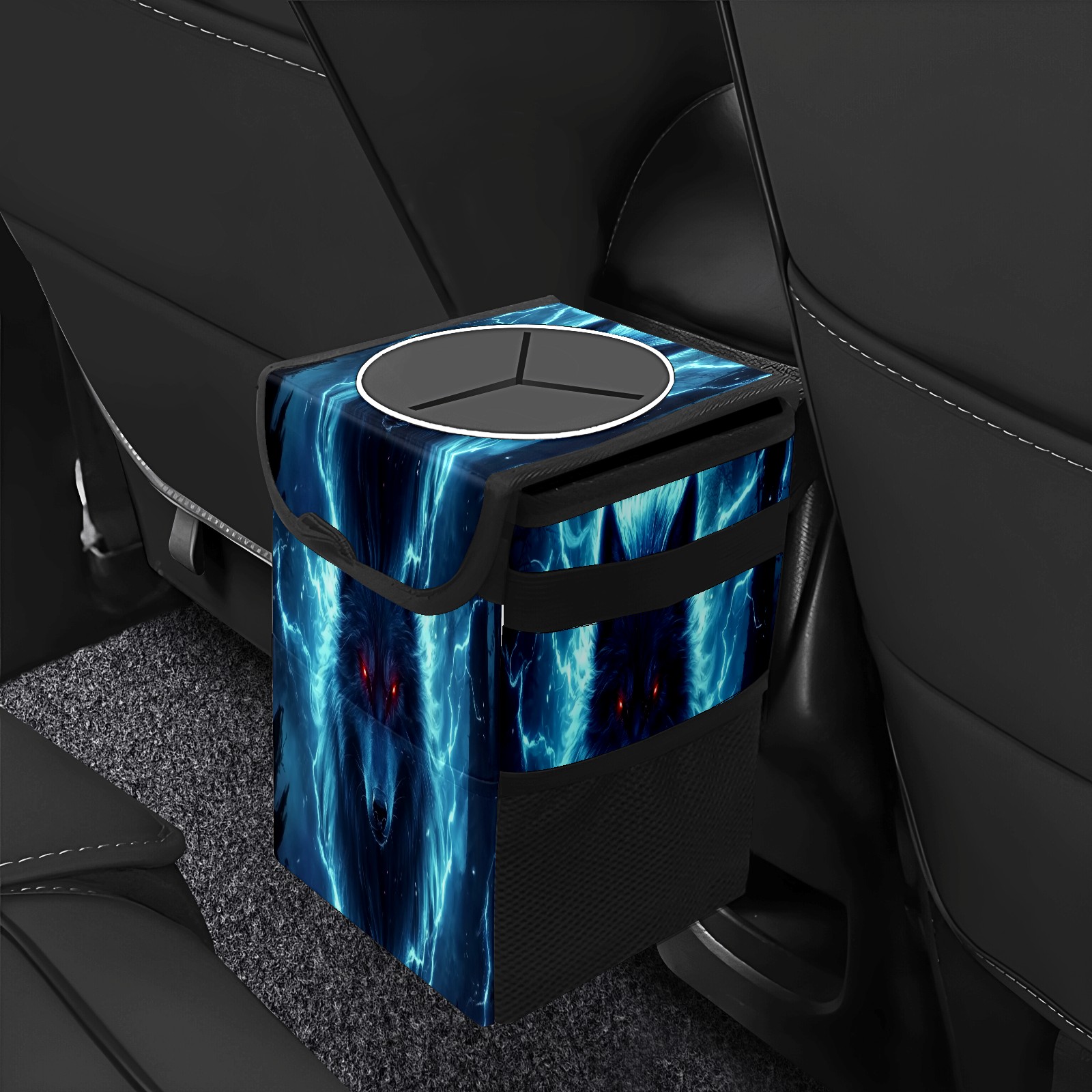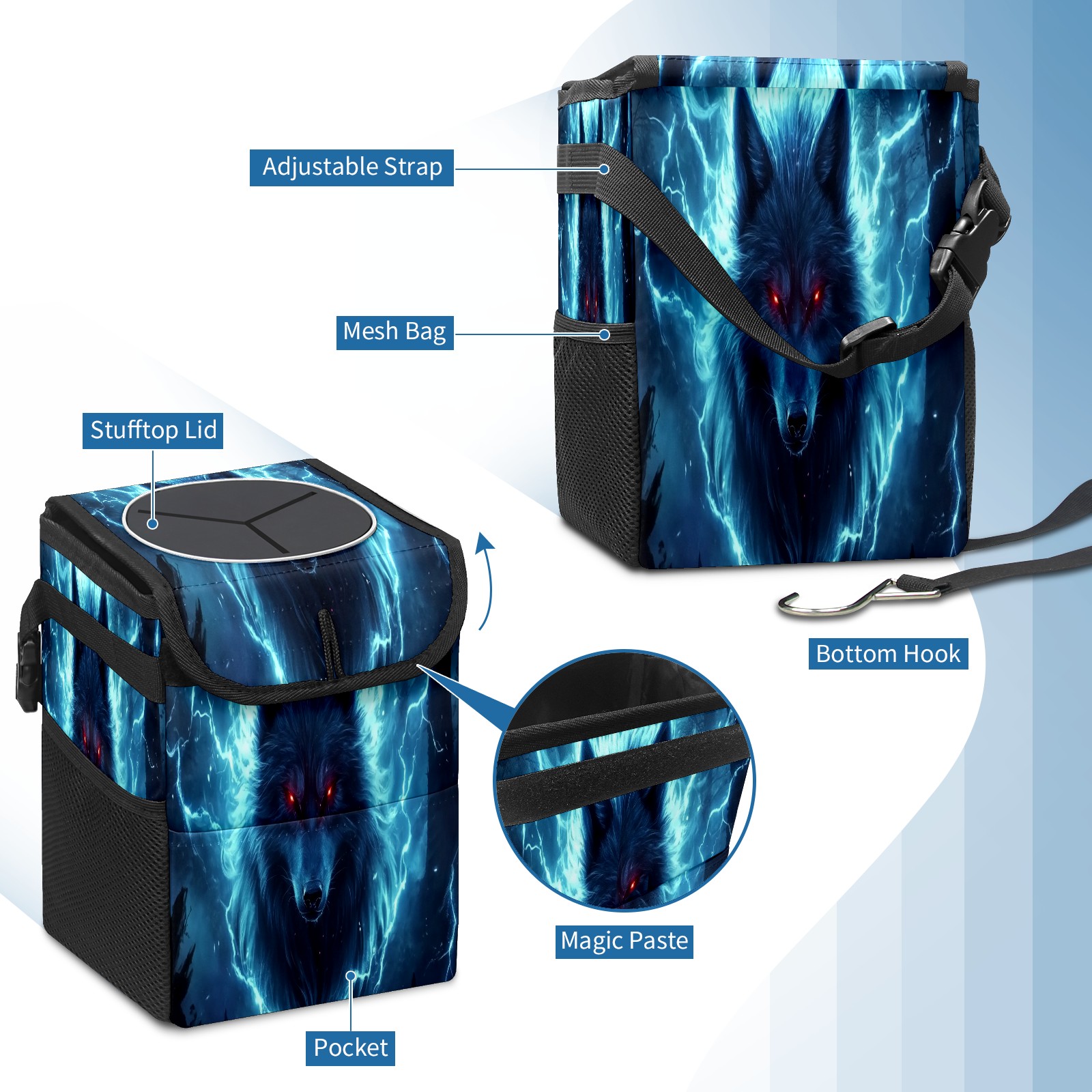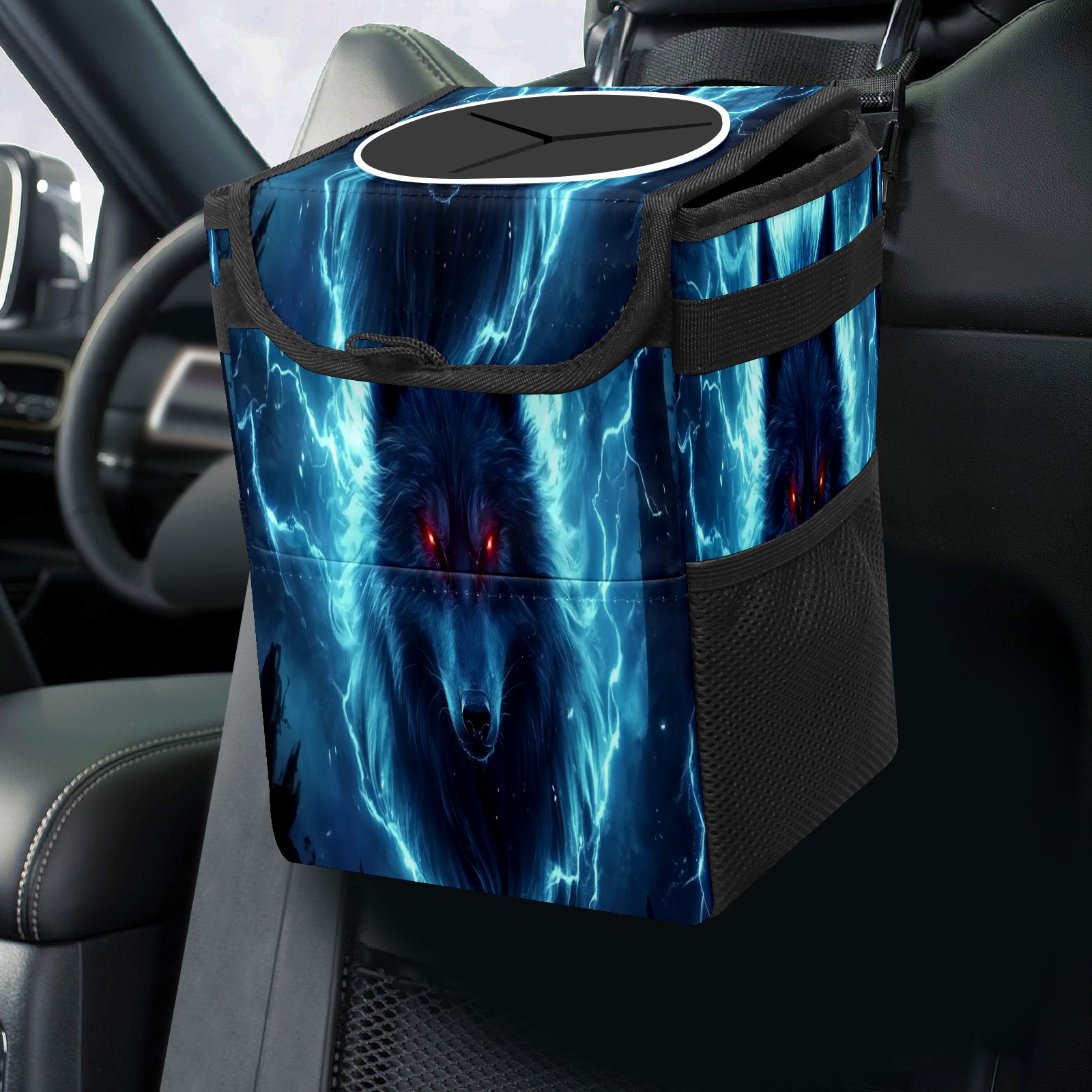Car Trash Can with Lid, Small Portable Hanging Automotive Garbage Bin for Vehicles, Leakproof Waste Bag Container for SUV Truck Van Interior Auto Travel Road Trips(Mystical Wolf)