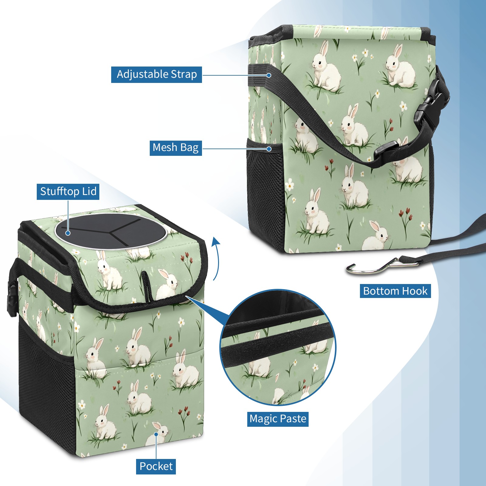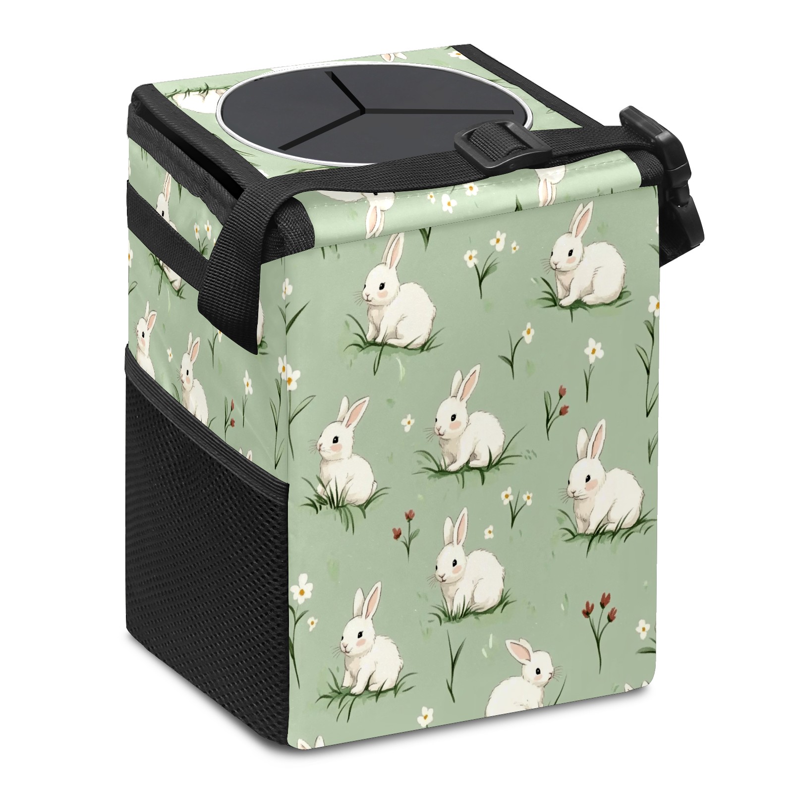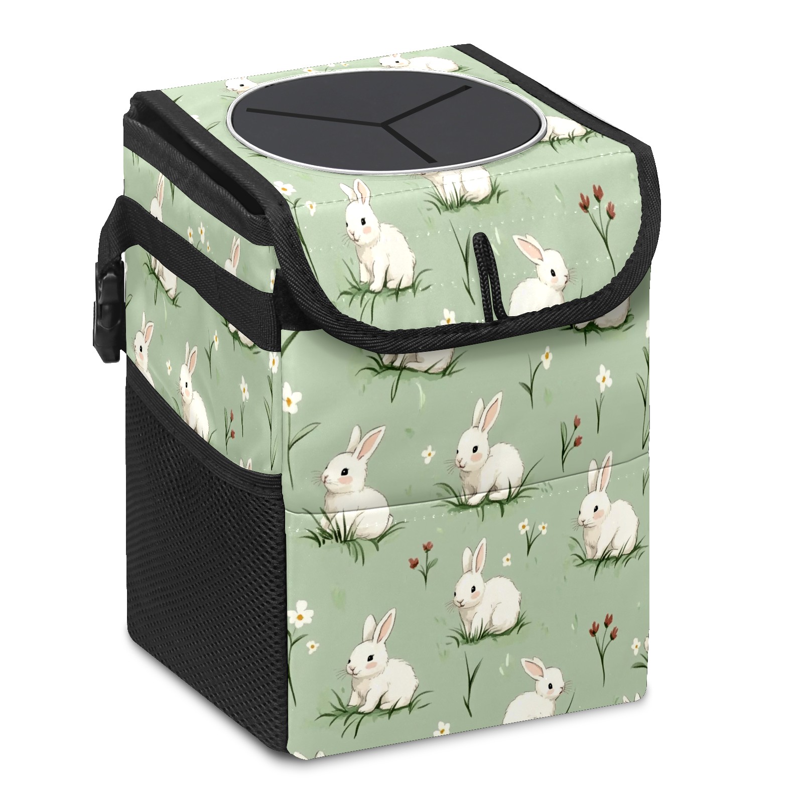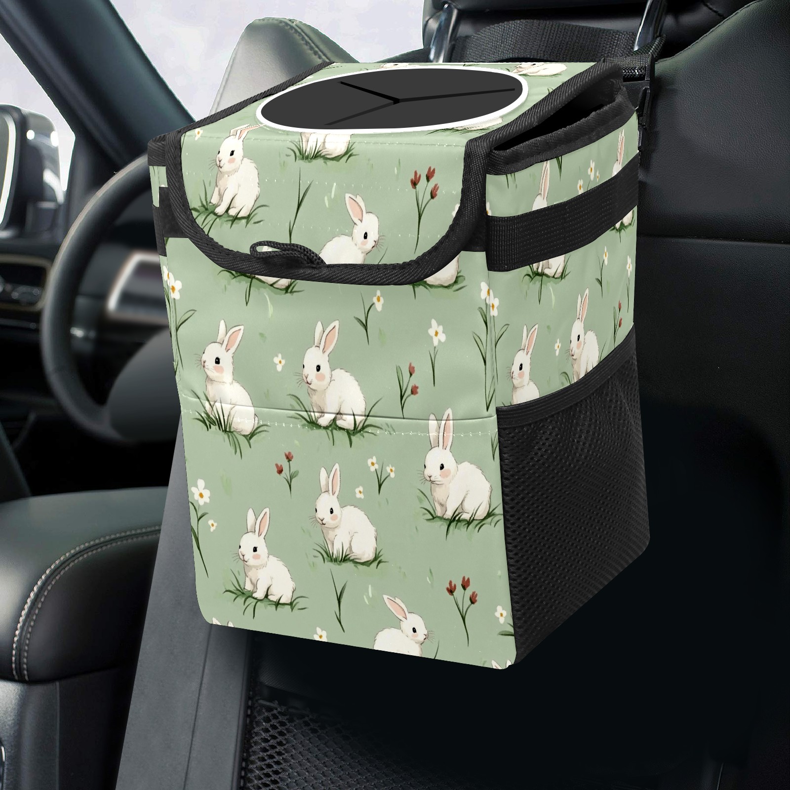 Car Trash Can with Lid, Small Portable Hanging Automotive Garbage Bin for Vehicles, Leakproof Waste Bag Container for SUV Truck Van Interior Auto Travel Road Trips(White Rabbits)