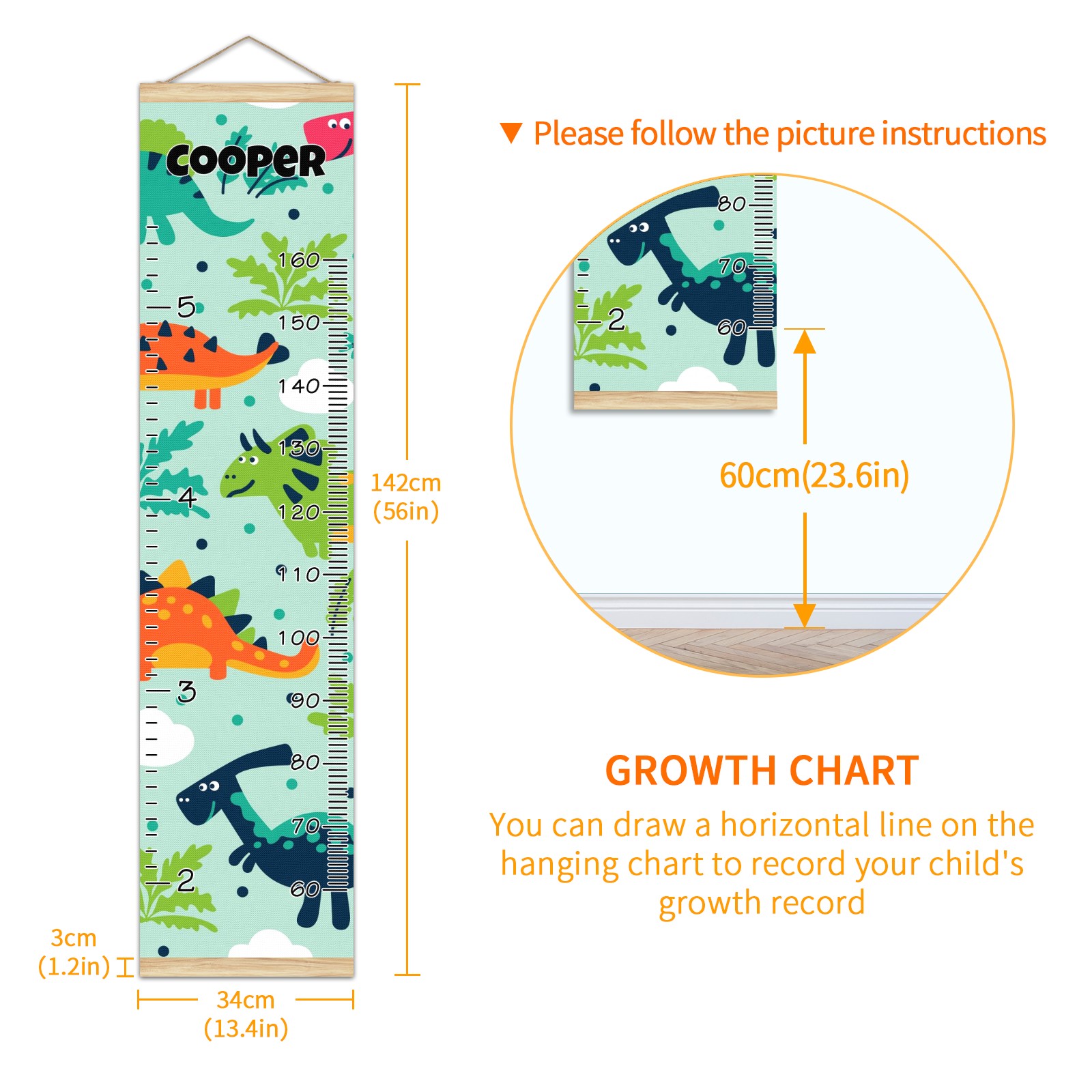 <p><b>Features:</b></p> <p>Rope for Hanging</p> <p>Material: Linen + Wood</p> <p>Dimensions: 13.4x56 inches</p> <p>Package Included: 1 * Baby Growth Chart</p> <p><b>Baby height growth chart can be used anywhere</b></p> <p>Ideal for kids nursery decoration, kids bedroom, interior walls or windows, playroom, living room, homedecoration.Add name and make the growth chart special!</p> <p><b>Easy to fold and carry</b></p> <p>With rope at the top of the growth chart, it is easy to install and remove.You can fold it and unfold any time any where.</p> <p><b>Perfect Gift Idea for Kids</b></p> <p>Environmental and non-toxic for kids use, it must be a perfect gift for baby, kids, girls, and boys.This is a best choice for your friend who have kids or baby as a popular gift.</p> <p><b>Easy to read</b></p> <p>Measurement accrate with 2 scales, Centimeters and feet. The letters are big enough, very easy to read.</p> <p><b>60cm(23.6inch) Over Ground Design</b></p> <p>Not only can protect from dust and other damage, but also will not interfere in floor cleaning.</p>