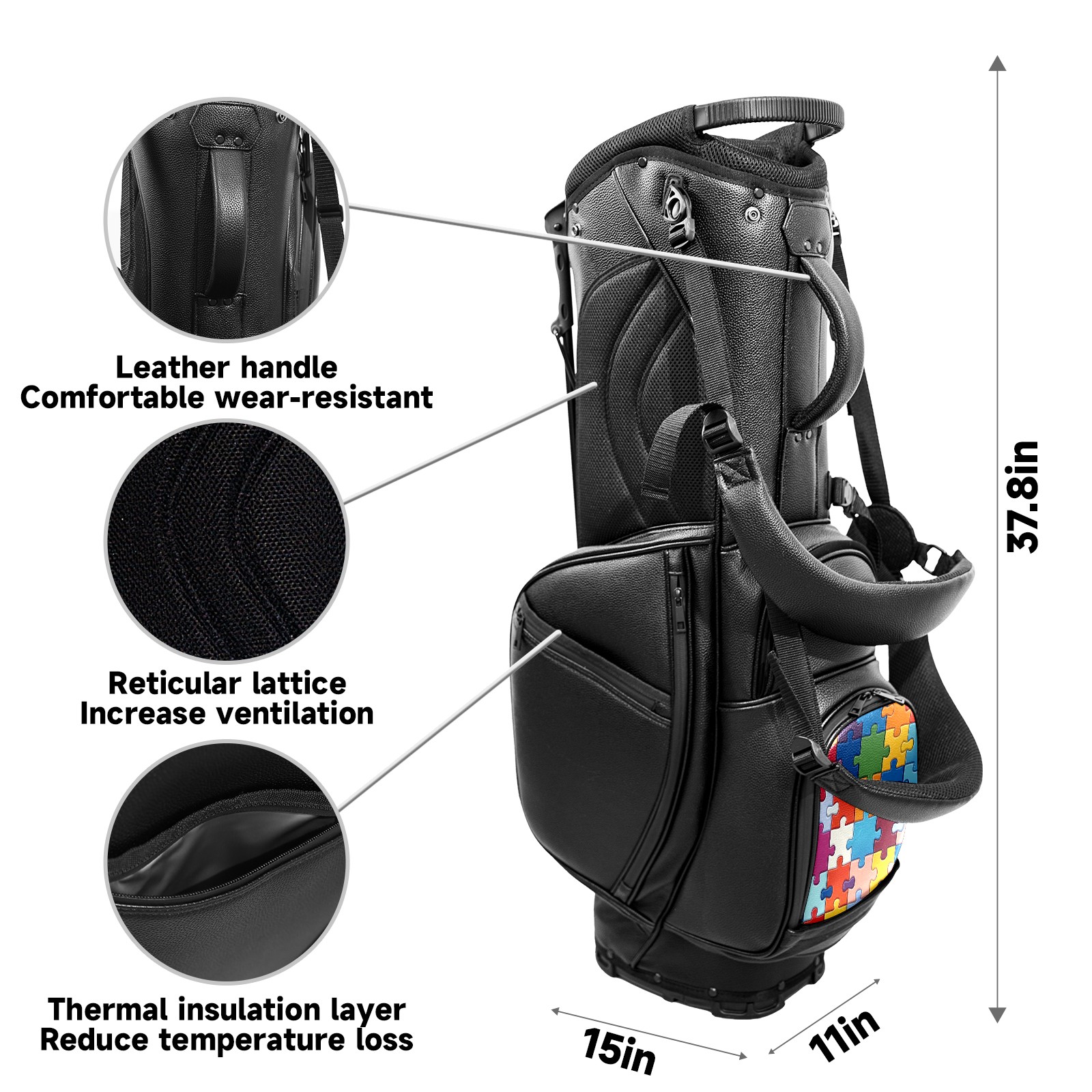 <p>This golf cart bag combines versatility with durability, providing comprehensive protection and convenient access for your clubs. The five-way top compartments provide strategic zoning for easily storing a variety of clubs and protecting them from impacts and wear. The PU fabric and sturdy plastic base combine premium quality with durability. The versatile storage system includes multiple zippered pockets and a separate cooler compartment for storing equipment, accessories, and drinks. The portable rear handle allows for easy transport. The ergonomic, padded shoulder straps are adjustable and removable to fit your shoulder and reduce weight. A built-in rain cover effectively keeps out moisture, ensuring your clubs stay dry and protected in wet weather. This is the ideal golf bag for your golfing adventure.<br></p>