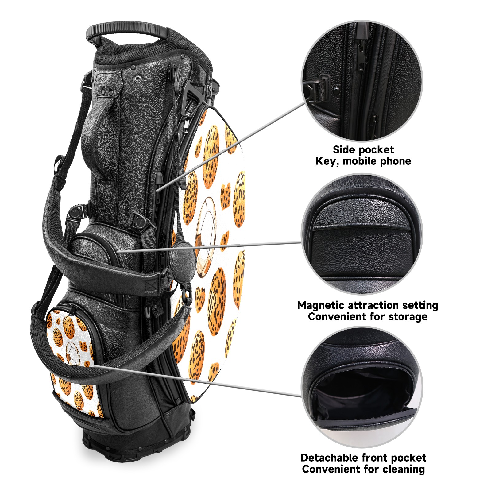 <p>This golf cart bag combines versatility with durability, providing comprehensive protection and convenient access for your clubs. The five-way top compartments provide strategic zoning for easily storing a variety of clubs and protecting them from impacts and wear. The PU fabric and sturdy plastic base combine premium quality with durability. The versatile storage system includes multiple zippered pockets and a separate cooler compartment for storing equipment, accessories, and drinks. The portable rear handle allows for easy transport. The ergonomic, padded shoulder straps are adjustable and removable to fit your shoulder and reduce weight. A built-in rain cover effectively keeps out moisture, ensuring your clubs stay dry and protected in wet weather. This is the ideal golf bag for your golfing adventure.<br></p>