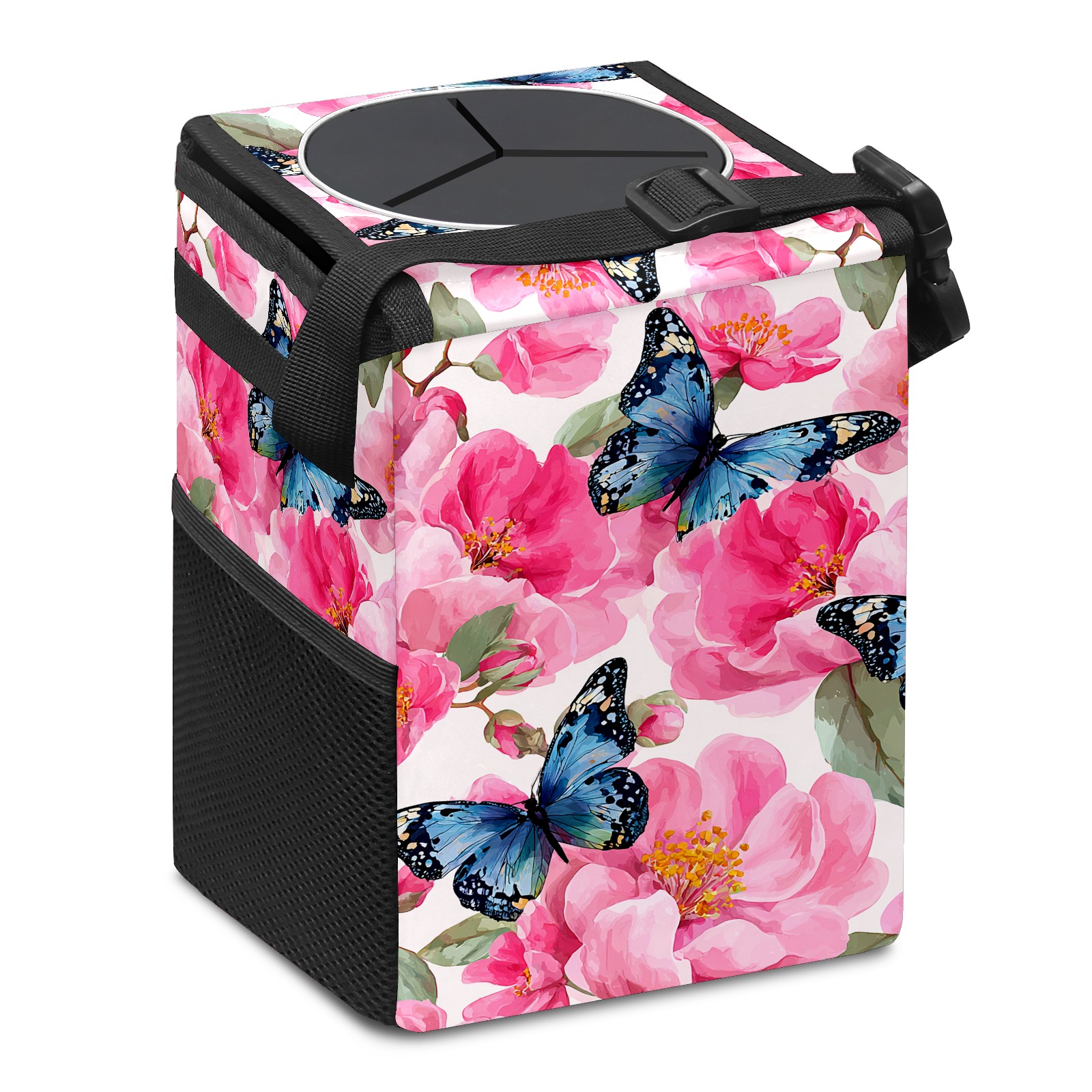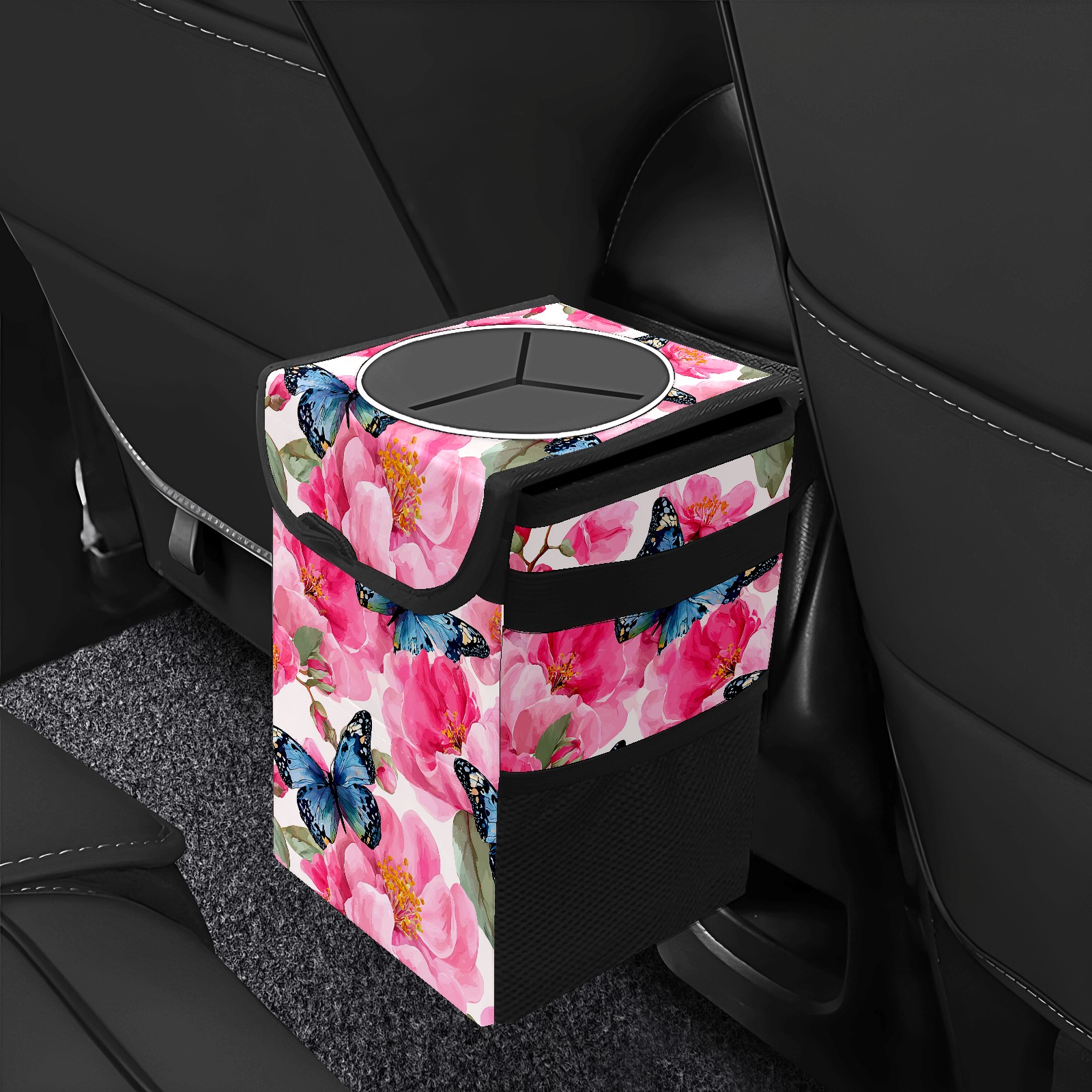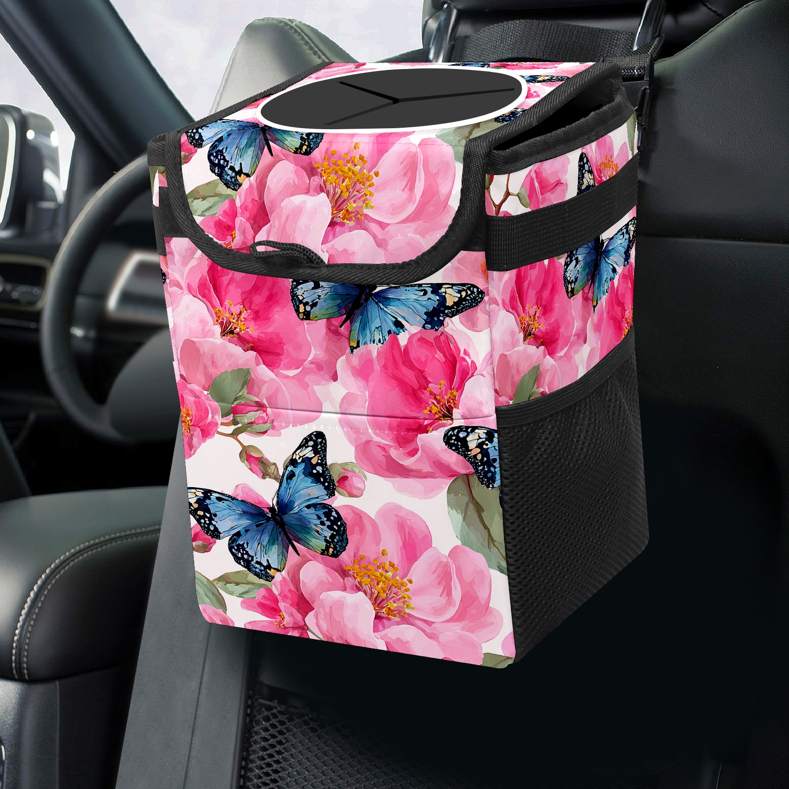 MSINMKOK Car Trash Bin with Lid Auto Garbage Bag Hanging for Back Seat - Leakproof Trash Can for Cars SUVs Trucks Vehicle Car Accessories (Pink Flowers Butterflies)