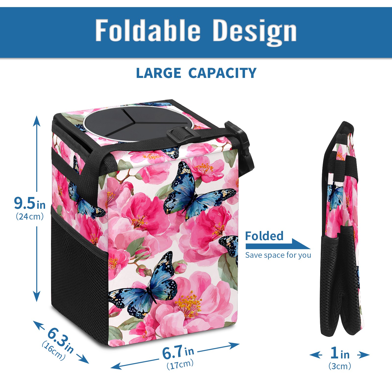 • <p>【FOLDABLE &amp; SPACE-SAVING】</p> <p>✔ Compact 9.5"×6.7"×6.3" size fits perfectly in any vehicle space.</p> <p>✔ Instantly folds flat when not in use - stores effortlessly under seats or in door pockets.</p> <p>【MULTI-FUNCTION ORGANIZER】</p> <p>✔ Large main compartment holds bottles, wrappers and tissues.</p> <p>✔ Additional pockets for wet wipes, masks or small accessories.</p> <p>【WATERPROOF &amp; LEAKPROOF】</p> <p>✔ Made with premium leak-proof polyester material.</p> <p>✔ Contains messy spills from drinks, snacks, and food. </p> <p>✔ Wipe-clean surface resists stains and eliminates odors.</p> <p>Package Includes:</p> <p>1× Car Trash Can</p>
