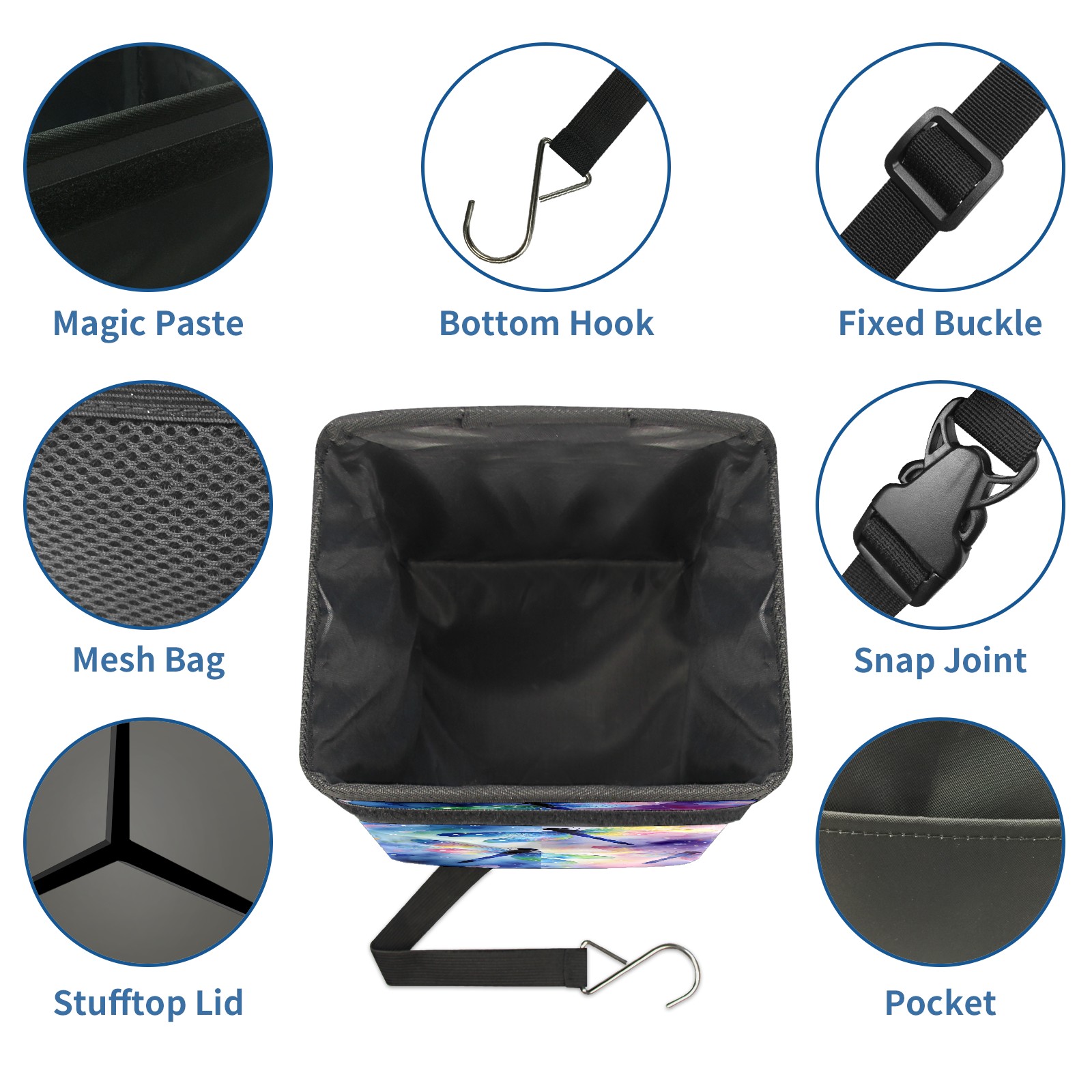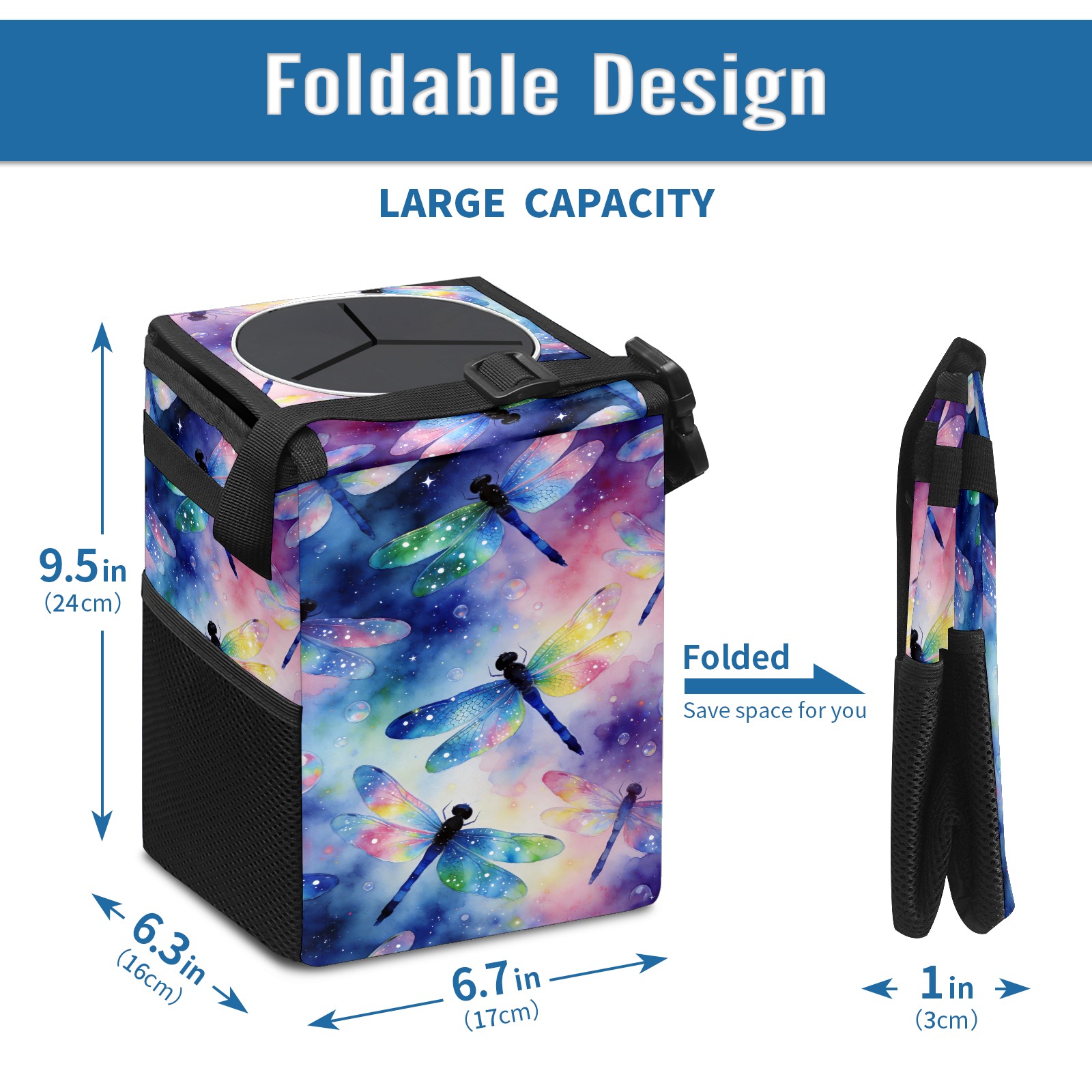 • <p>【FOLDABLE &amp; SPACE-SAVING】</p> <p>✔ Compact 9.5"×6.7"×6.3" size fits perfectly in any vehicle space.</p> <p>✔ Instantly folds flat when not in use - stores effortlessly under seats or in door pockets.</p> <p>【MULTI-FUNCTION ORGANIZER】</p> <p>✔ Large main compartment holds bottles, wrappers and tissues.</p> <p>✔ Additional pockets for wet wipes, masks or small accessories.</p> <p>【WATERPROOF &amp; LEAKPROOF】</p> <p>✔ Made with premium leak-proof polyester material.</p> <p>✔ Contains messy spills from drinks, snacks, and food. </p> <p>✔ Wipe-clean surface resists stains and eliminates odors.</p> <p>Package Includes:</p> <p>1× Car Trash Can</p>