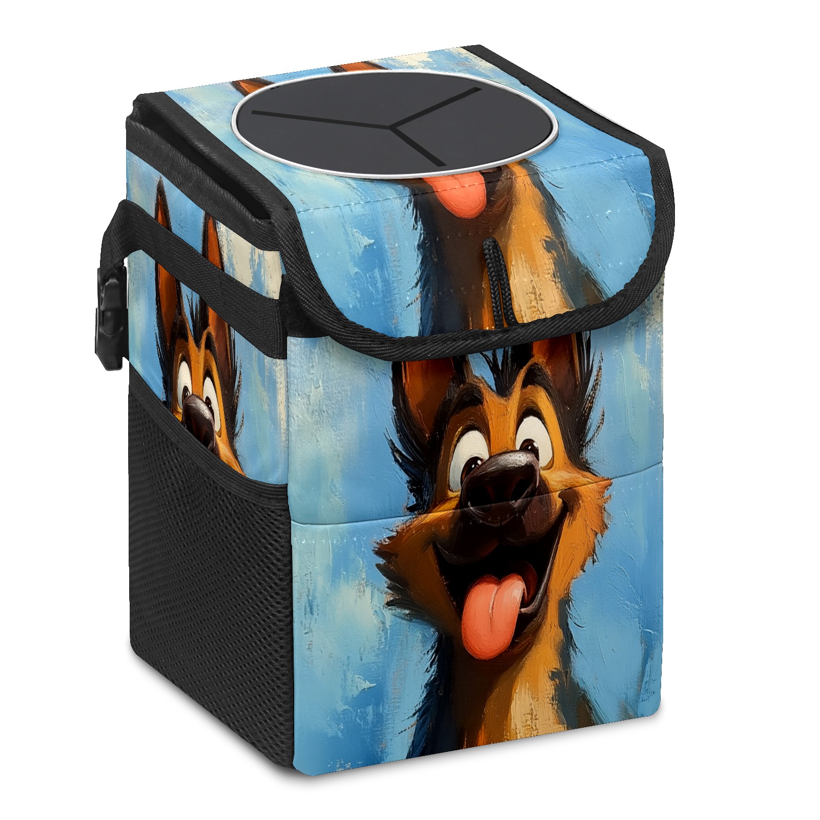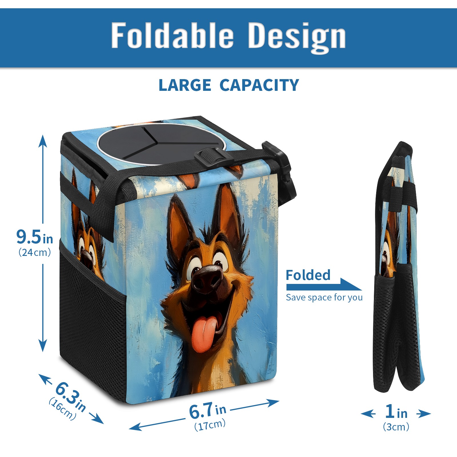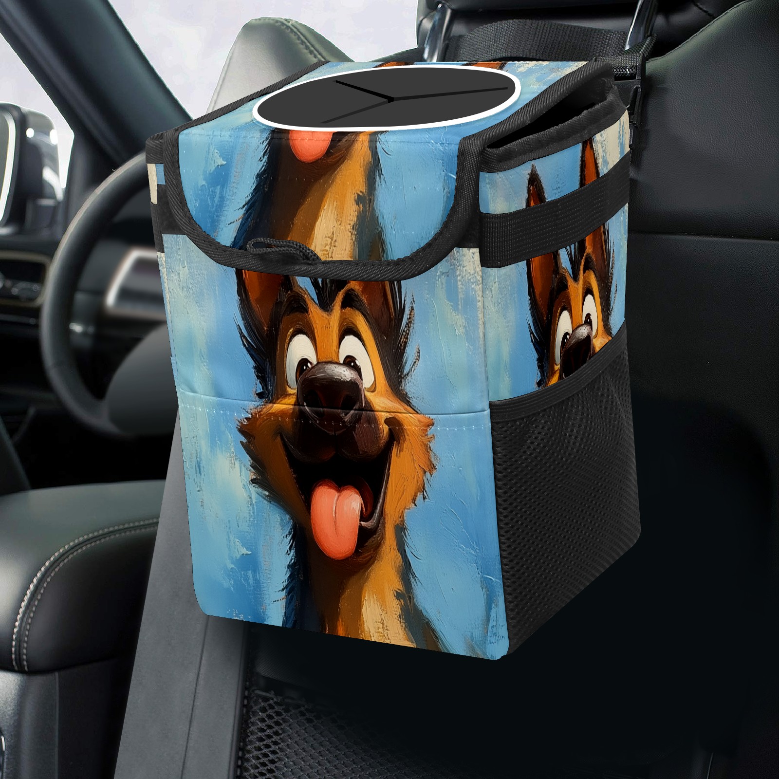 • <p>The foldable car trash can Made of durable twill fabric and webbing with full printing, it measures 9.5x6.7x6.3 in to hold tissues, wrappers, bottles, and wet waste with an inner garbage bag. Features side mesh pockets and a front pouch for snacks, phones, and small items. Equipped with an adjustable strap (for headrest/armrest) and elastic hooks (for seat bottom) for double stability, minimizes shaking while driving. Foldable design saves space when not in use, easy to clean by hand—avoid prolonged sun exposure. A versatile organizer for a tidy in-car life!<br></p>