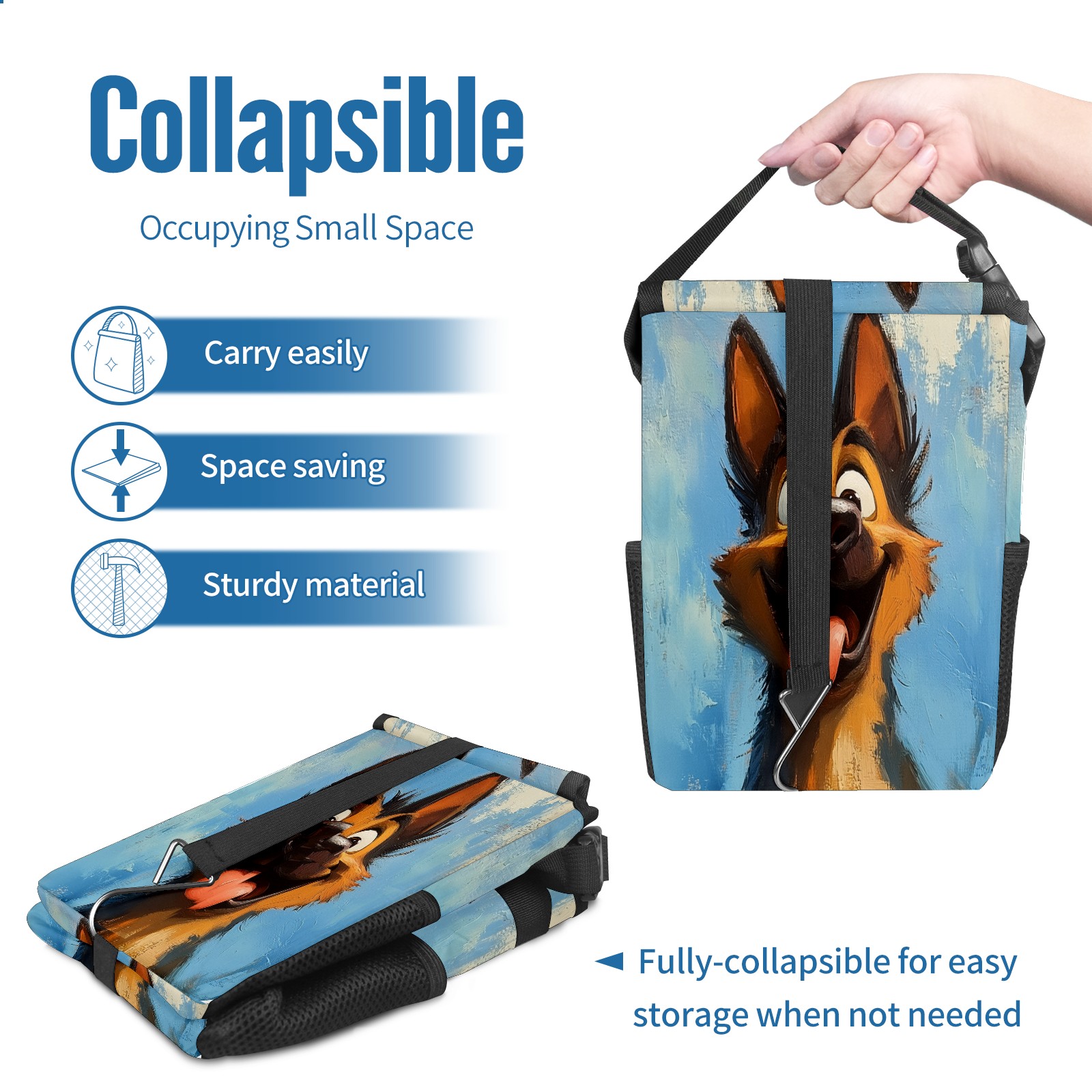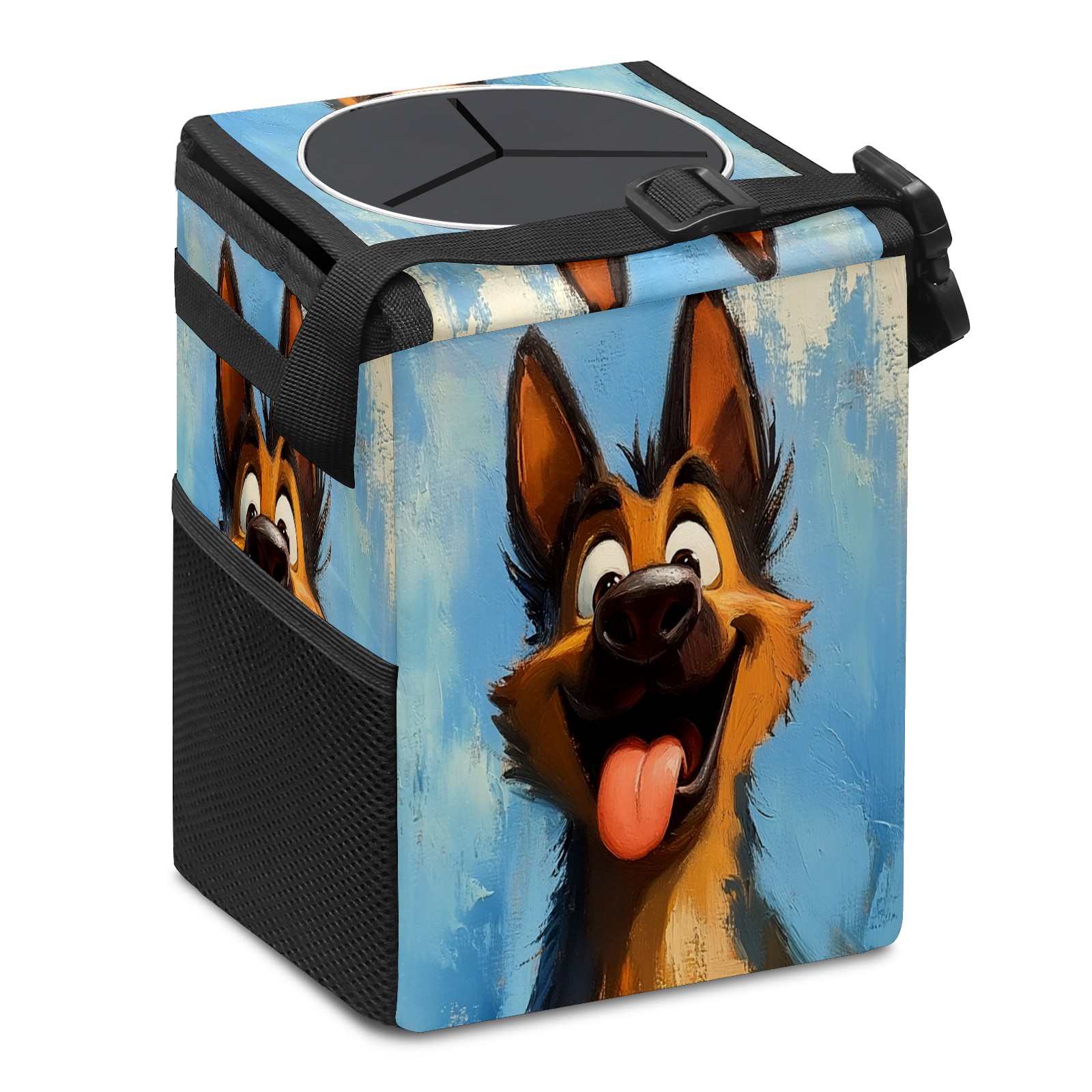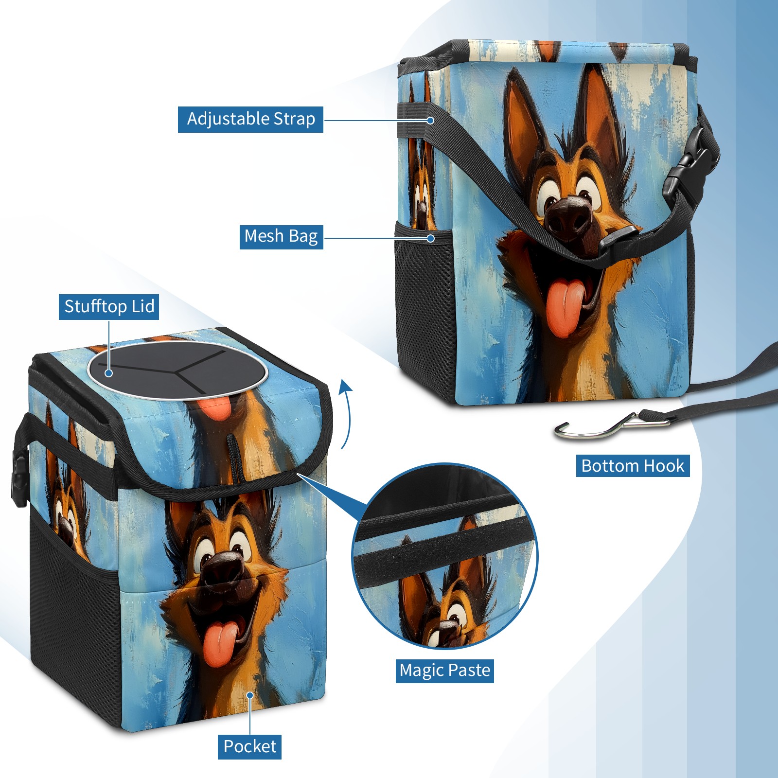 • <p>The foldable car trash can Made of durable twill fabric and webbing with full printing, it measures 9.5x6.7x6.3 in to hold tissues, wrappers, bottles, and wet waste with an inner garbage bag. Features side mesh pockets and a front pouch for snacks, phones, and small items. Equipped with an adjustable strap (for headrest/armrest) and elastic hooks (for seat bottom) for double stability, minimizes shaking while driving. Foldable design saves space when not in use, easy to clean by hand—avoid prolonged sun exposure. A versatile organizer for a tidy in-car life!<br></p>