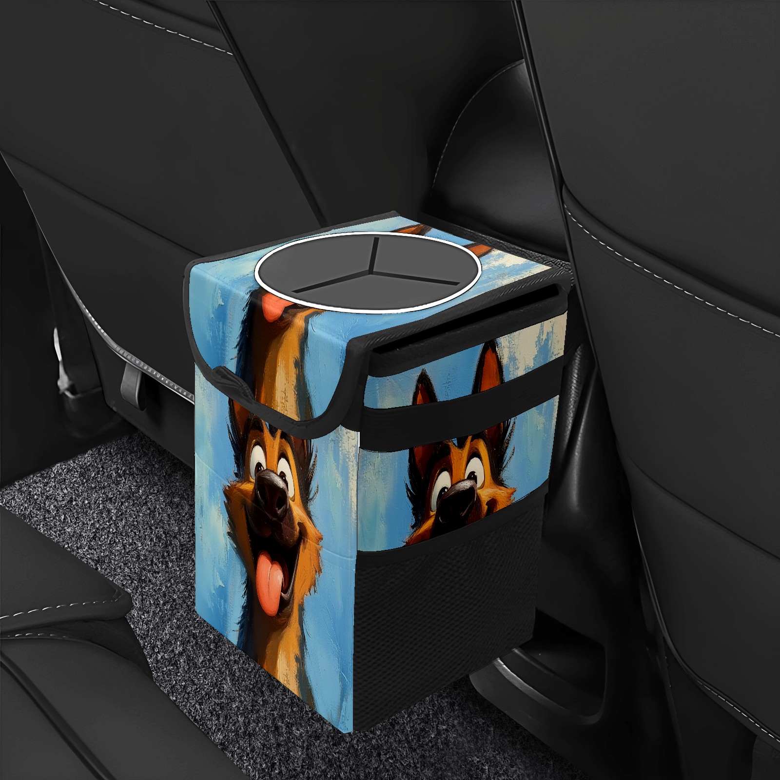 <p>The foldable car trash can Made of durable twill fabric and webbing with full printing, it measures 9.5x6.7x6.3 in to hold tissues, wrappers, bottles, and wet waste with an inner garbage bag. Features side mesh pockets and a front pouch for snacks, phones, and small items. Equipped with an adjustable strap (for headrest/armrest) and elastic hooks (for seat bottom) for double stability, minimizes shaking while driving. Foldable design saves space when not in use, easy to clean by hand—avoid prolonged sun exposure. A versatile organizer for a tidy in-car life!<br></p>