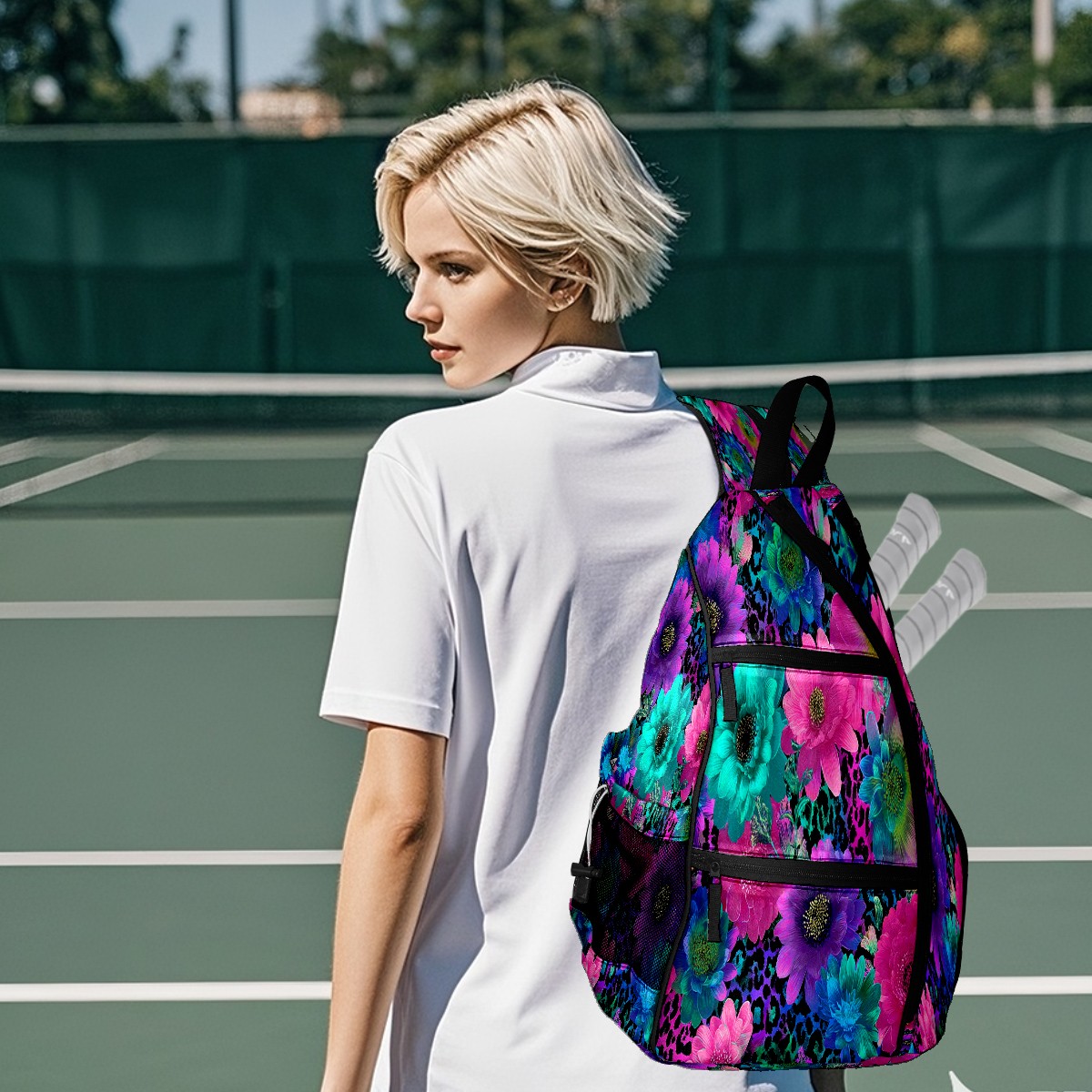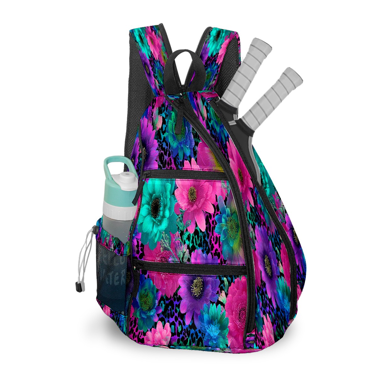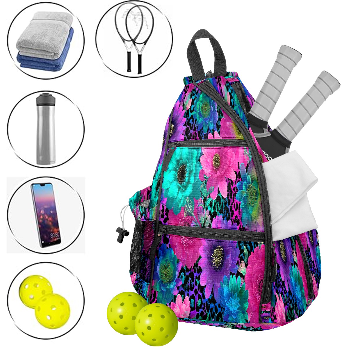 Counullo Floral Multicolor 3-in-1 Premium Nylon Pickleball Backpack, Convertible Shoulder & Crossbody Bag for Women & Men, Holds 2-4 Paddles & Sports Gear
