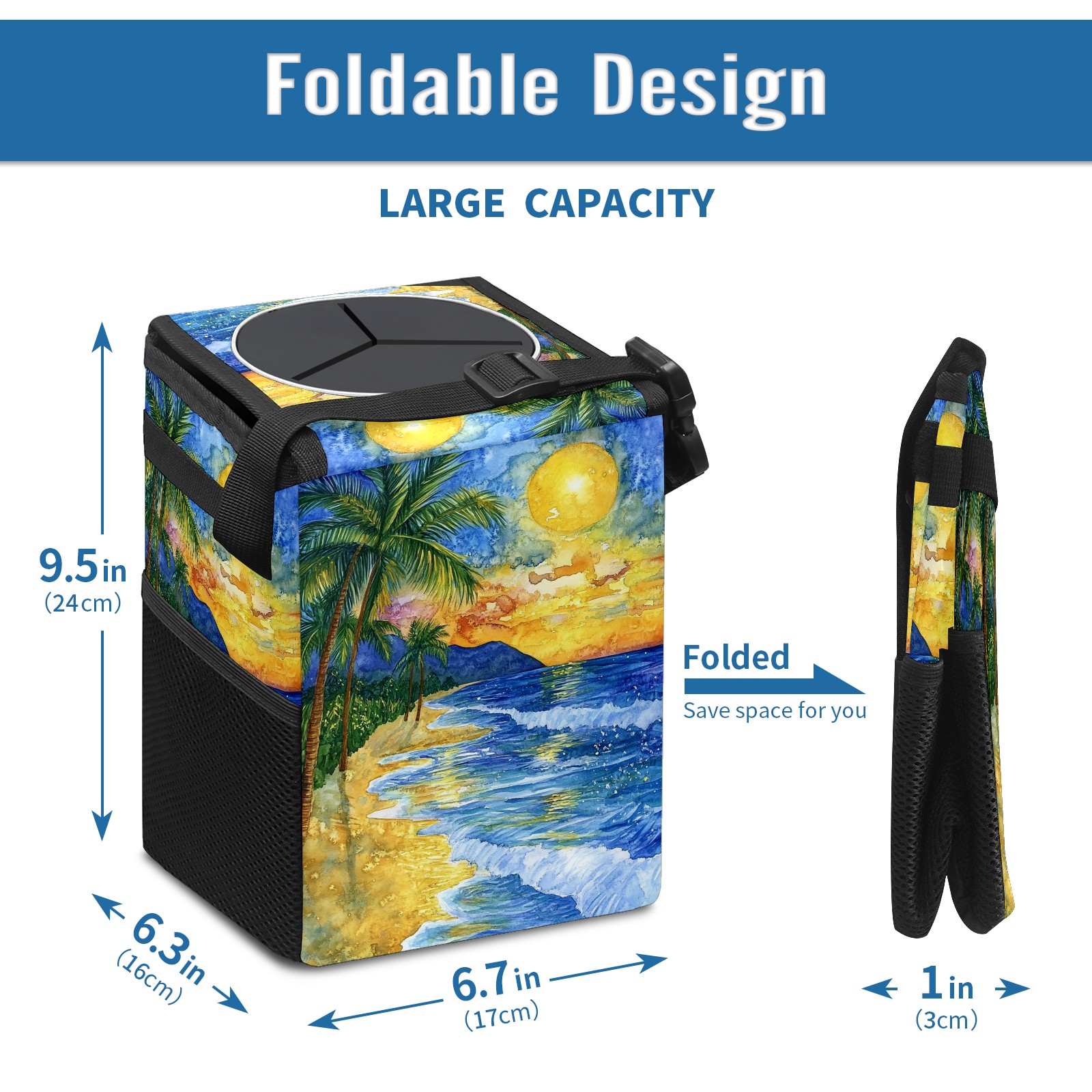 • <p>【FOLDABLE &amp; SPACE-SAVING】</p> <p>✔ Compact 9.5"×6.7"×6.3" size fits perfectly in any vehicle space.</p> <p>✔ Instantly folds flat when not in use - stores effortlessly under seats or in door pockets.</p> <p>【MULTI-FUNCTION ORGANIZER】</p> <p>✔ Large main compartment holds bottles, wrappers and tissues.</p> <p>✔ Additional pockets for wet wipes, masks or small accessories.</p> <p>【WATERPROOF &amp; LEAKPROOF】</p> <p>✔ Made with premium leak-proof polyester material.</p> <p>✔ Contains messy spills from drinks, snacks, and food. </p> <p>✔ Wipe-clean surface resists stains and eliminates odors.</p> <p>Package Includes:</p> <p>1× Car Trash Can</p>