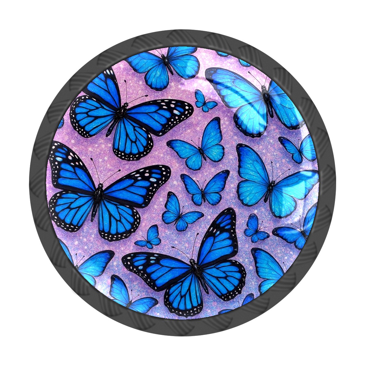 4 Pack Cabinet Knobs Blue Butterflies Drawer Pulls Crystal Glass Round Knobs Handles for Dressers Drawer Bathroom Kitchen Cupboards Wardrobes Hardware Furniture Knobs
