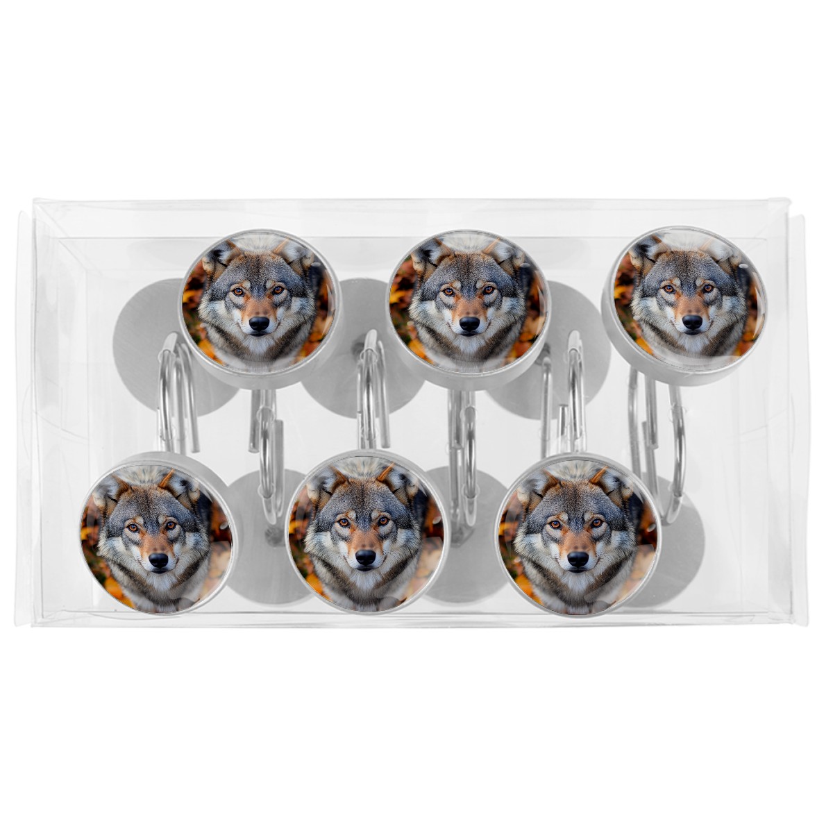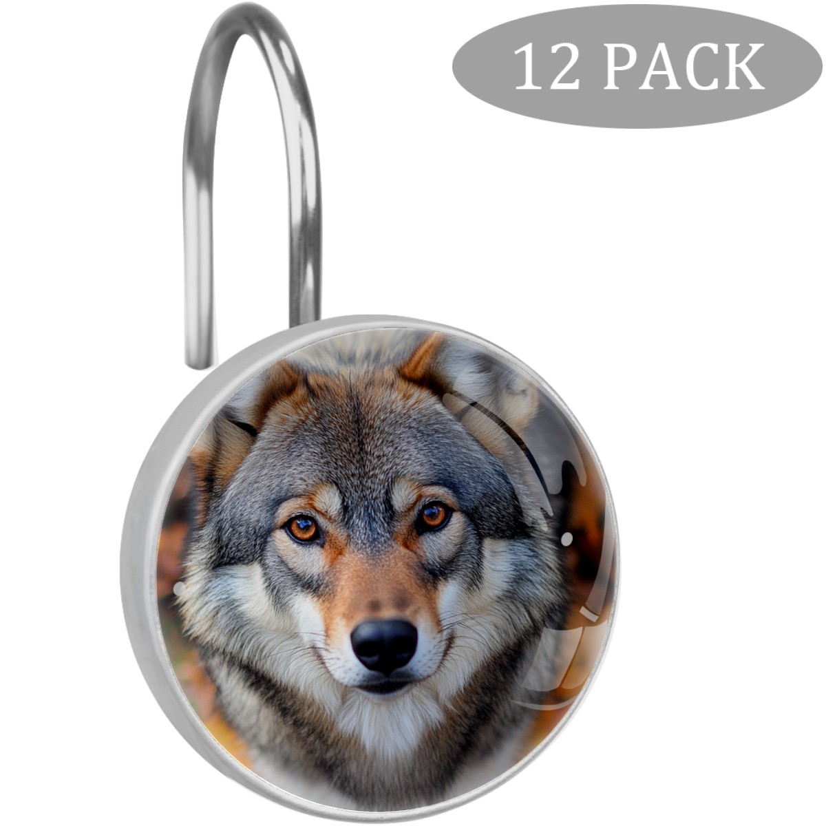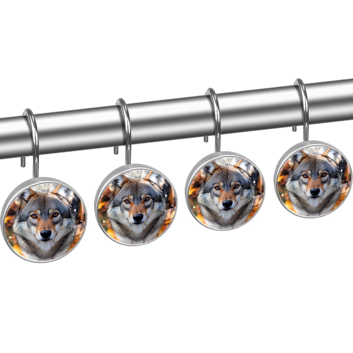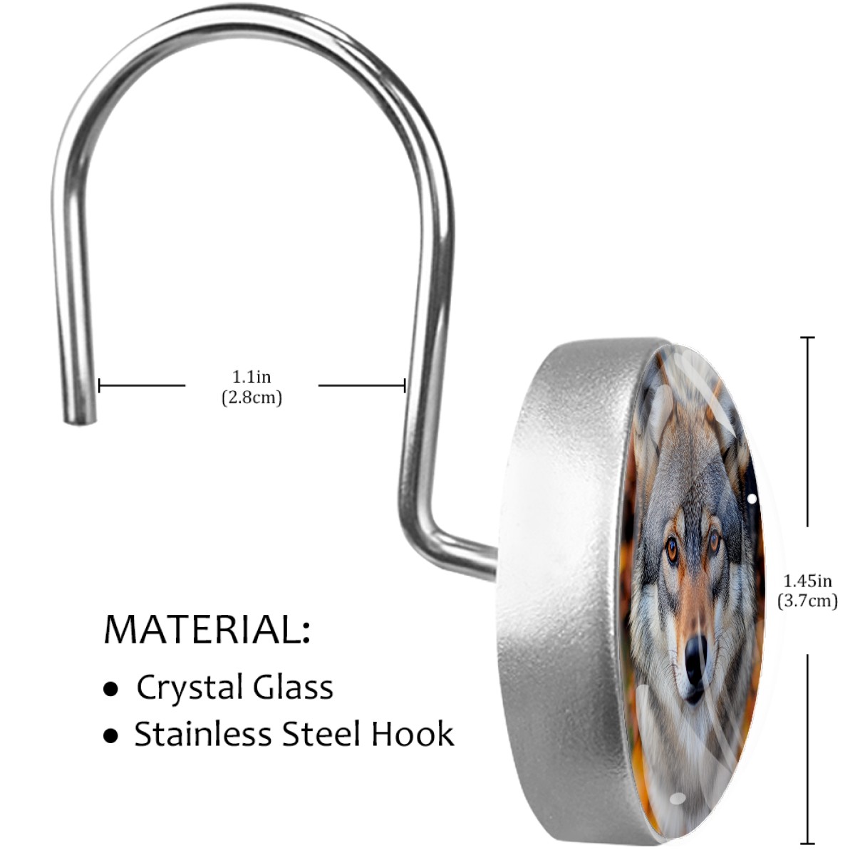 12 PCS Shower Curtain Hooks Decorative Gray Wolf Autumn Leaves Crystal Glass Shower Rings for Bathroom Curtain Stainless Steel Resin Rustproof Shower Hooks