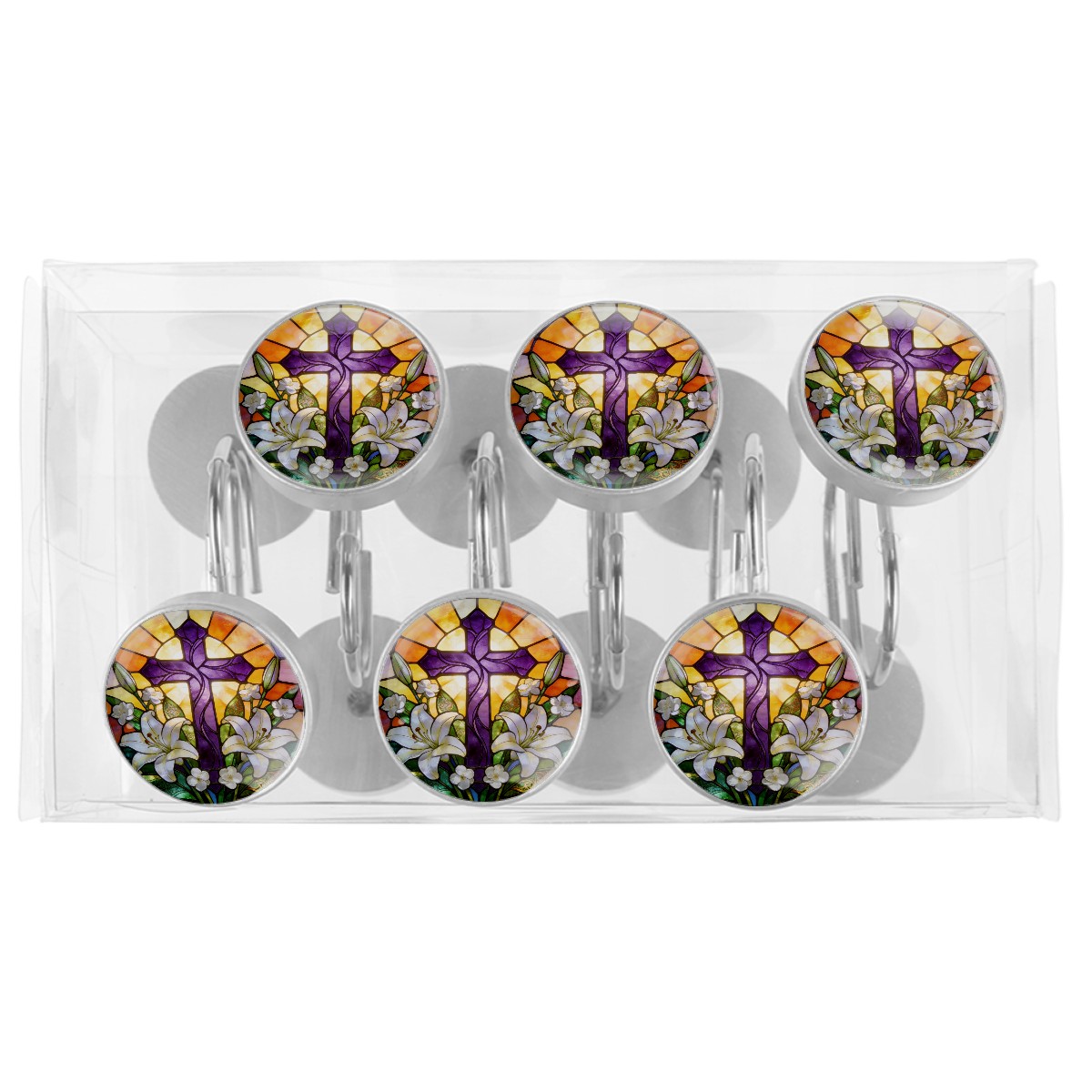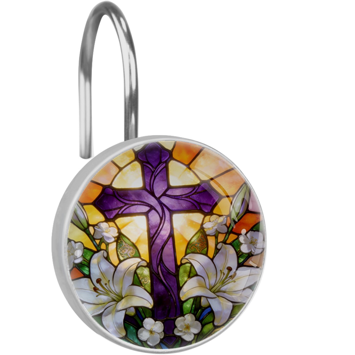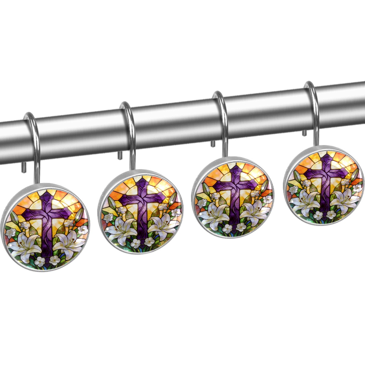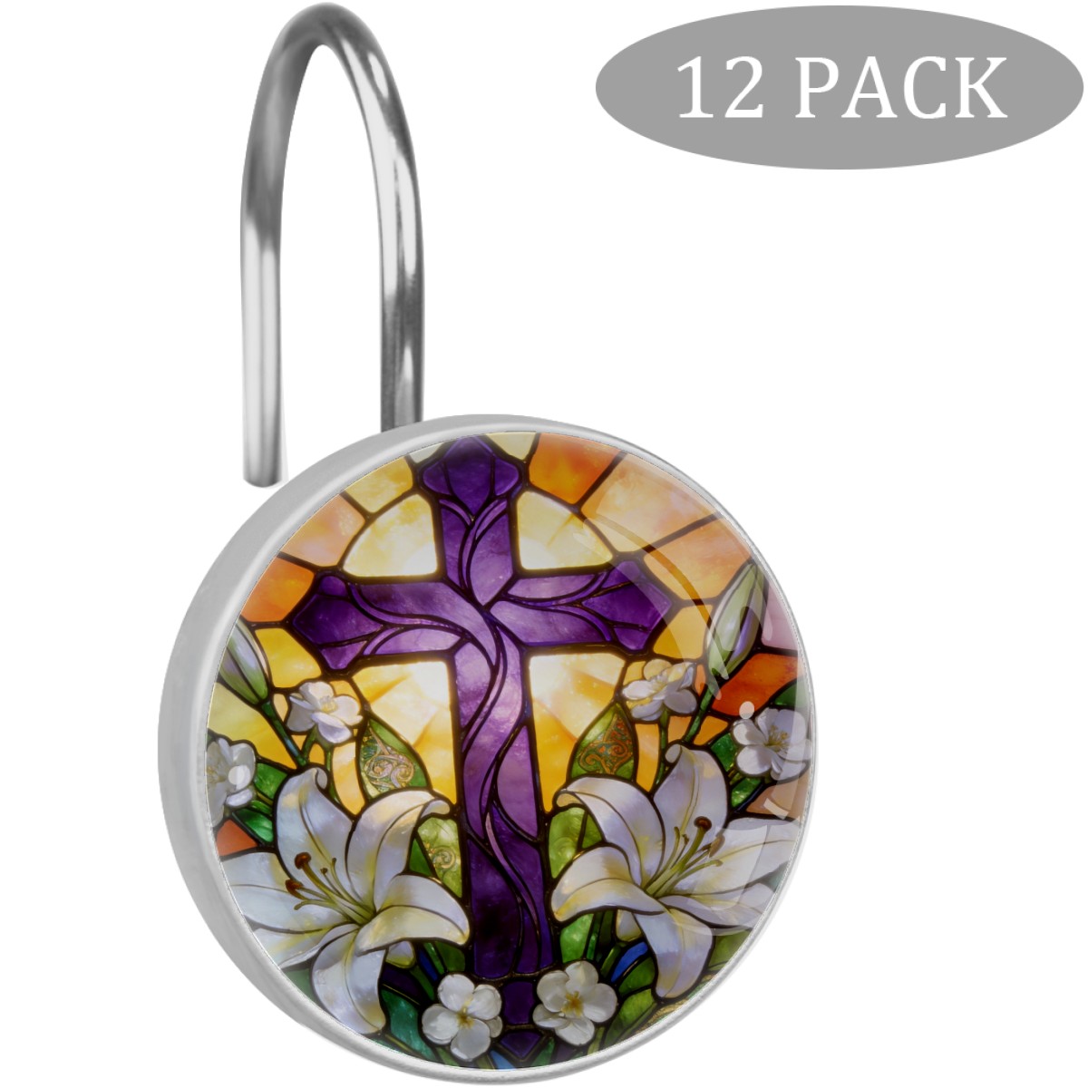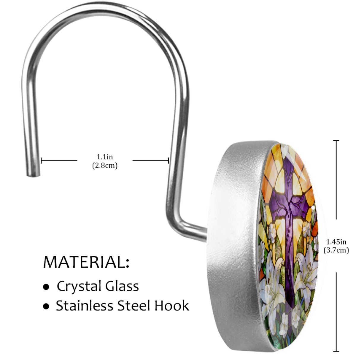12 PCS Shower Curtain Hooks Decorative Cross Lily Flowers Crystal Glass Shower Rings for Bathroom Curtain Stainless Steel Resin Rustproof Shower Hooks