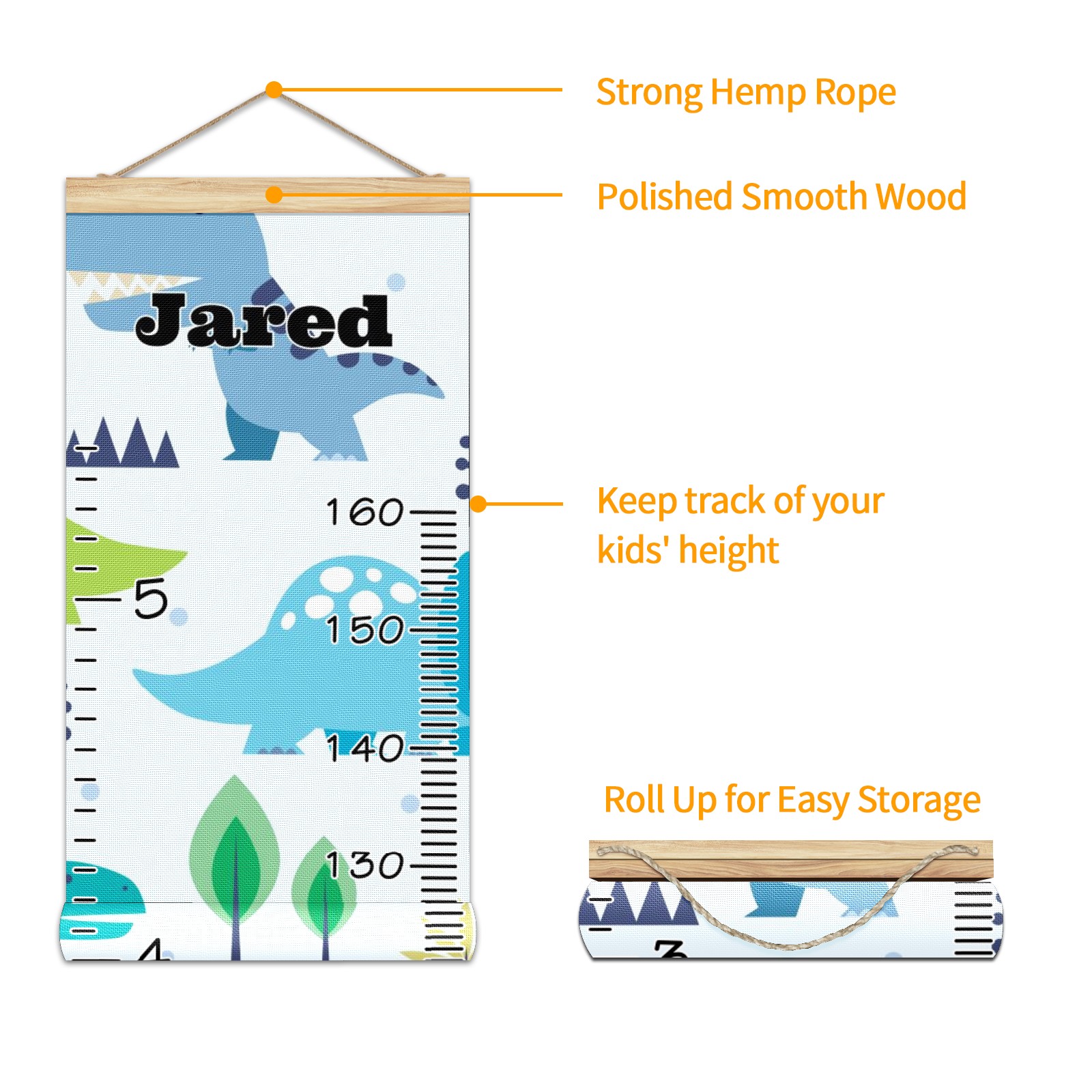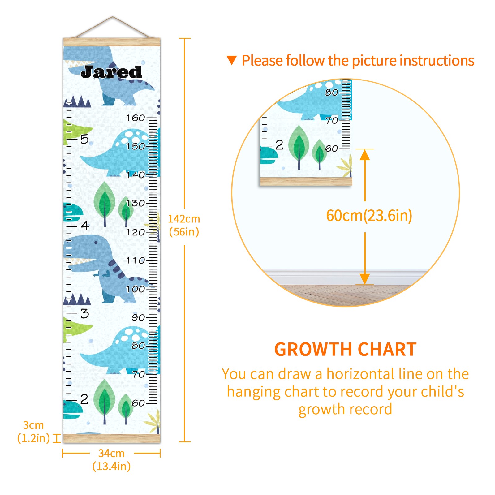 Personalized Kids Name Growth Chart Ruler for Wall Wood Frame Canvas Height Measure Chart 13.4x56 in Hanging Growth Chart Cute Dinosaur1.21 Boys Girls Room Decor
