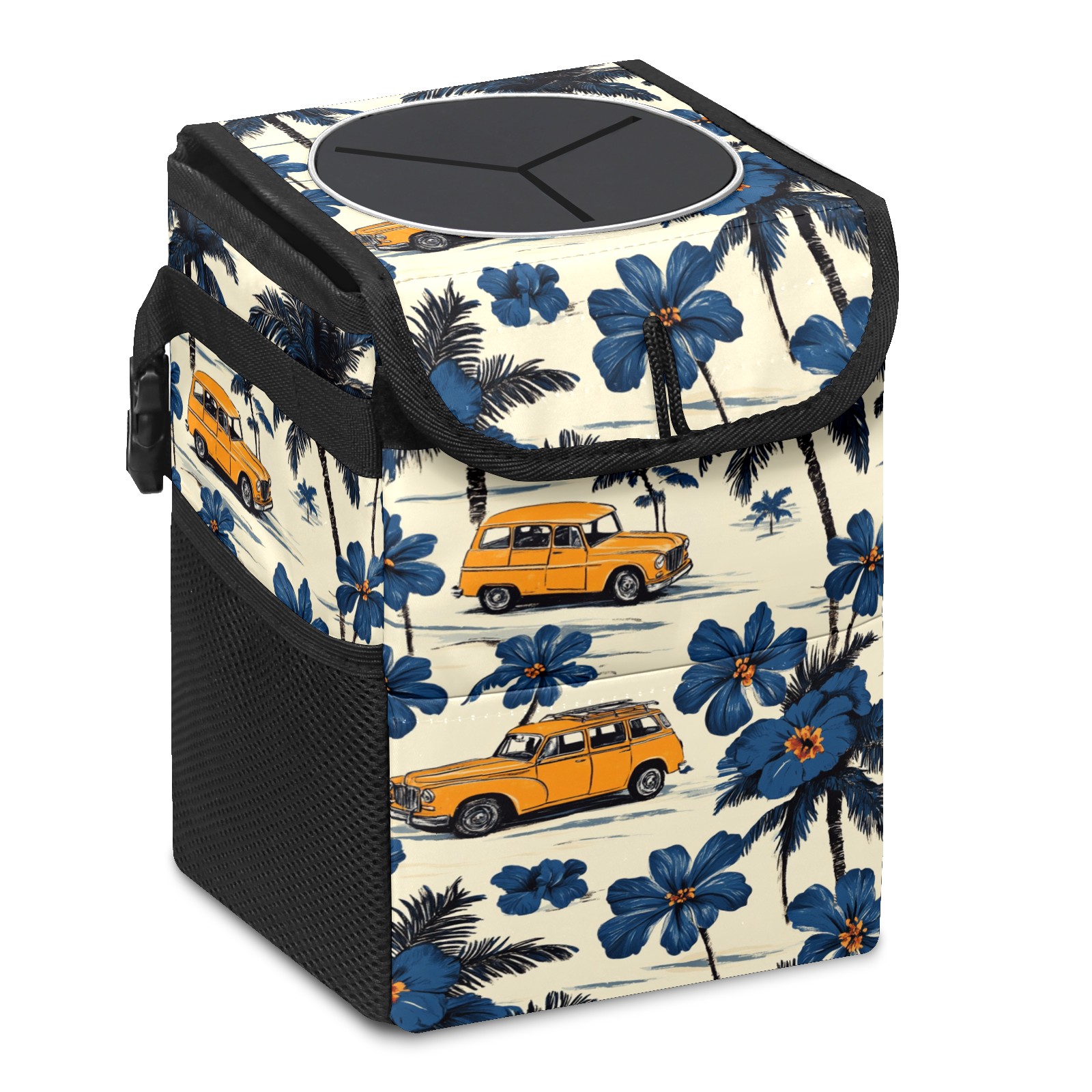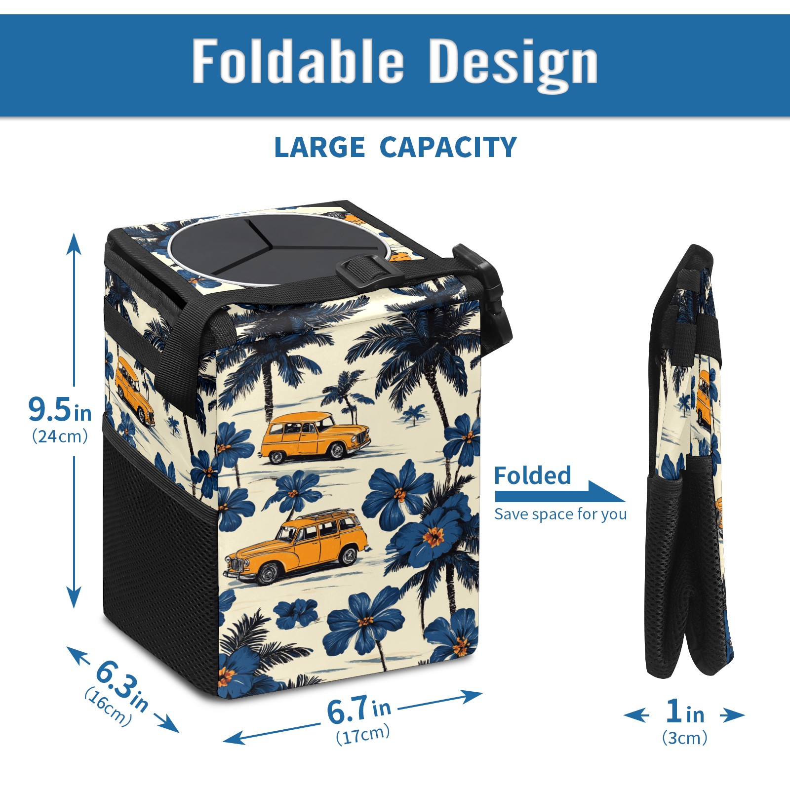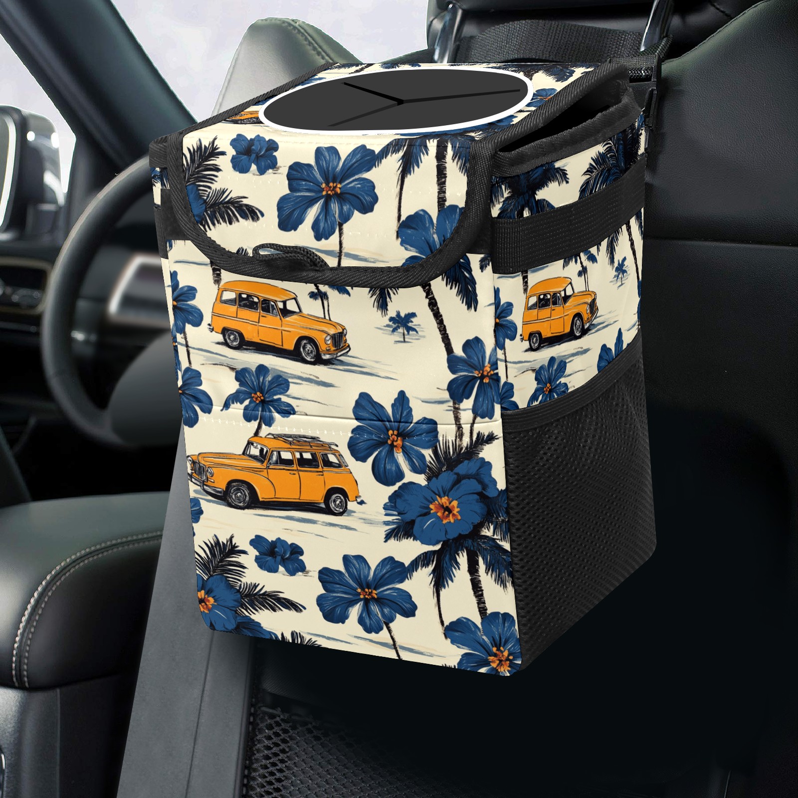 • <p>This multi-functional car trash can features a stylish printed design, combining practicality and aesthetics. Made with high-quality twill fabric and woven straps, it's sturdy and durable. Dimensions: 24×17×16cm (9.5×6.7×6.3 inches). The top rubber opening lid makes disposing of trash easy, while side mesh pockets and a front pocket easily store snacks, mobile phones, and other small items. Equipped with a dual securing system of straps and elastic hooks, it can be flexibly hung behind headrests, inside armrest boxes, or hooked to the bottom of seat cushions. Not only can it be used as a trash can, but it can also function as a food or miscellaneous item storage box, achieving multiple uses. When not in use, it can be folded for storage, saving space and creating a clean and tidy environment for your car.<br></p>