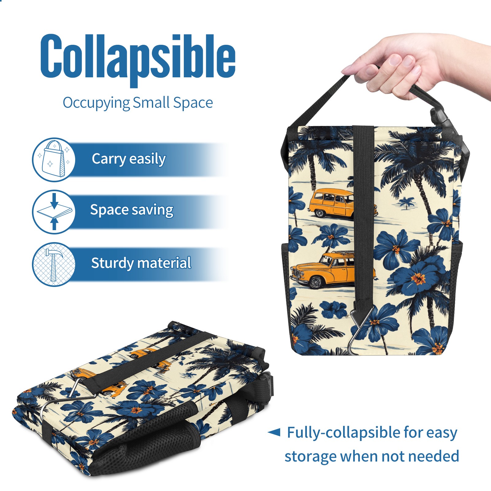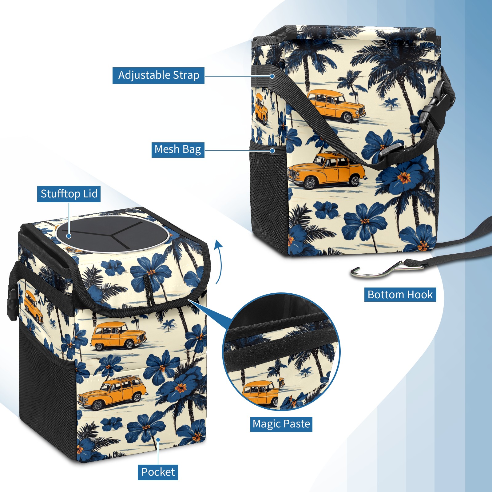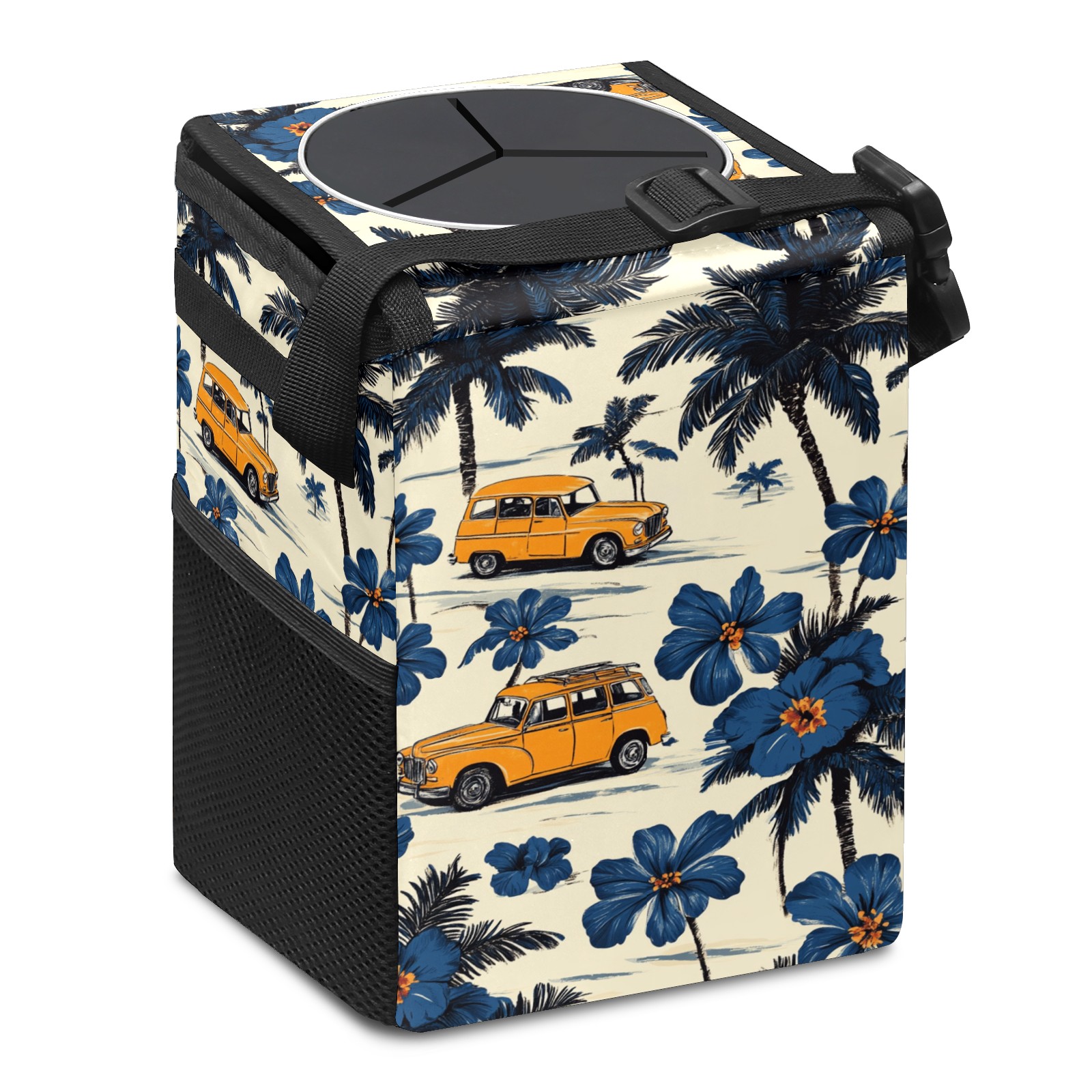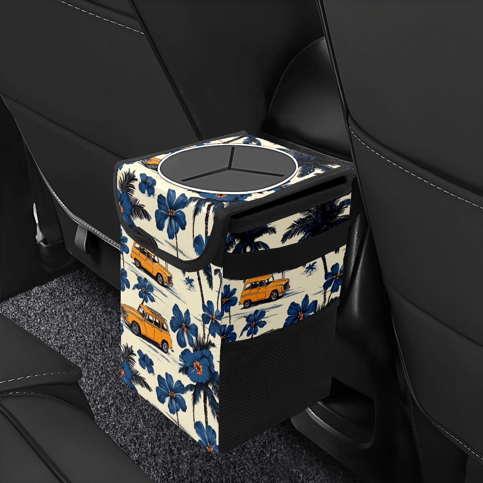 • <p>This multi-functional car trash can features a stylish printed design, combining practicality and aesthetics. Made with high-quality twill fabric and woven straps, it's sturdy and durable. Dimensions: 24×17×16cm (9.5×6.7×6.3 inches). The top rubber opening lid makes disposing of trash easy, while side mesh pockets and a front pocket easily store snacks, mobile phones, and other small items. Equipped with a dual securing system of straps and elastic hooks, it can be flexibly hung behind headrests, inside armrest boxes, or hooked to the bottom of seat cushions. Not only can it be used as a trash can, but it can also function as a food or miscellaneous item storage box, achieving multiple uses. When not in use, it can be folded for storage, saving space and creating a clean and tidy environment for your car.<br></p>