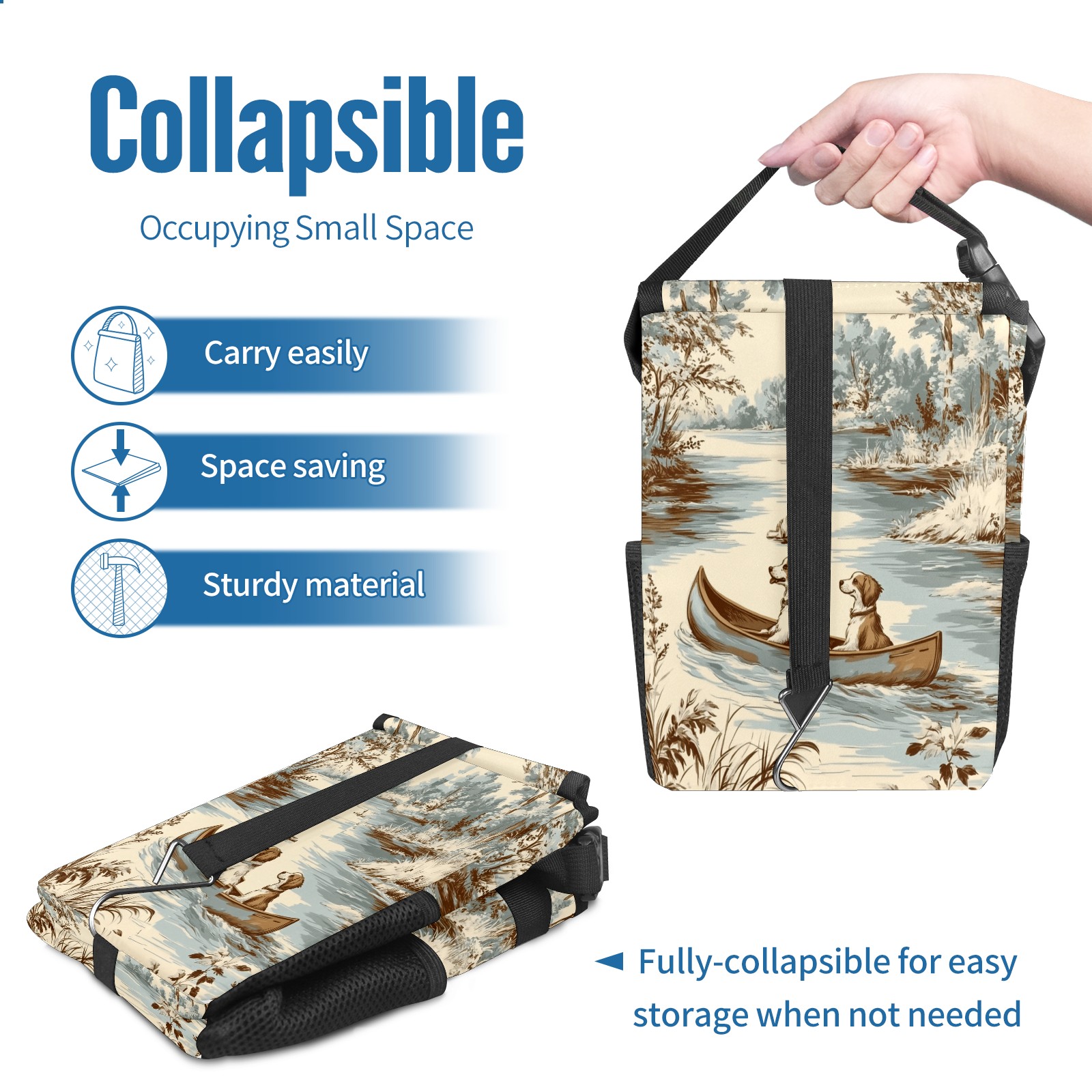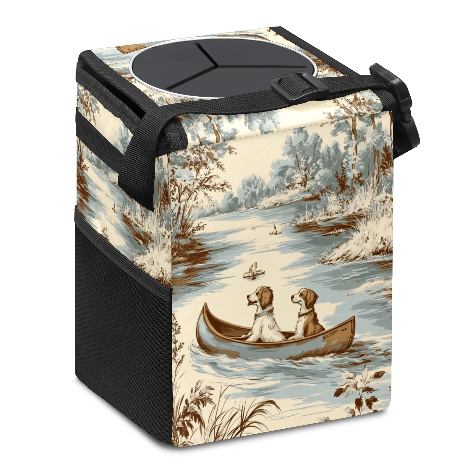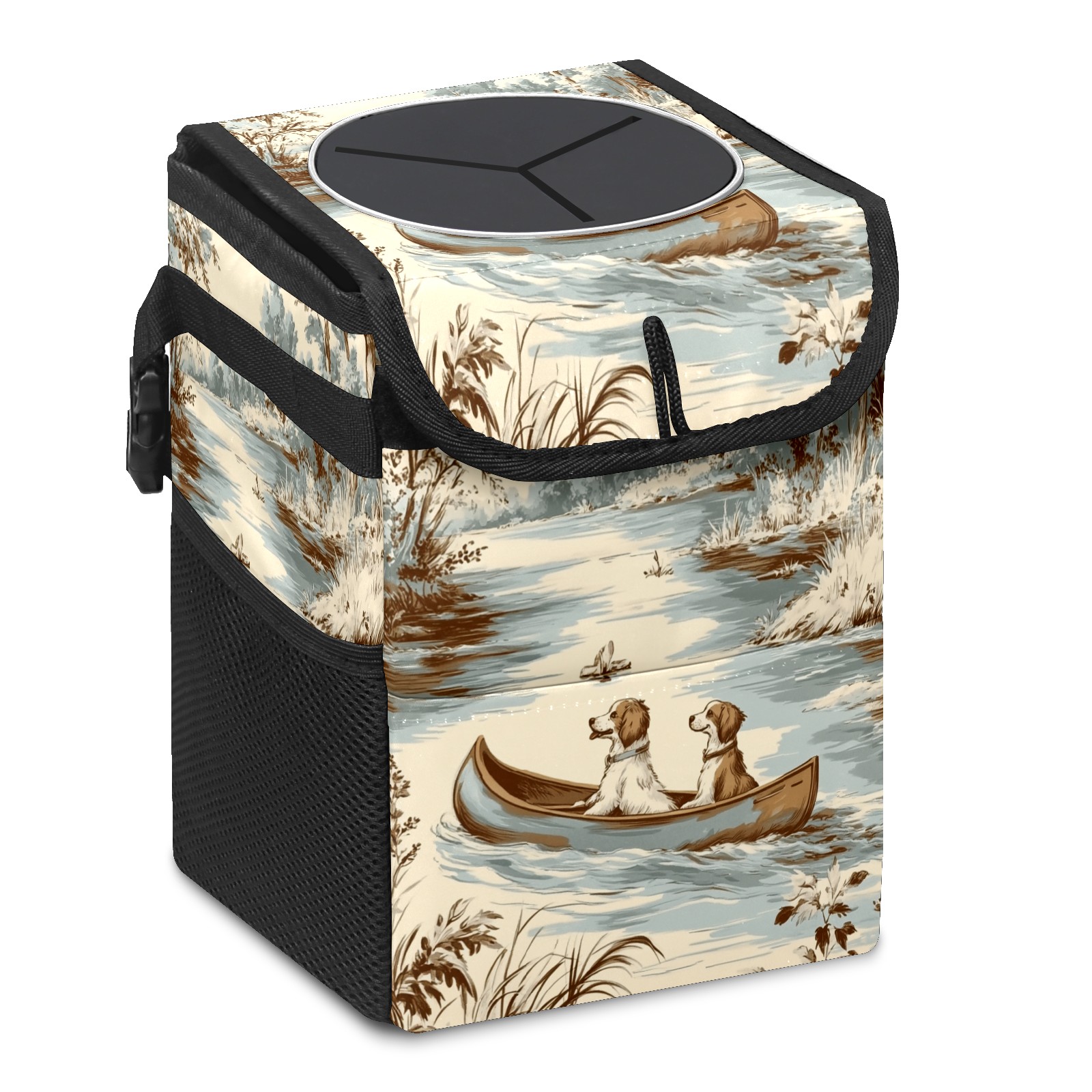 • <p>This multi-functional car trash can features a stylish printed design, combining practicality and aesthetics. Made with high-quality twill fabric and woven straps, it's sturdy and durable. Dimensions: 24×17×16cm (9.5×6.7×6.3 inches). The top rubber opening lid makes disposing of trash easy, while side mesh pockets and a front pocket easily store snacks, mobile phones, and other small items. Equipped with a dual securing system of straps and elastic hooks, it can be flexibly hung behind headrests, inside armrest boxes, or hooked to the bottom of seat cushions. Not only can it be used as a trash can, but it can also function as a food or miscellaneous item storage box, achieving multiple uses. When not in use, it can be folded for storage, saving space and creating a clean and tidy environment for your car.<br></p>