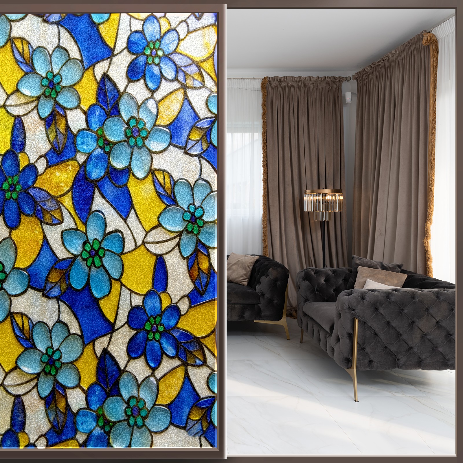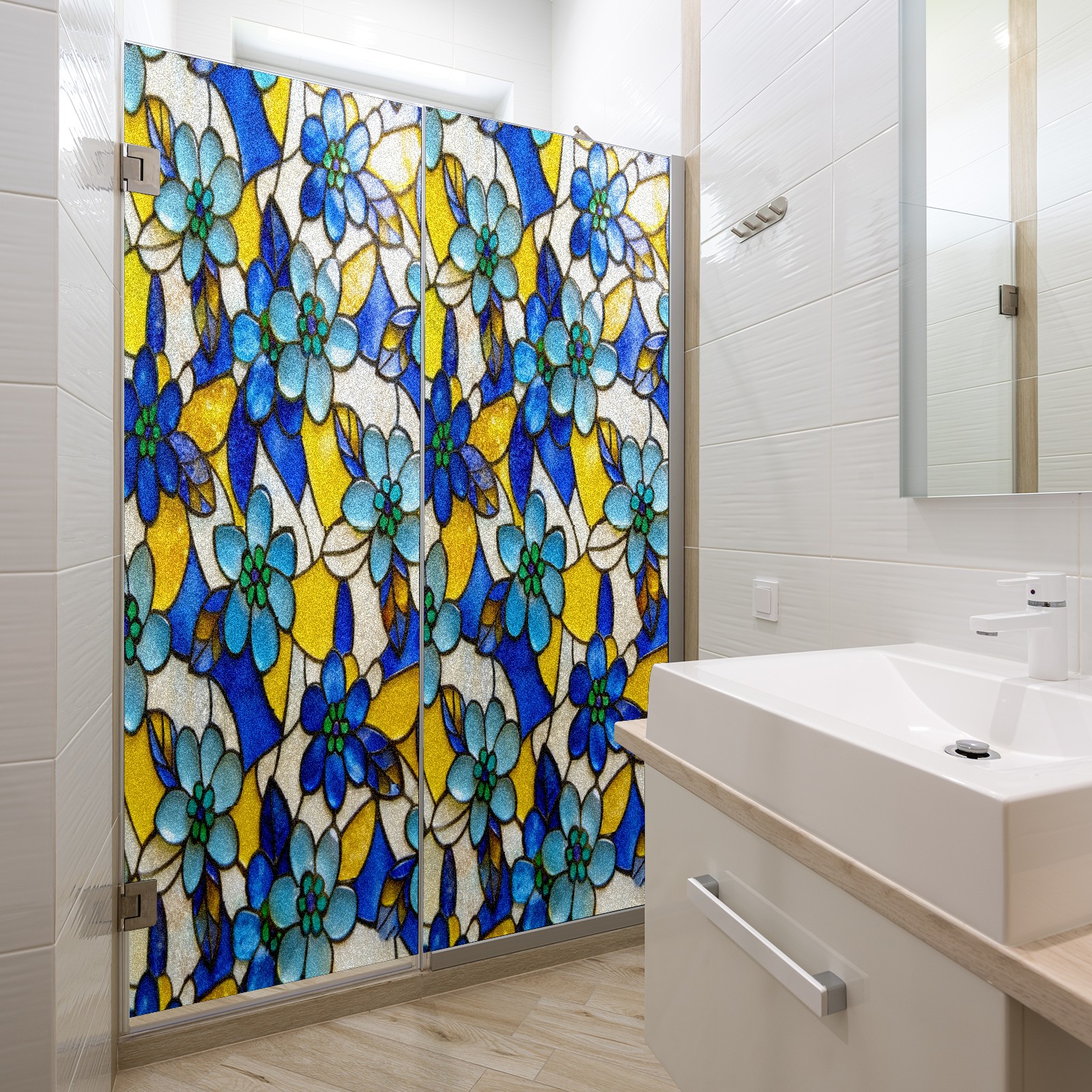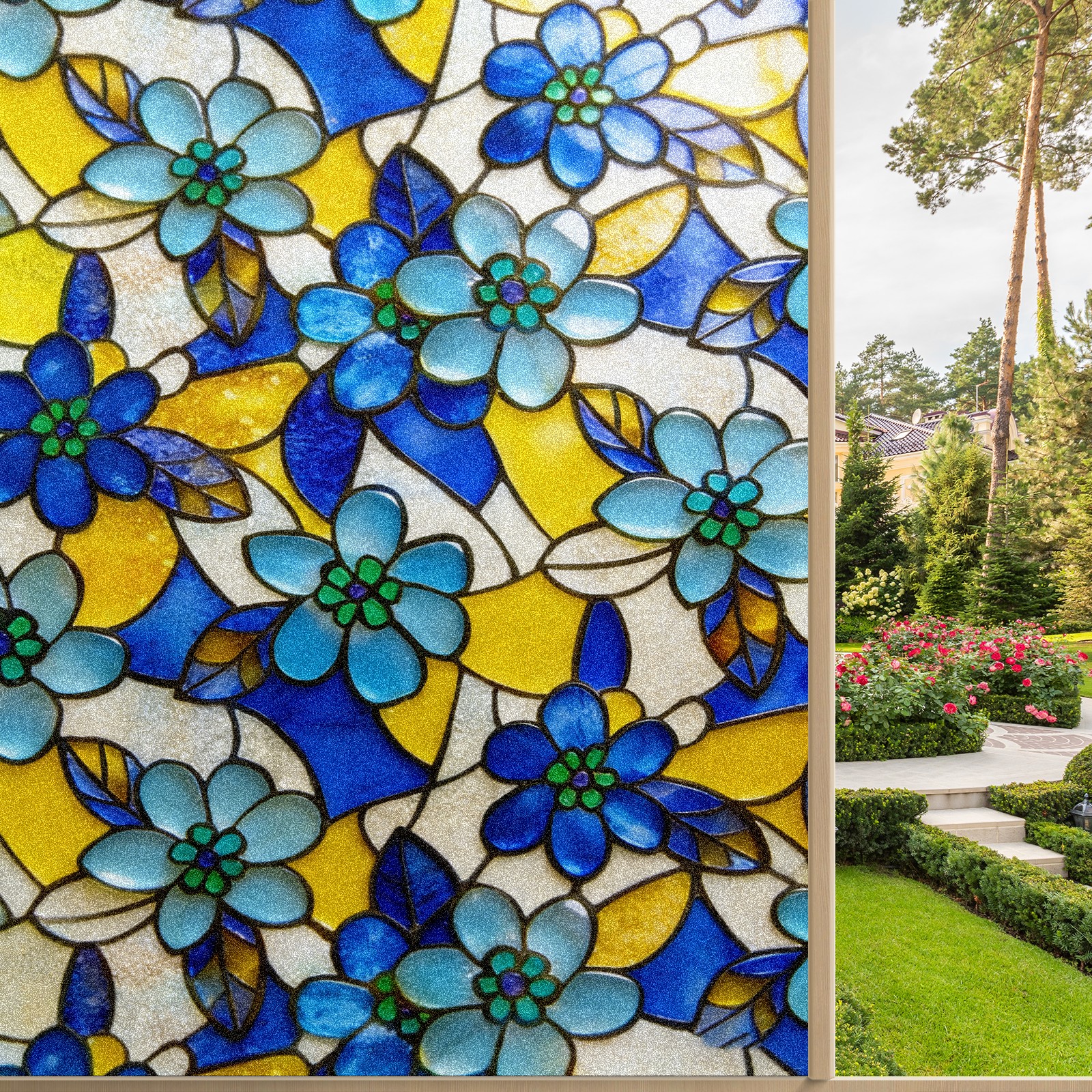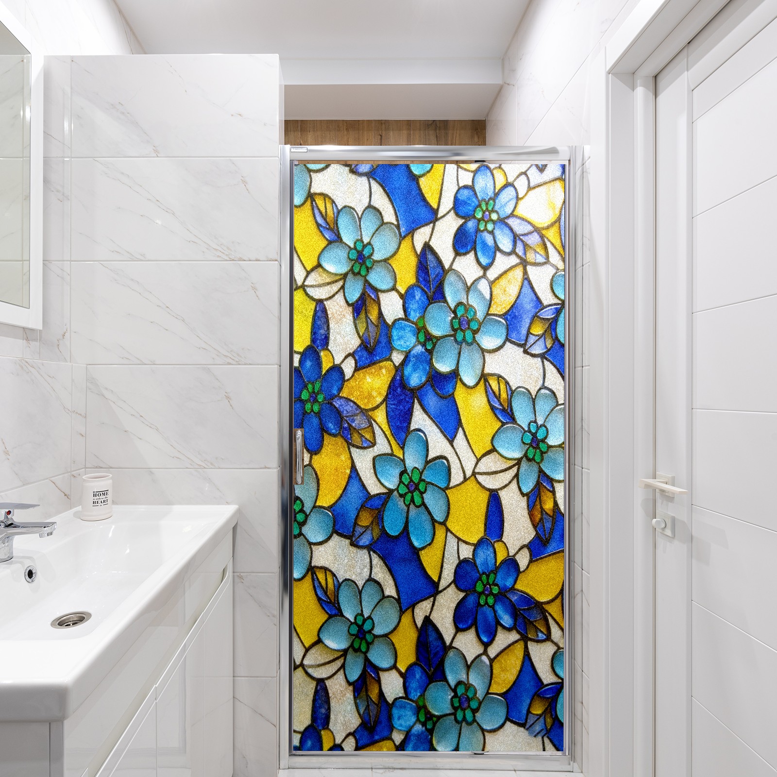 Counullo Frosted Glass Privacy Window Film, Blue Floral Non Adhesive Static Cling, Reusable PET Window Sticker for Bathroom Shower Door Bedroom Office Living Room (17.7x23.6in)