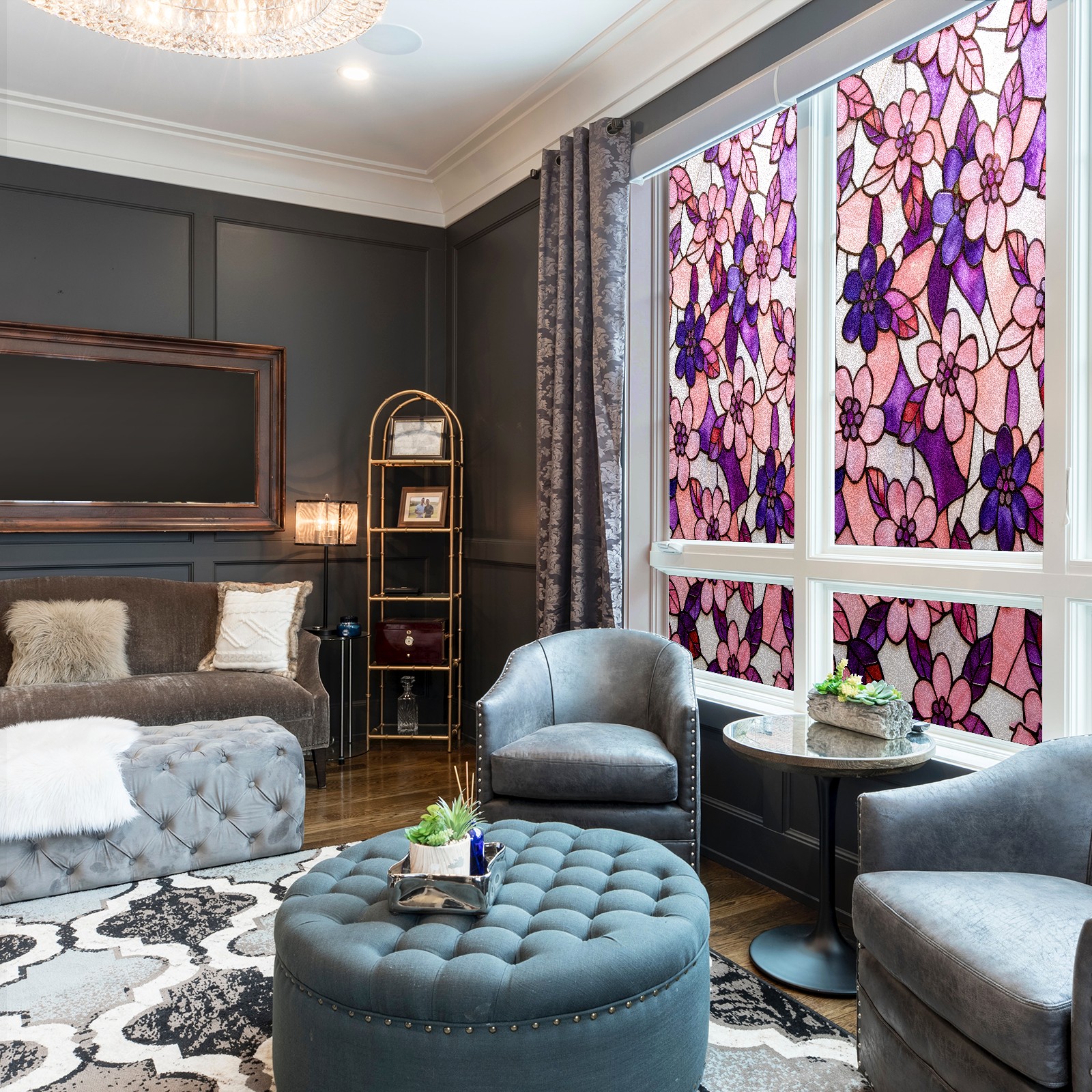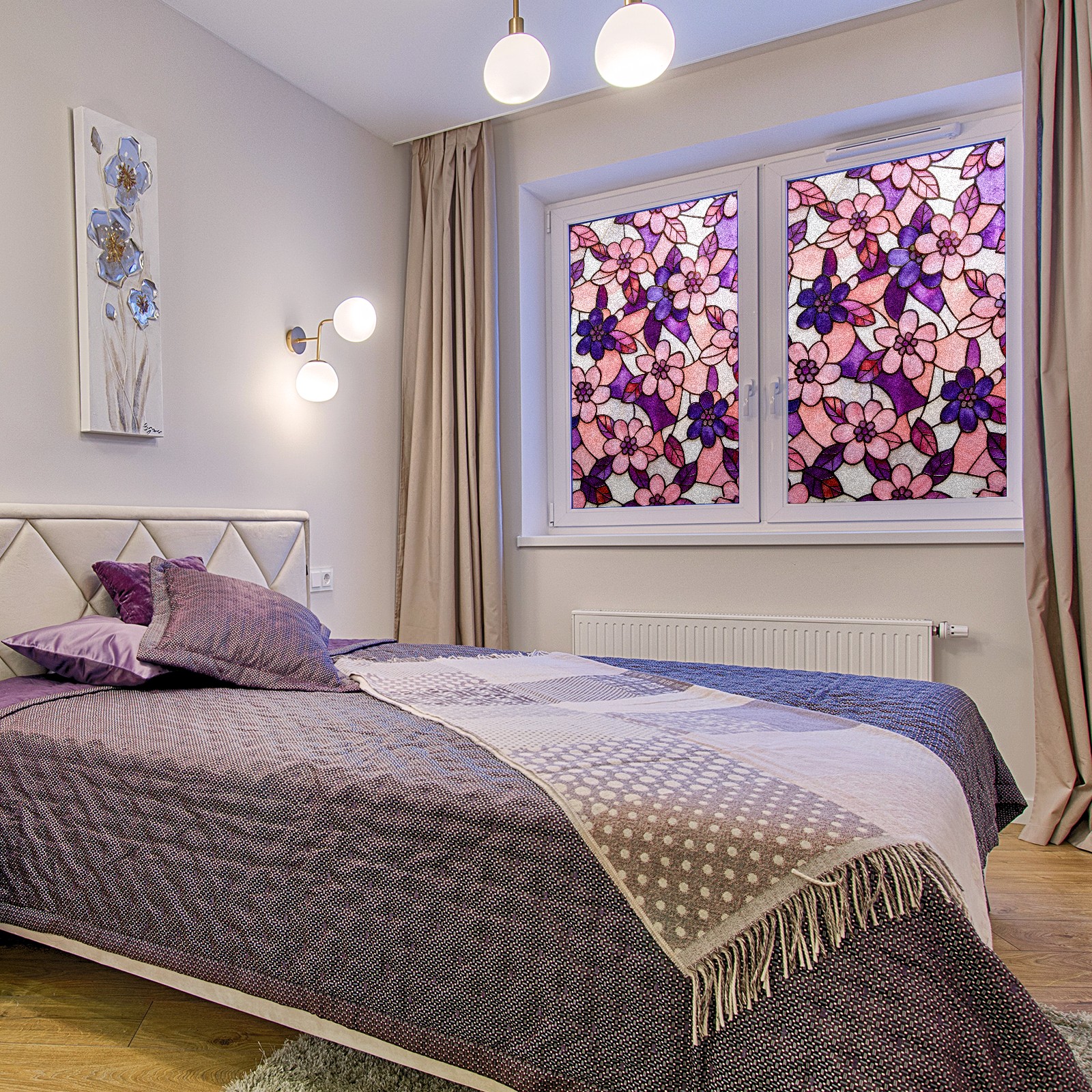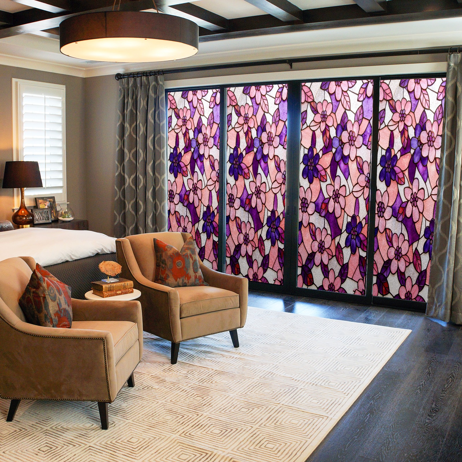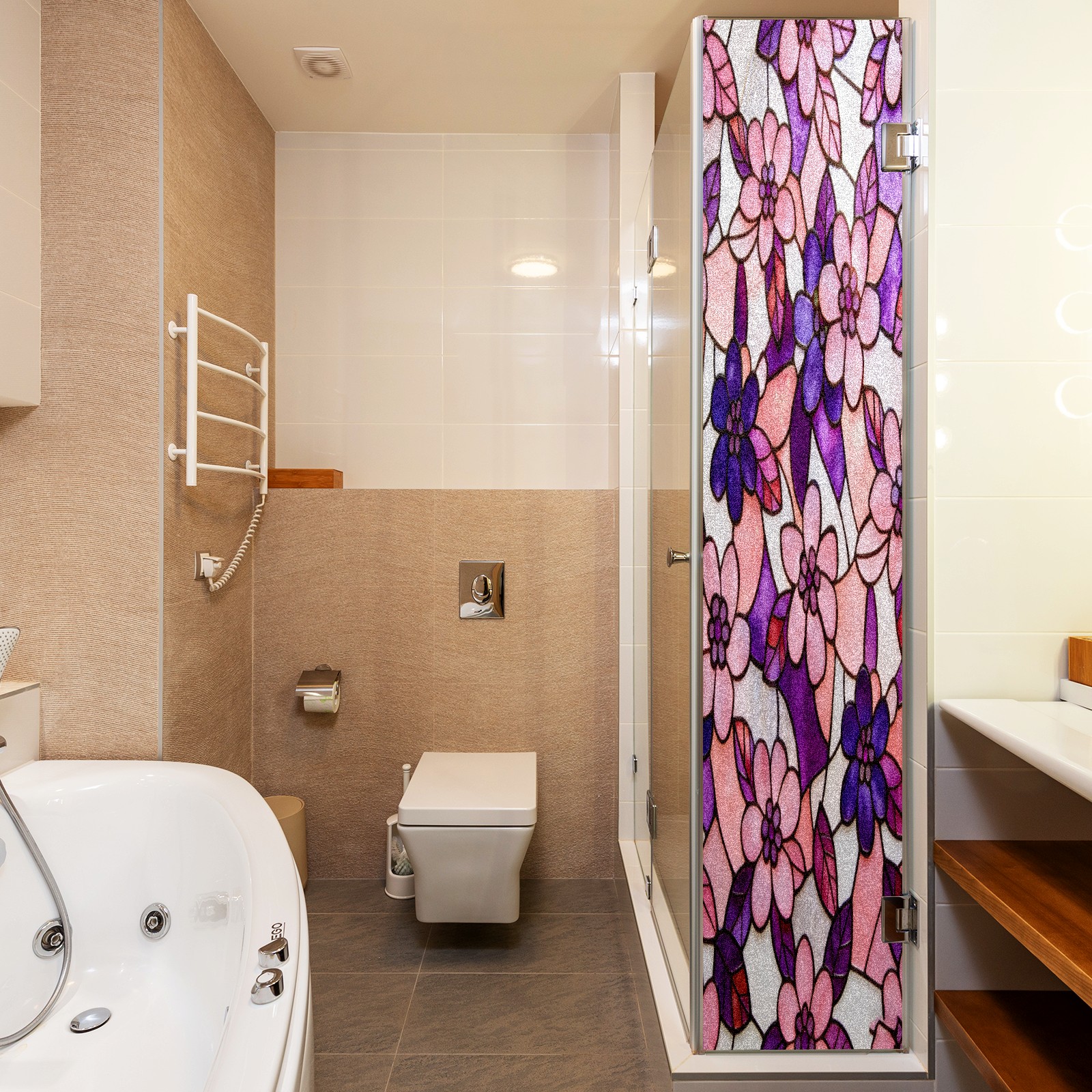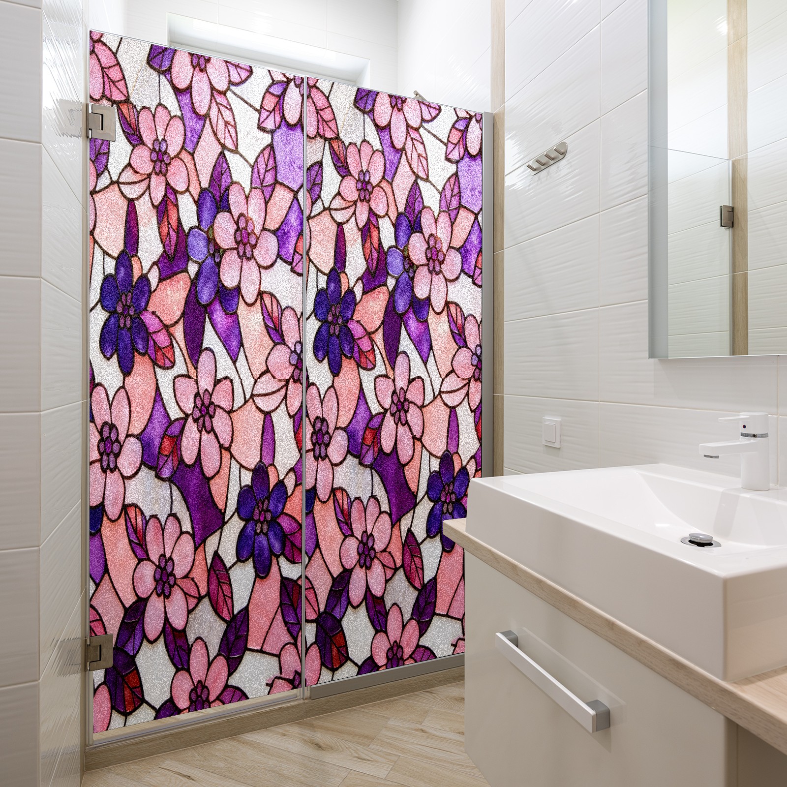 Counullo Frosted Glass Privacy Window Film, Purple Floral Non Adhesive Static Cling, Reusable PET Window Sticker for Bathroom Shower Door Bedroom Office Living Room (17.7x23.6in)