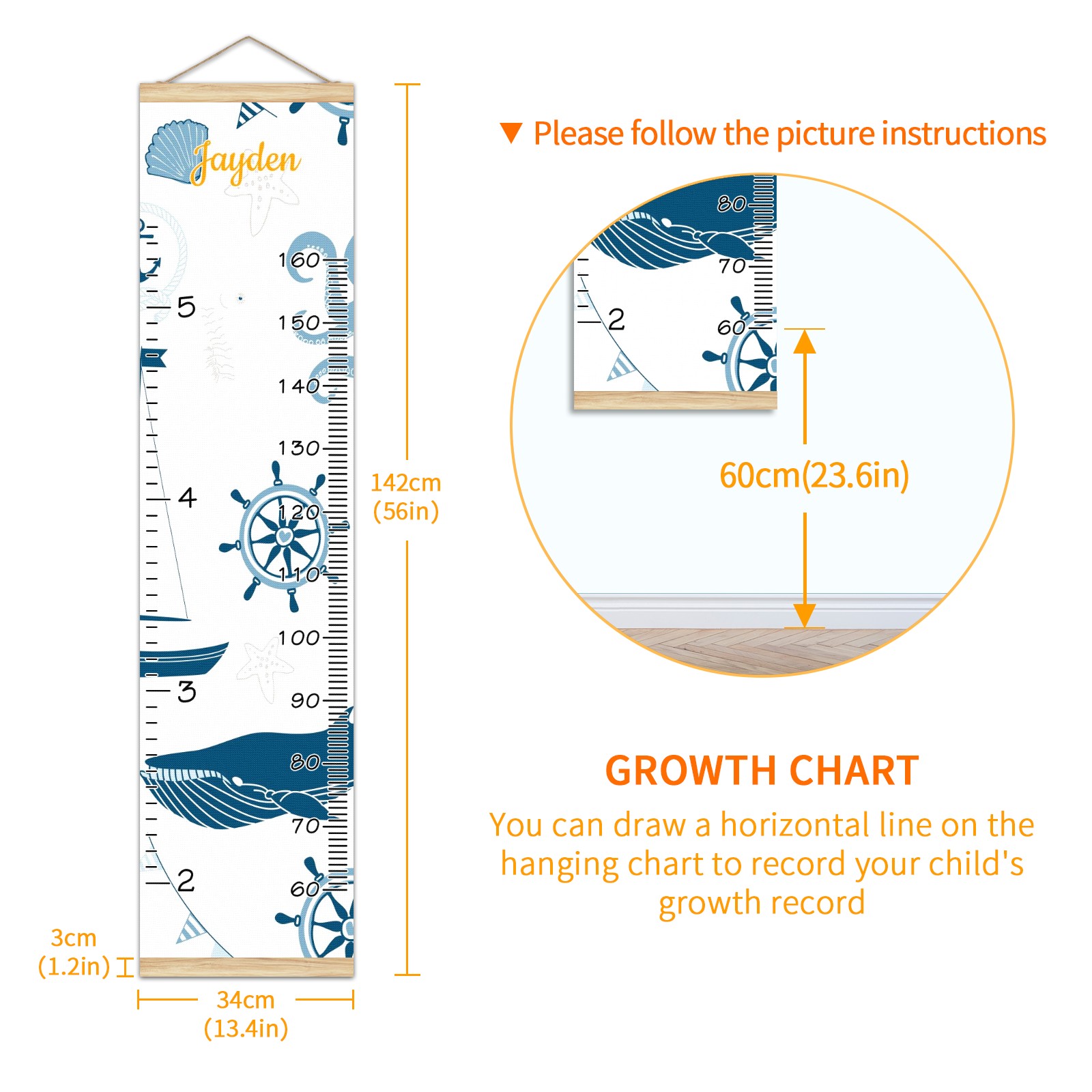• <p><b>Features:</b></p> <p>Rope for Hanging</p> <p>Material: Linen + Wood</p> <p>Dimensions: 13.4x56 inches</p> <p>Package Included: 1 * Baby Growth Chart</p> <p><b>Baby height growth chart can be used anywhere</b></p> <p>Ideal for kids nursery decoration, kids bedroom, interior walls or windows, playroom, living room, homedecoration.Add name and make the growth chart special!</p> <p><b>Easy to fold and carry</b></p> <p>With rope at the top of the growth chart, it is easy to install and remove.You can fold it and unfold any time any where.</p> <p><b>Perfect Gift Idea for Kids</b></p> <p>Environmental and non-toxic for kids use, it must be a perfect gift for baby, kids, girls, and boys.This is a best choice for your friend who have kids or baby as a popular gift.</p> <p><b>Easy to read</b></p> <p>Measurement accrate with 2 scales, Centimeters and feet. The letters are big enough, very easy to read.</p> <p><b>60cm(23.6inch) Over Ground Design</b></p> <p>Not only can protect from dust and other damage, but also will not interfere in floor cleaning.</p>