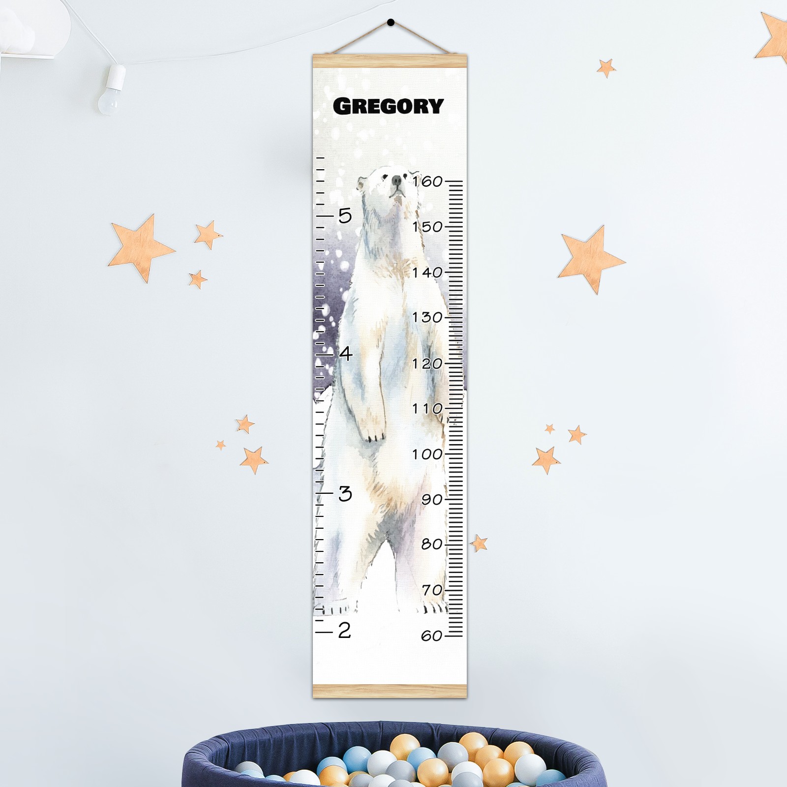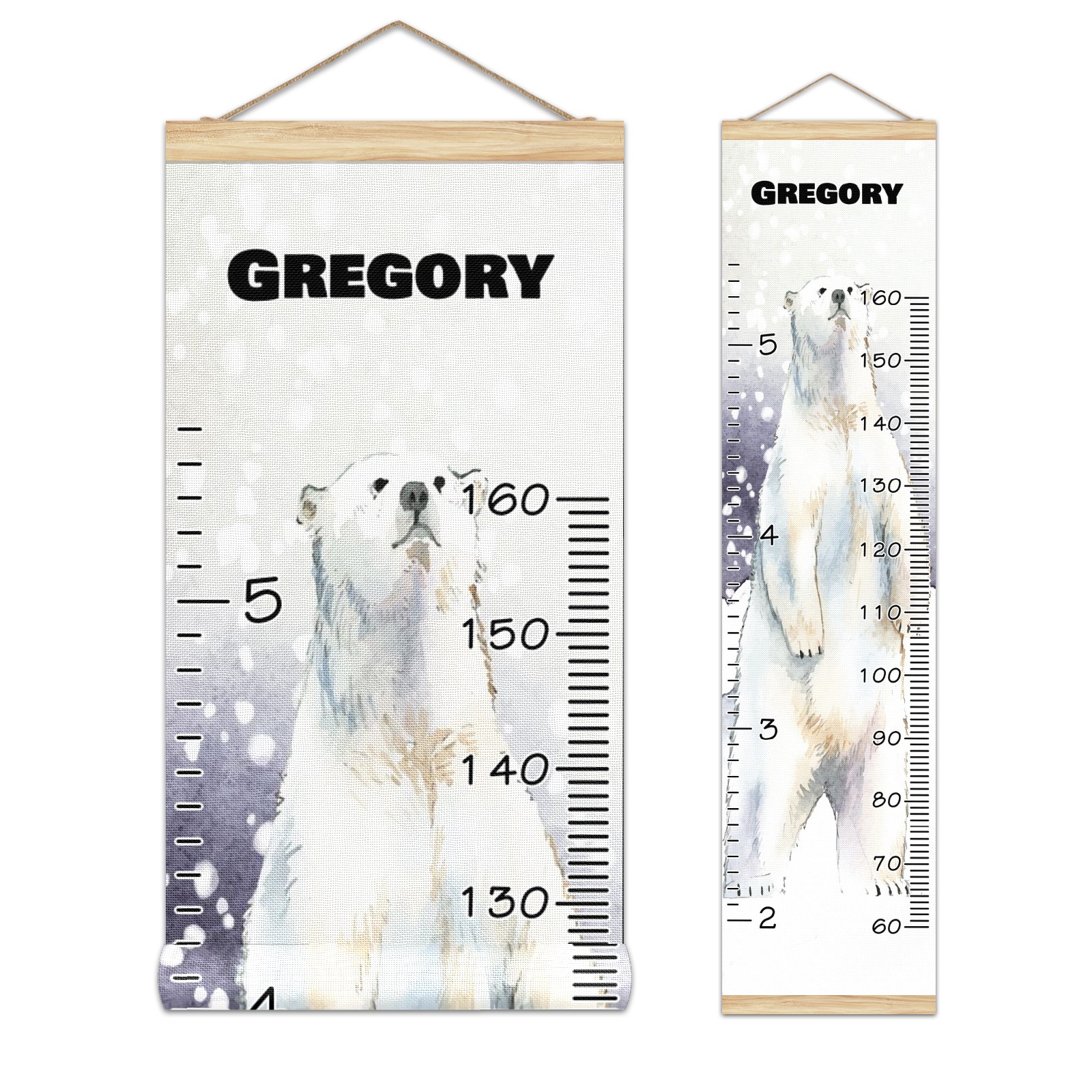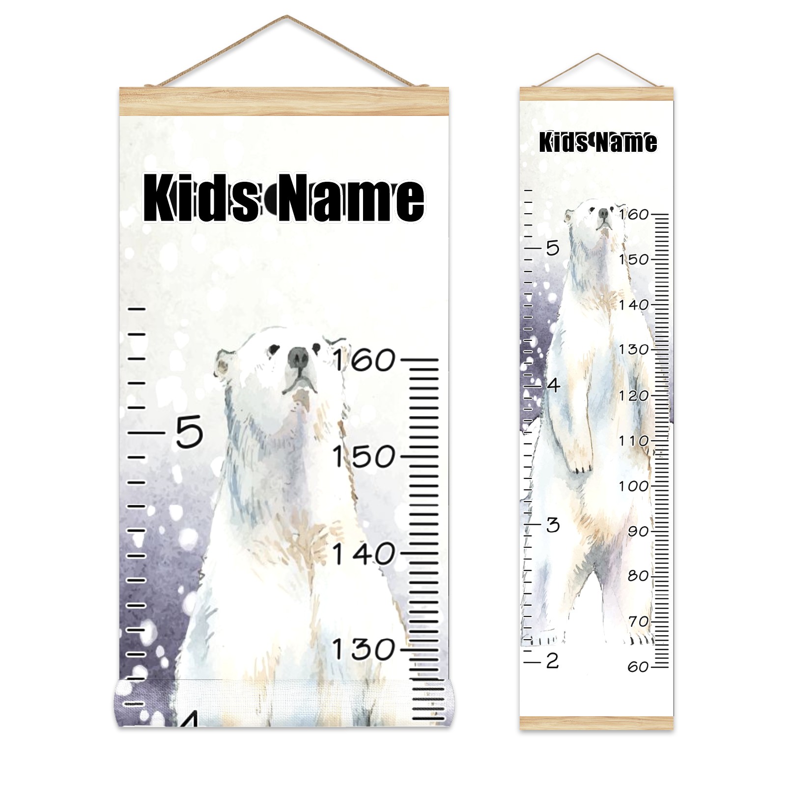 Personalized Kids Name Growth Chart Ruler for Wall Wood Frame Canvas Height Measure Chart 13.4x56 in Hanging Growth Chart Winter Snow Animal Polar Bear1.26 Boys Girls Room Decor