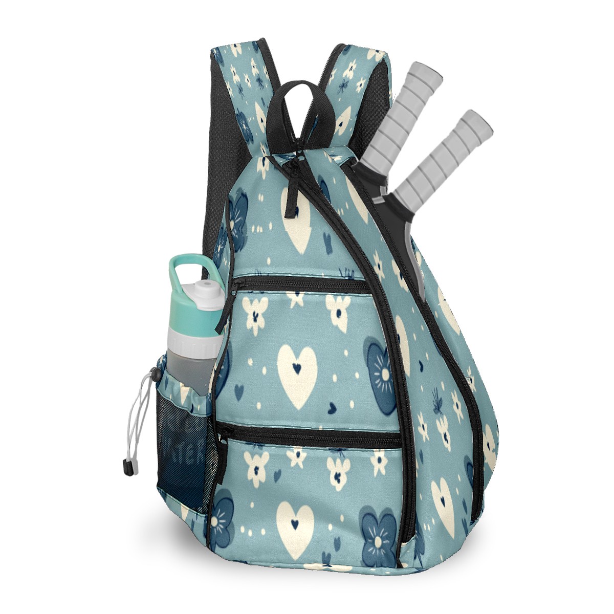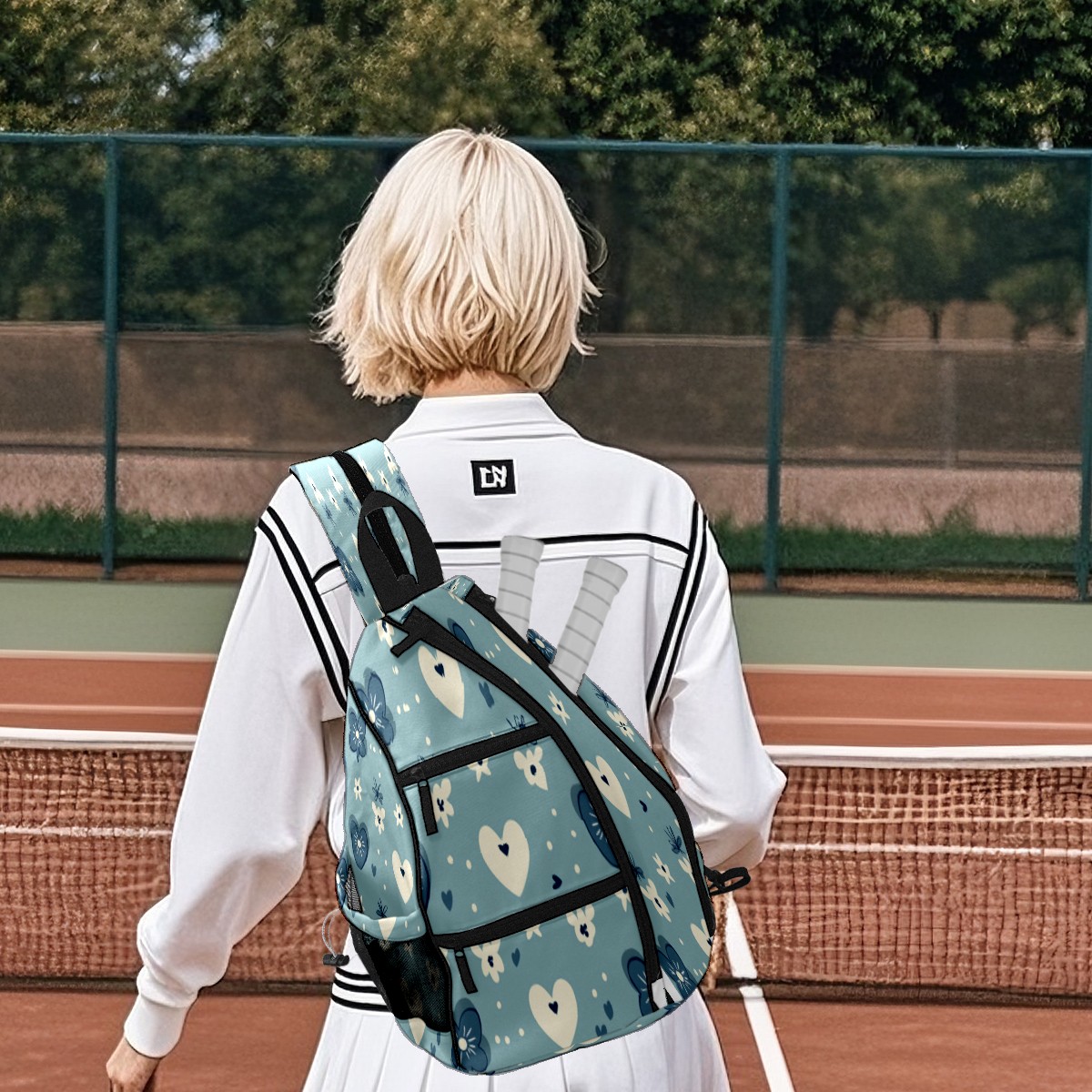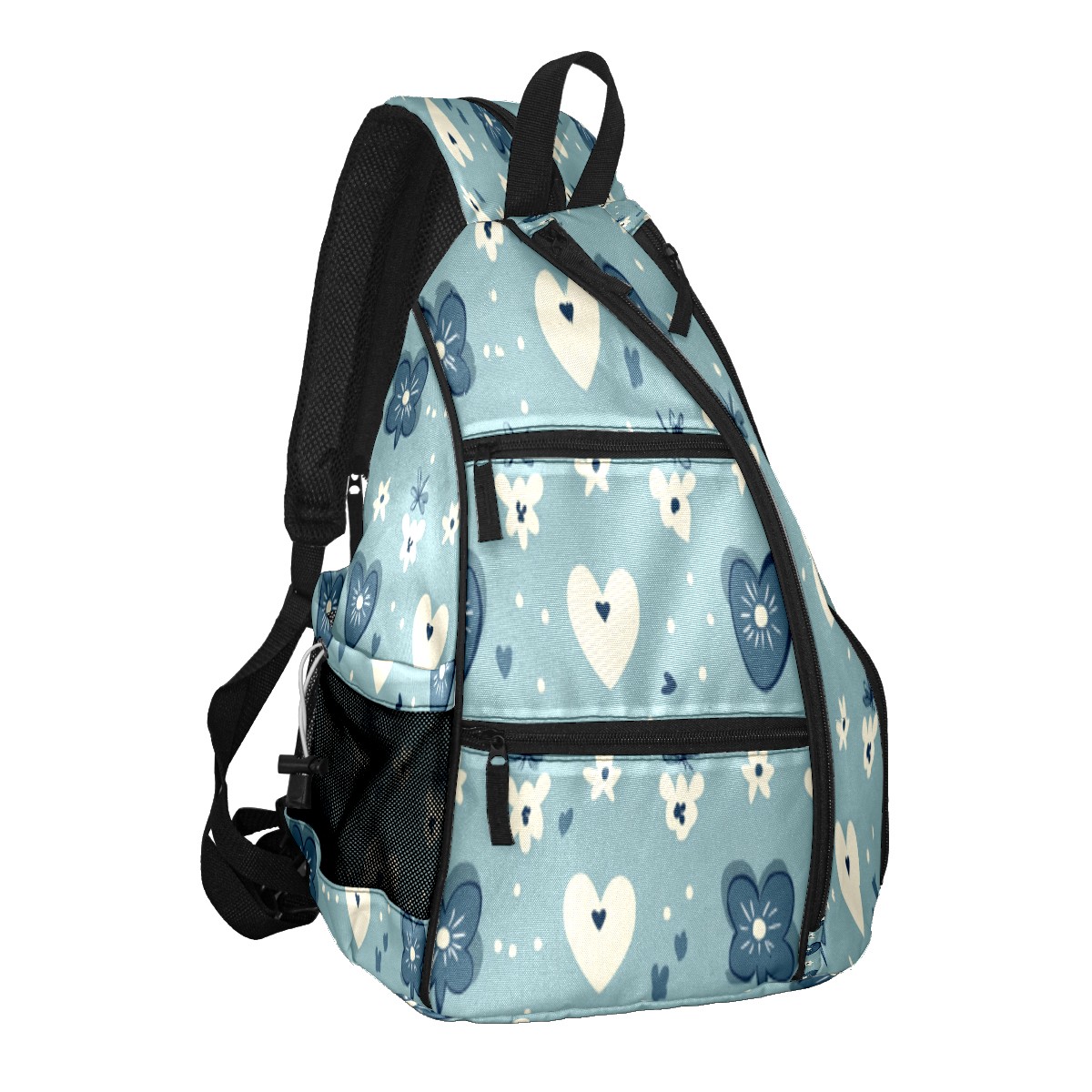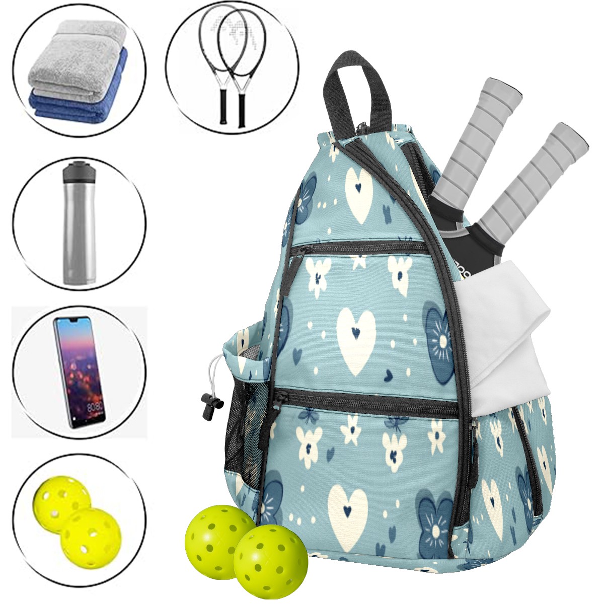 Pickleball Sling Bag for Women and Men - Backpack with Nylon Fabric/Woven Strap/Mesh Pocket/Fence Hook/Adjustable Bag Blue Heart Pattern