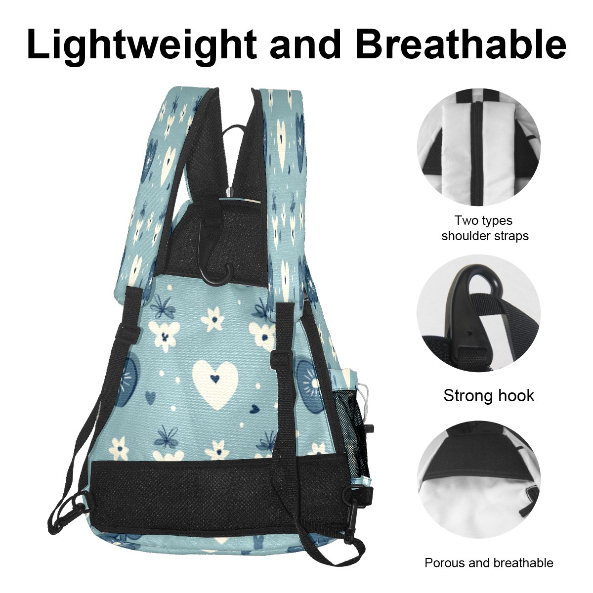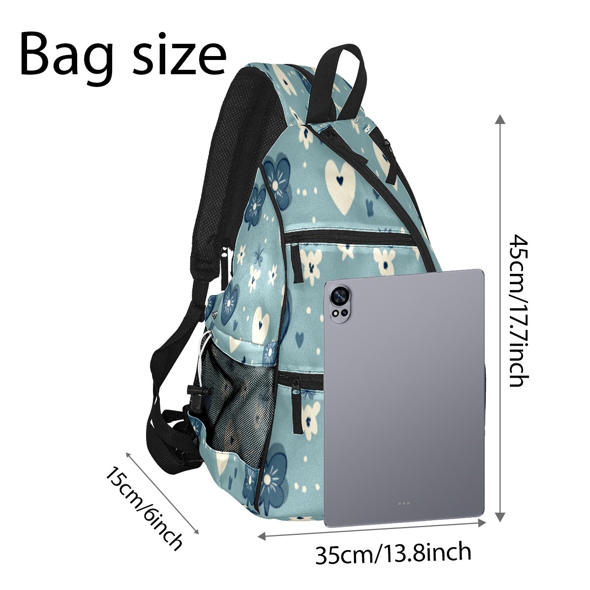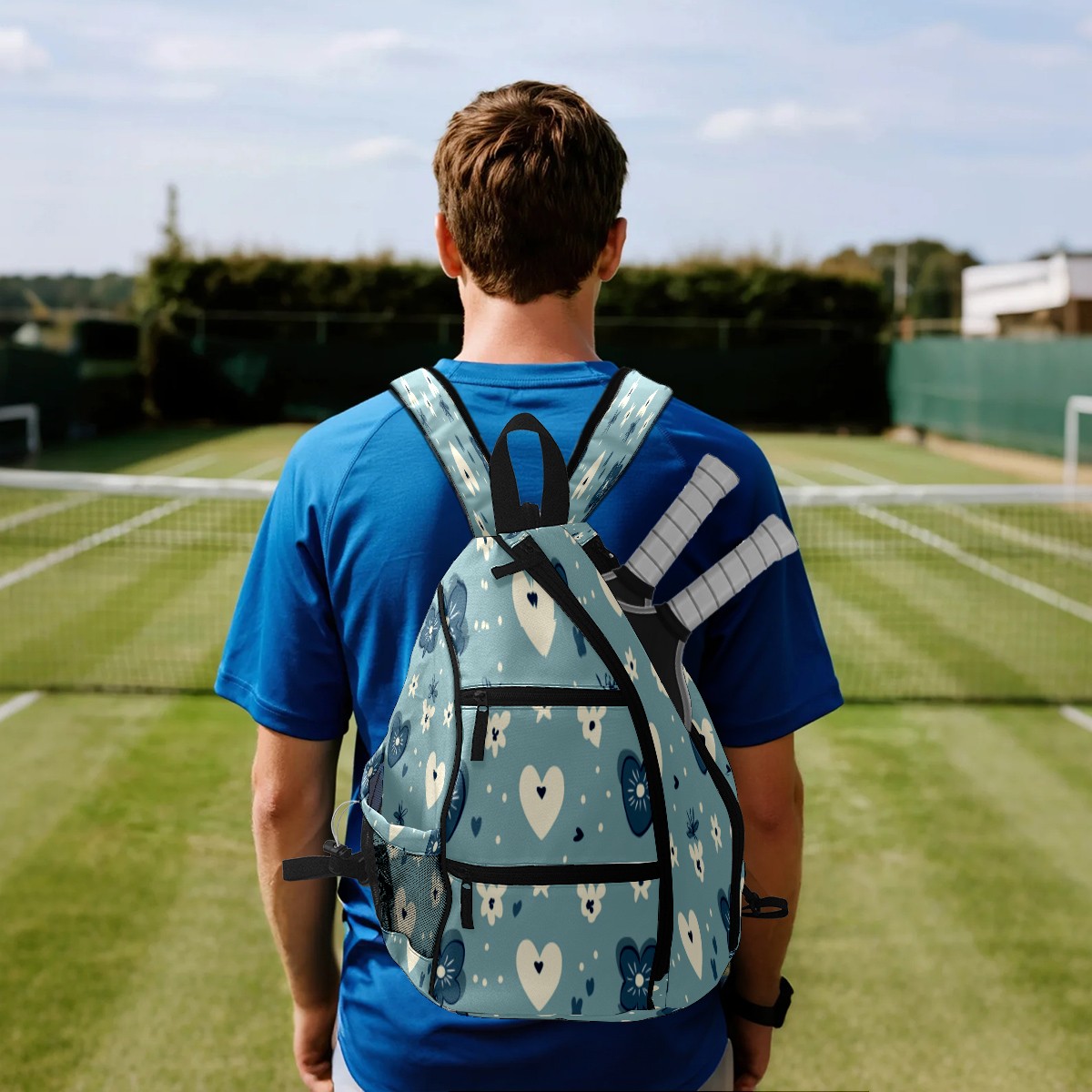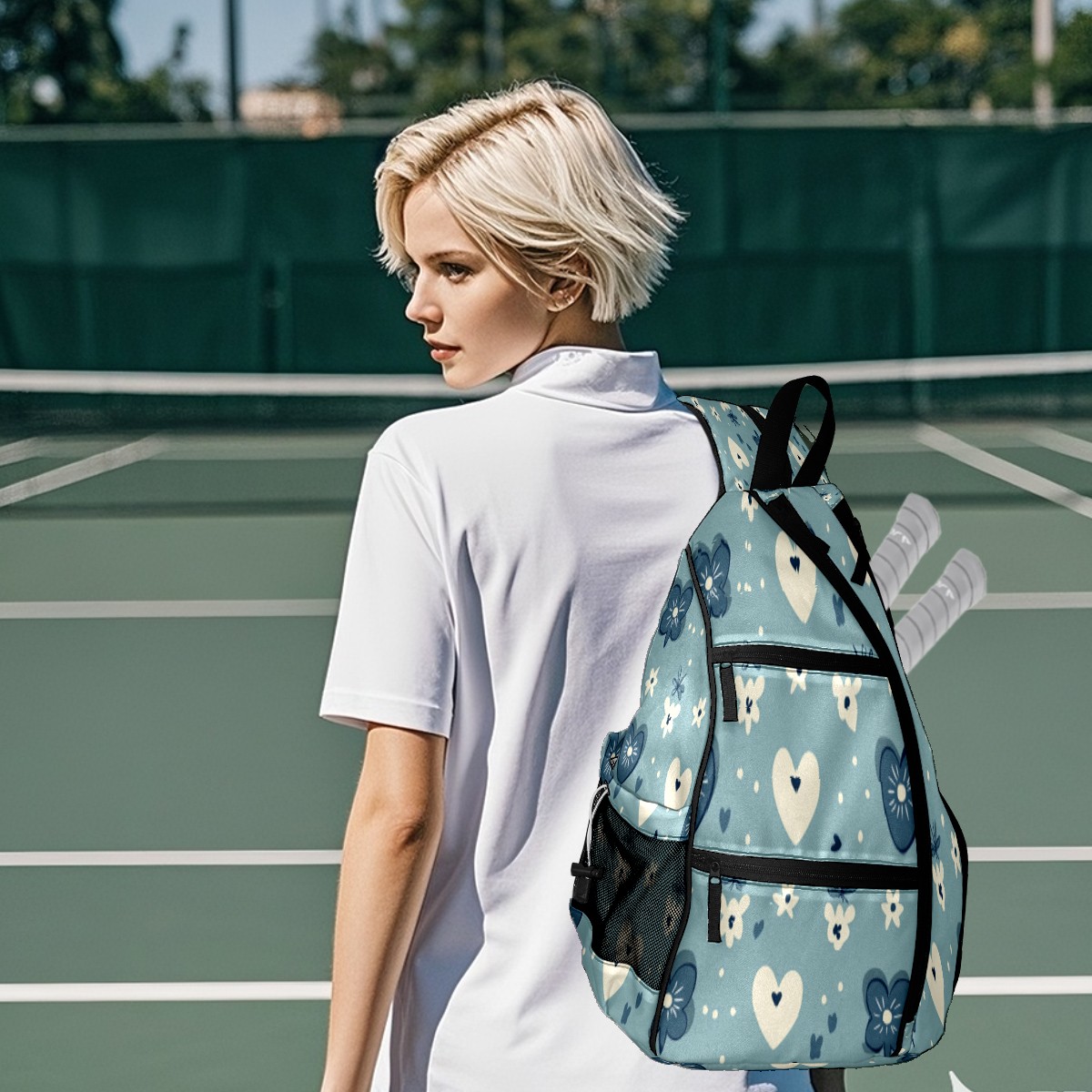 Pickleball Sling Bag for Women and Men - Backpack with Nylon Fabric/Woven Strap/Mesh Pocket/Fence Hook/Adjustable Bag Blue Heart Pattern
