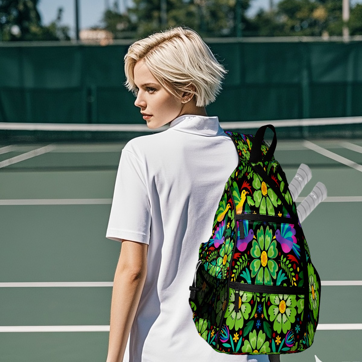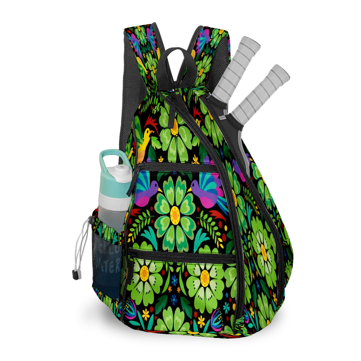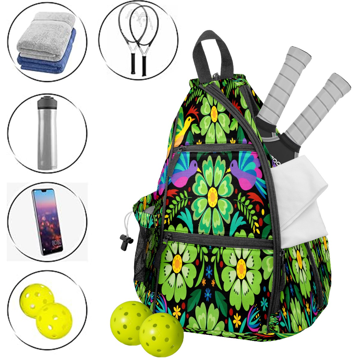 Pickleball Sling Bag for Women and Men - Backpack with Nylon Fabric/Woven Strap/Mesh Pocket/Fence Hook/Adjustable Bag Colorful Flower Green