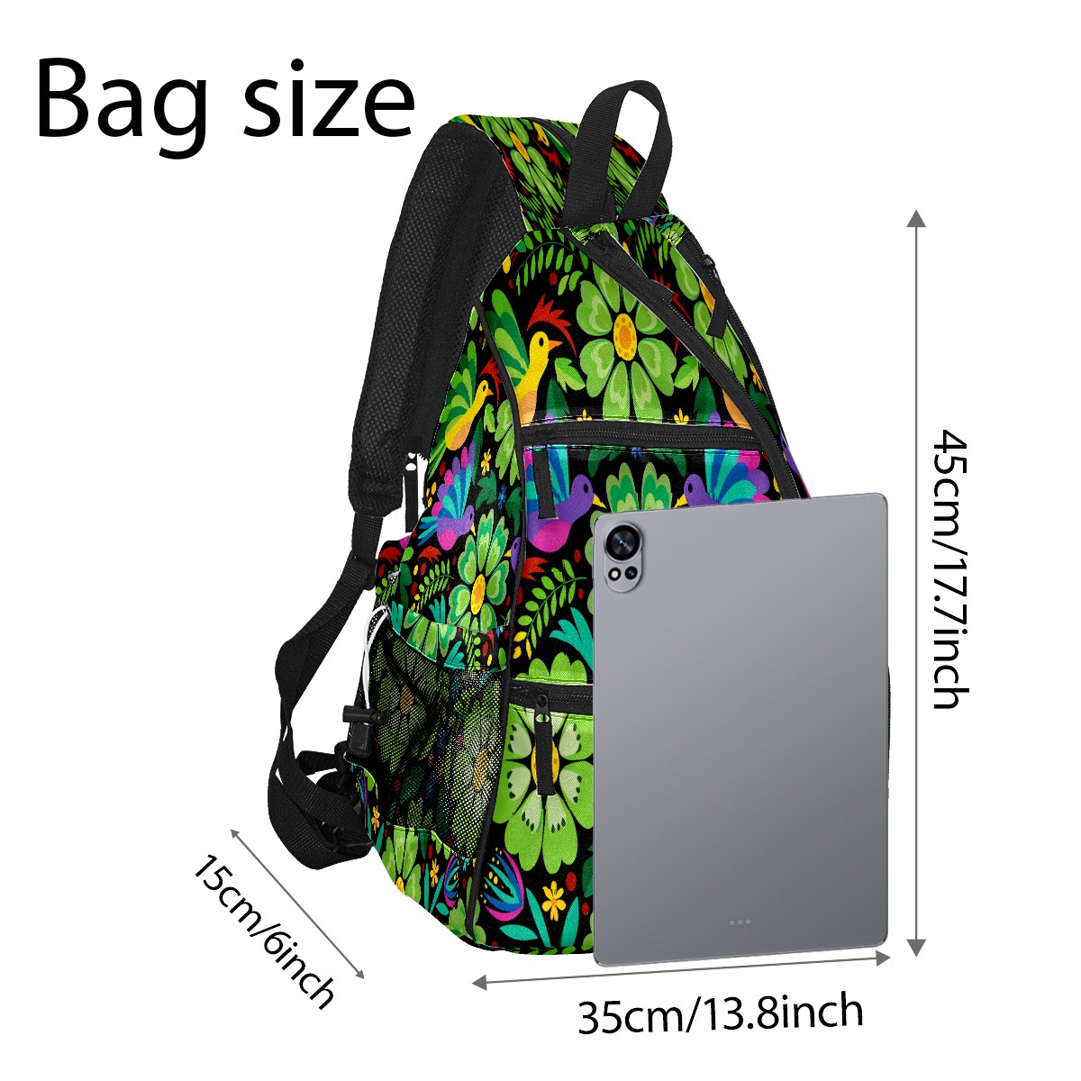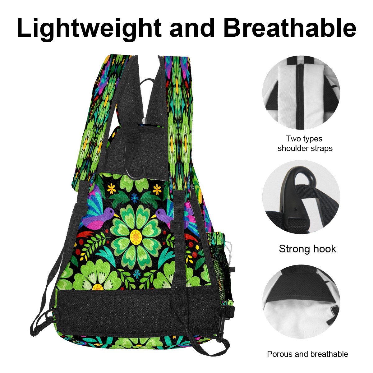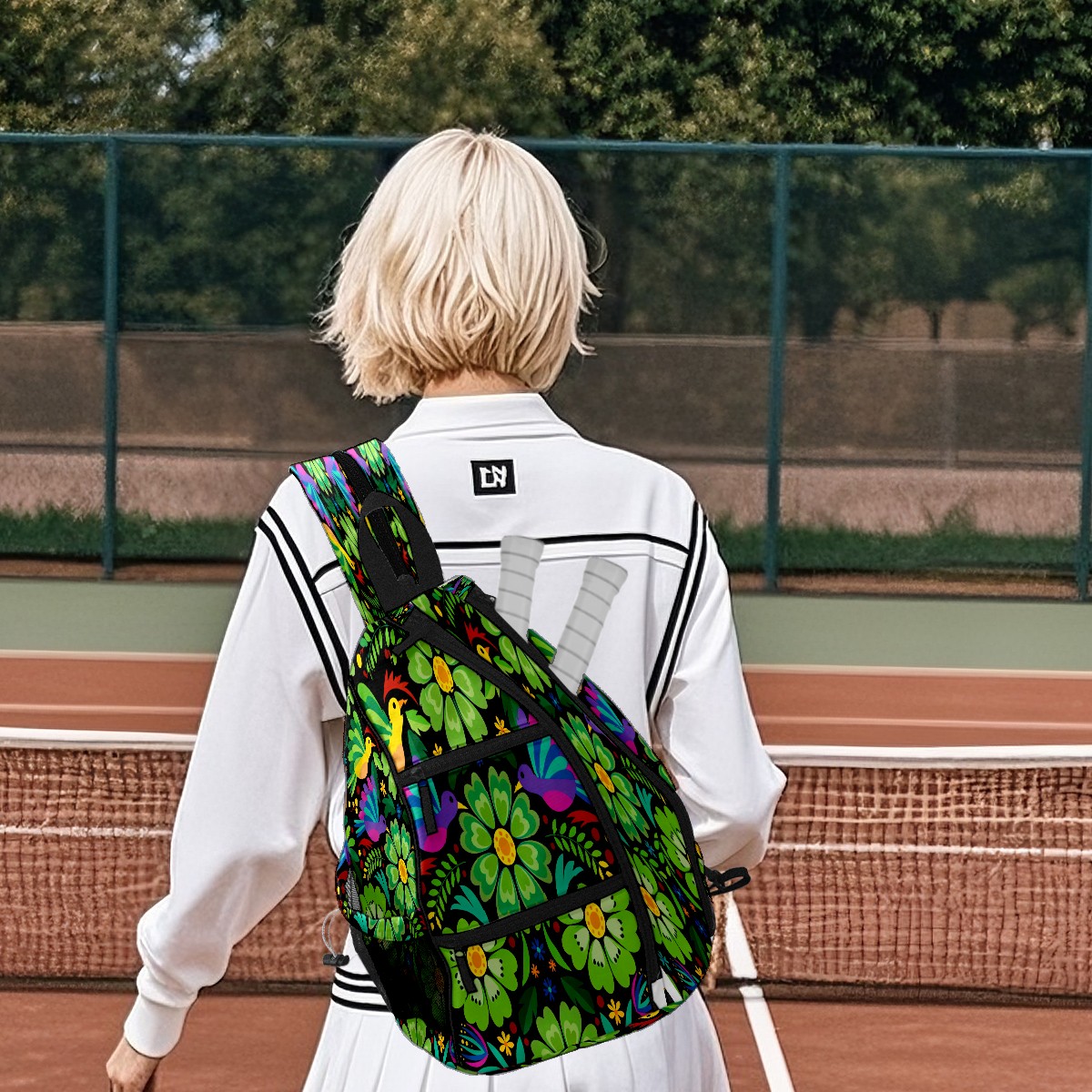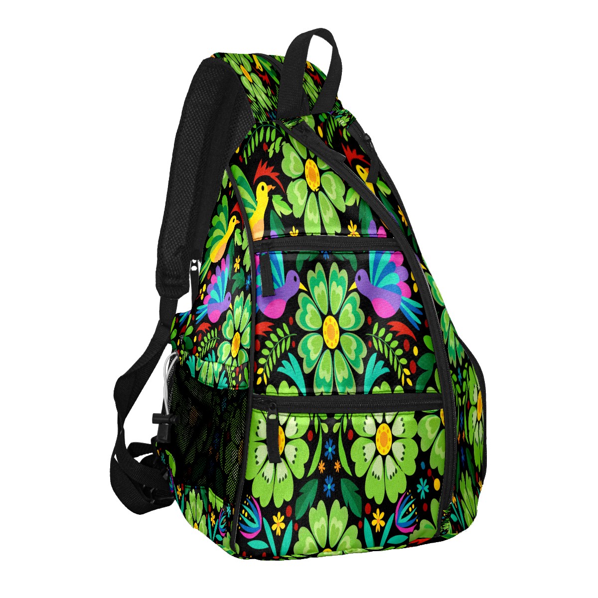 Pickleball Sling Bag for Women and Men - Backpack with Nylon Fabric/Woven Strap/Mesh Pocket/Fence Hook/Adjustable Bag Colorful Flower Green