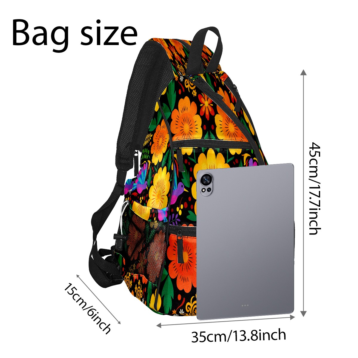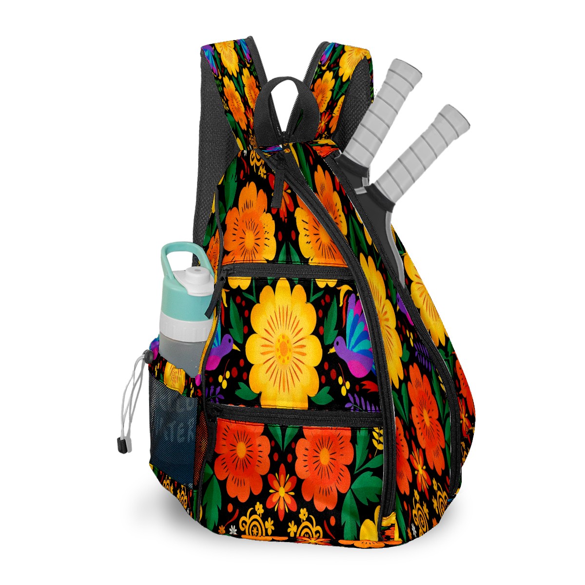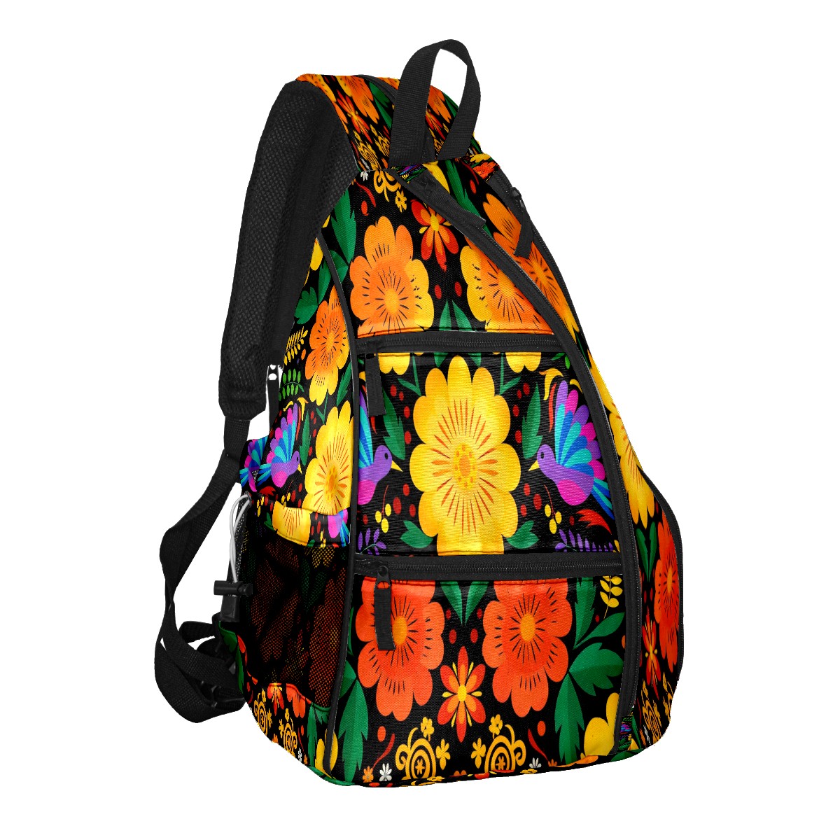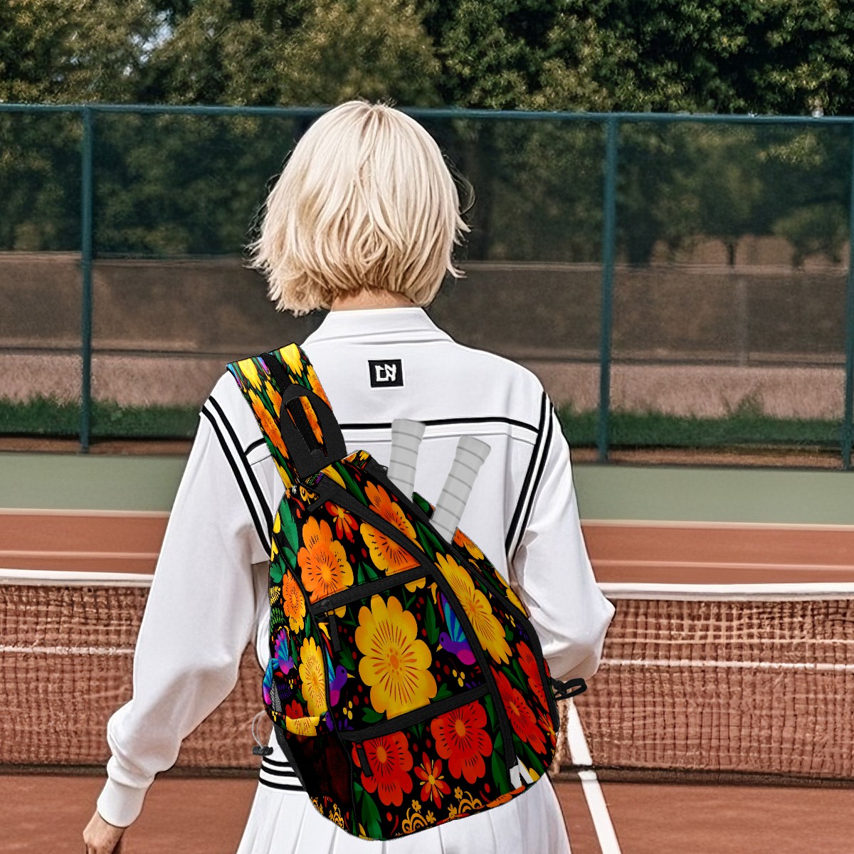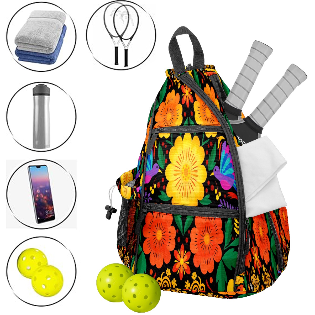Pickleball Sling Bag for Women and Men - Backpack with Nylon Fabric/Woven Strap/Mesh Pocket/Fence Hook/Adjustable Bag Warm Flower Orange
