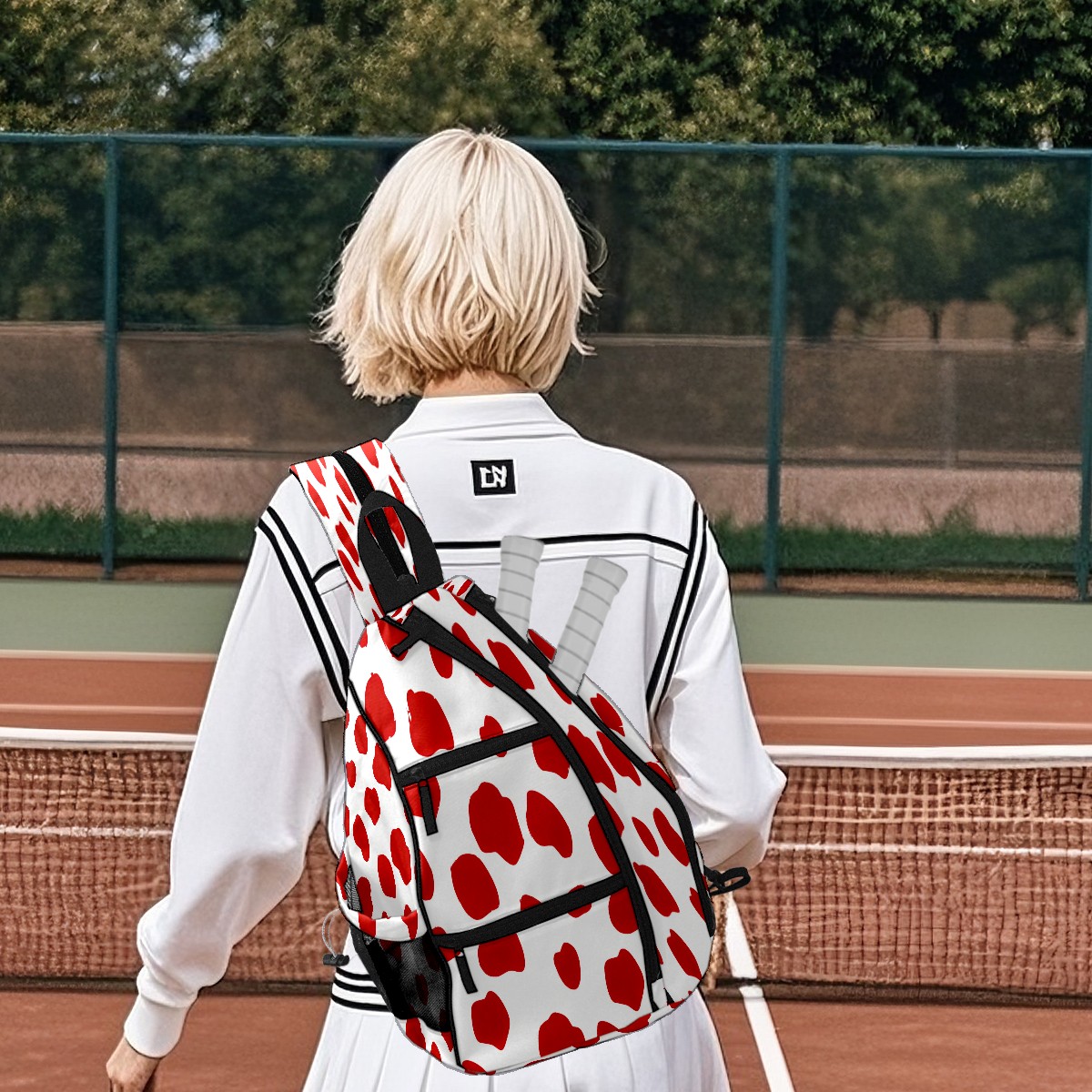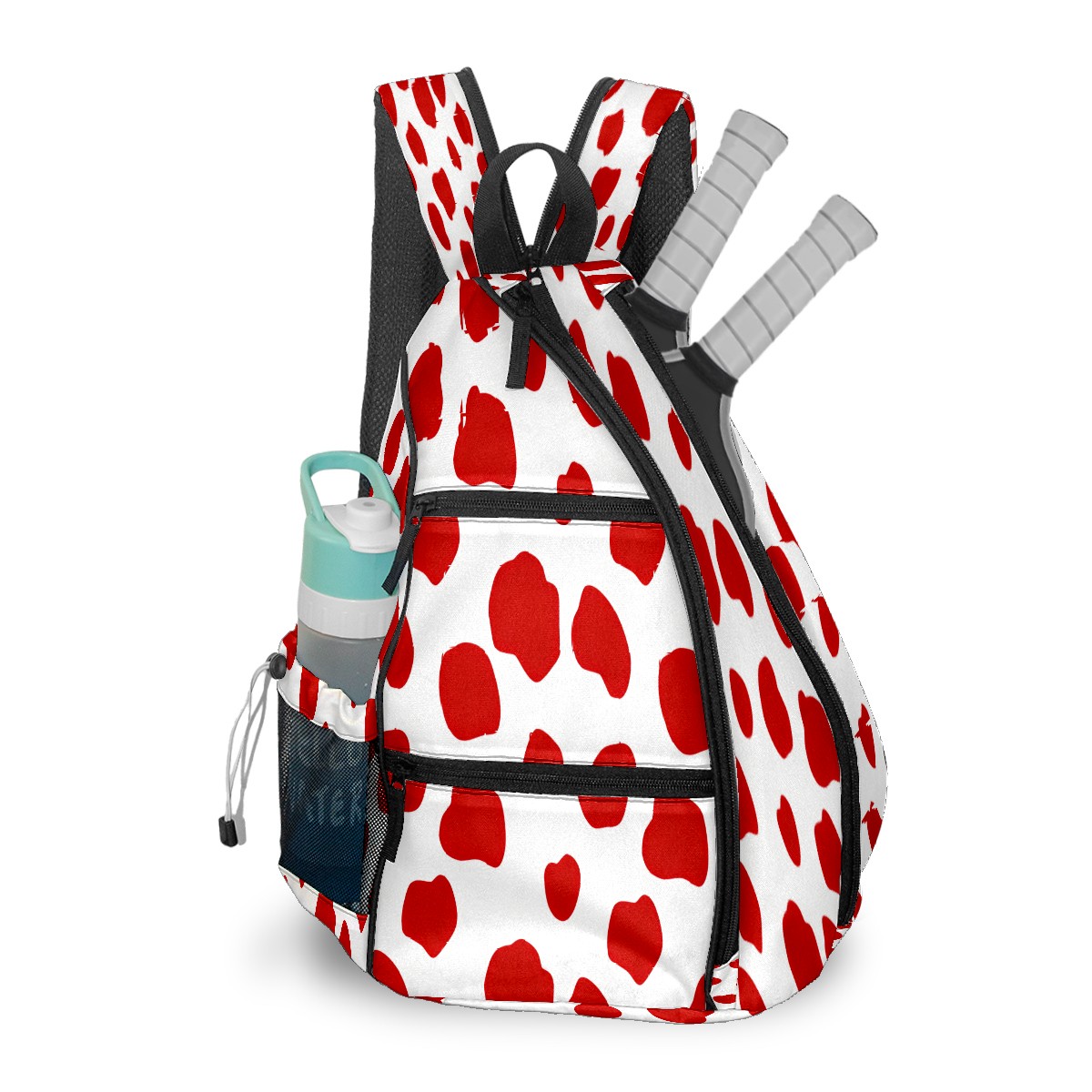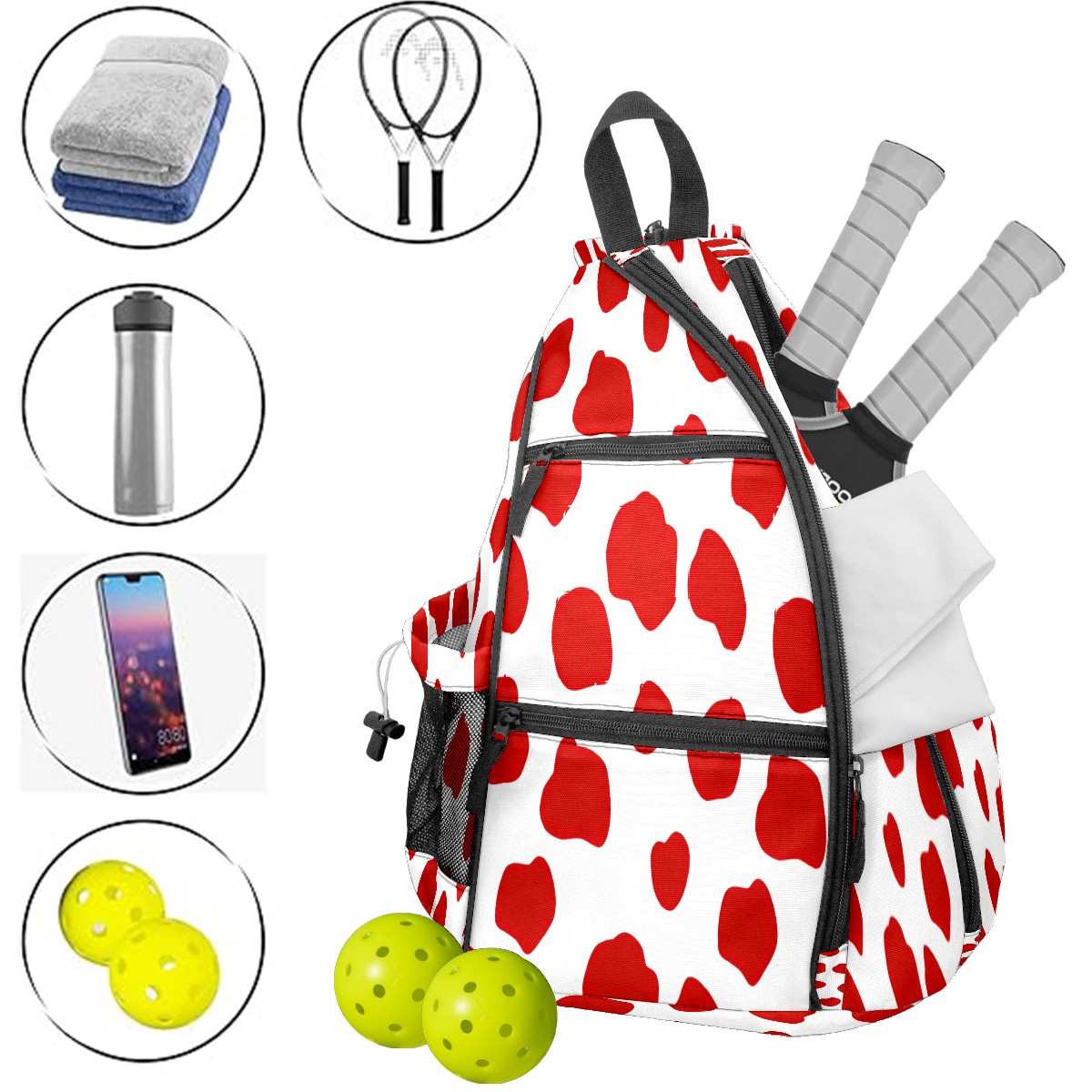 Pickleball Sling Bag for Women and Men - Backpack with Nylon Fabric/Woven Strap/Mesh Pocket/Fence Hook/Adjustable Bag Playful Dot Red