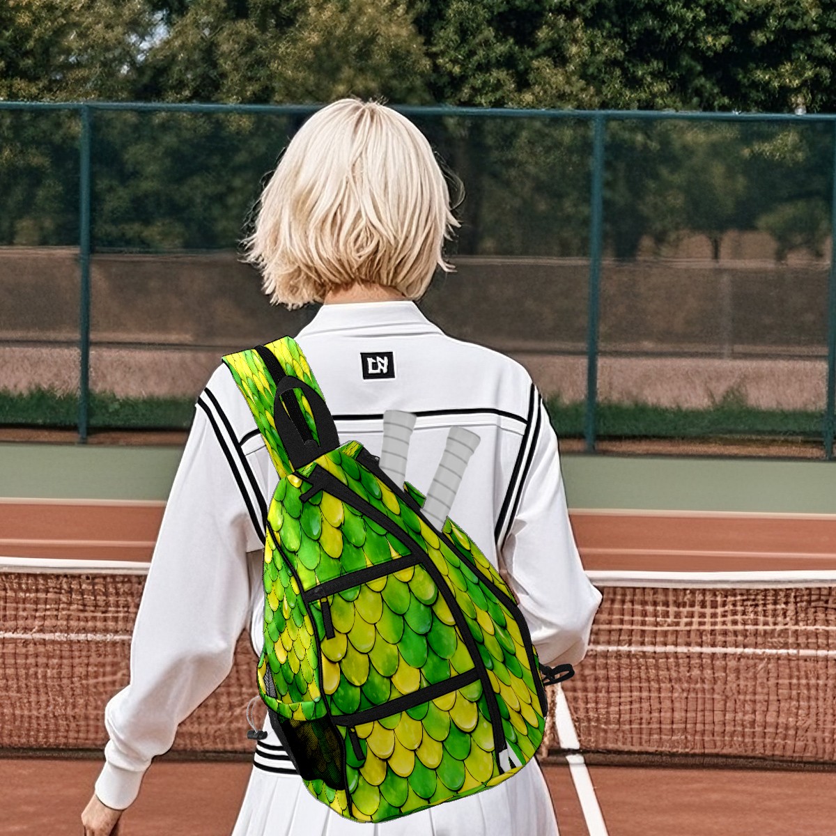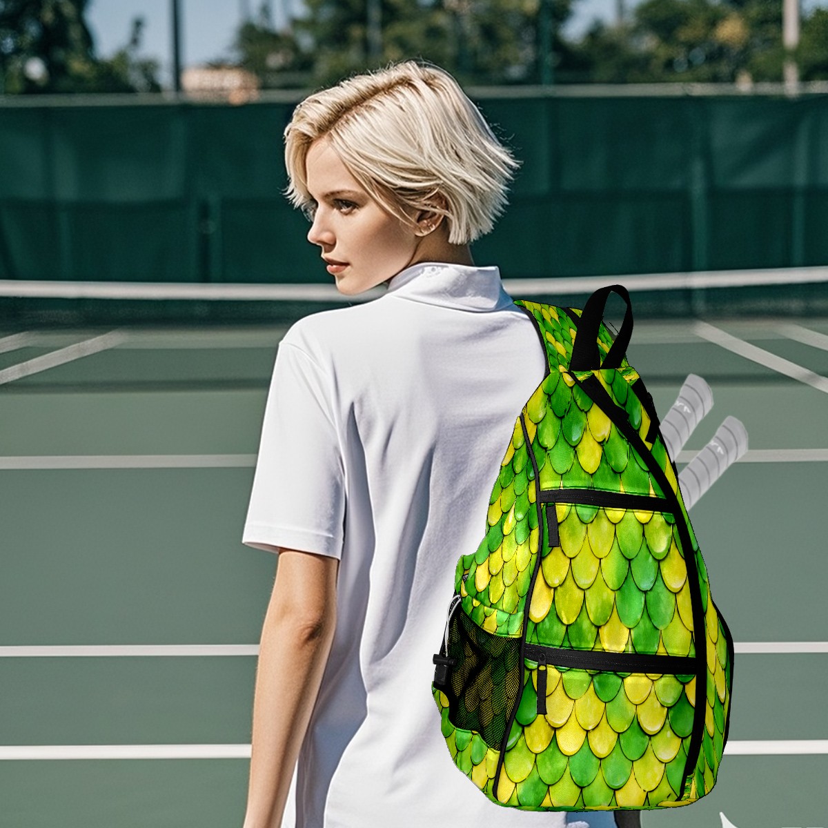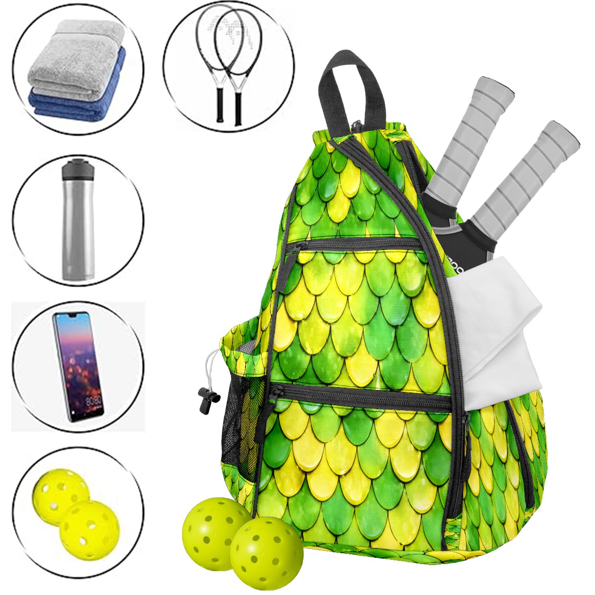 Pickleball Sling Bag for Women and Men - Backpack with Nylon Fabric/Woven Strap/Mesh Pocket/Fence Hook/Adjustable Bag Fish Scale Green