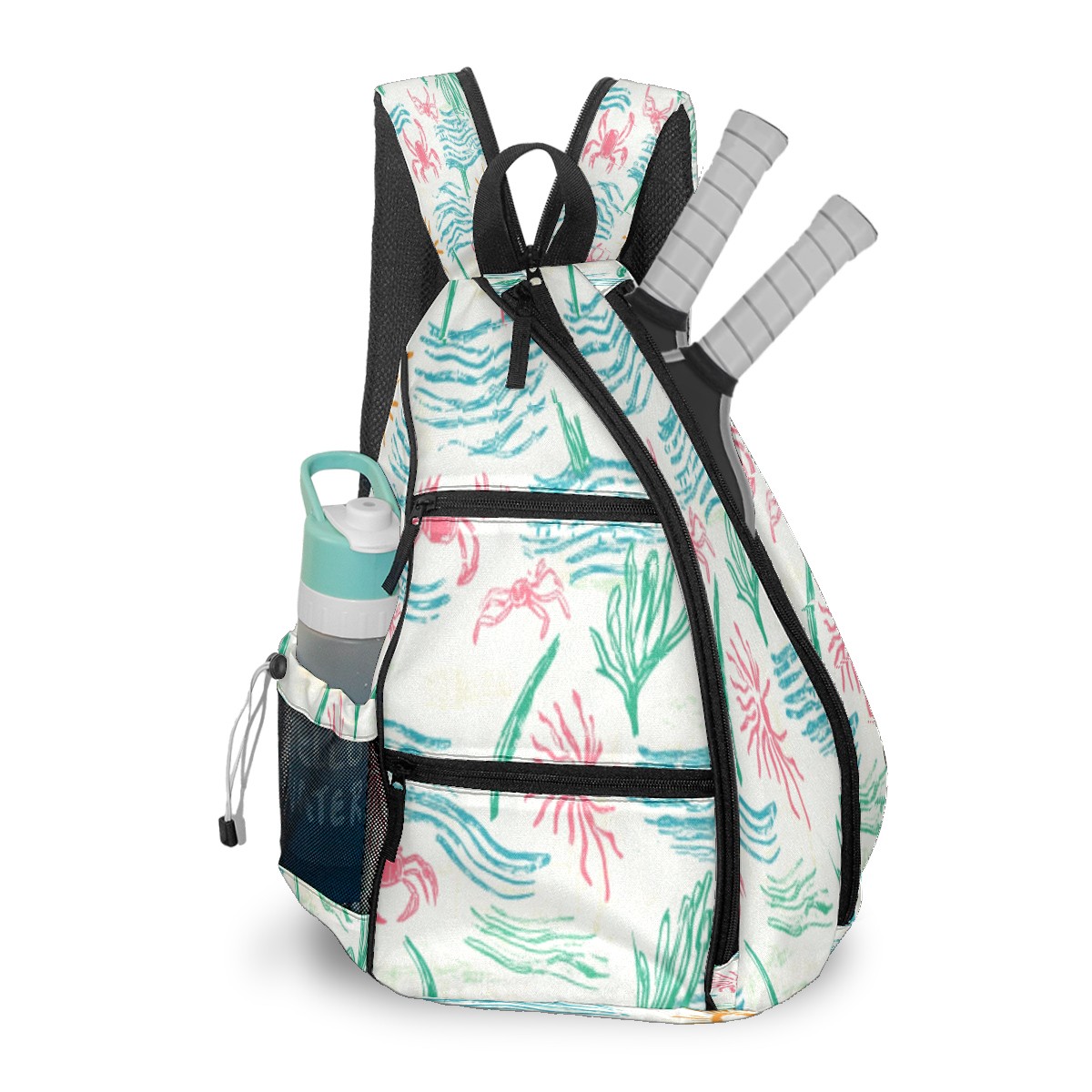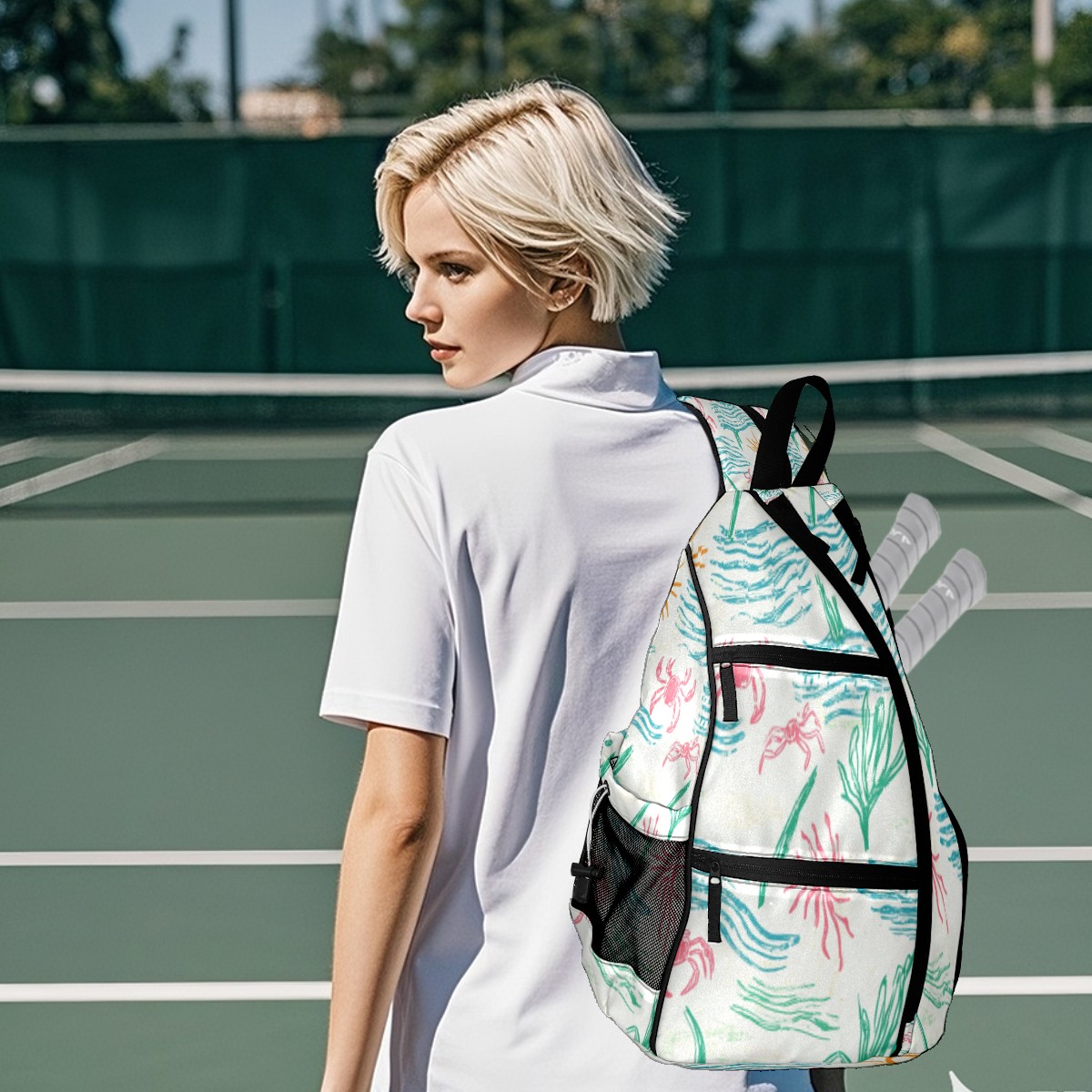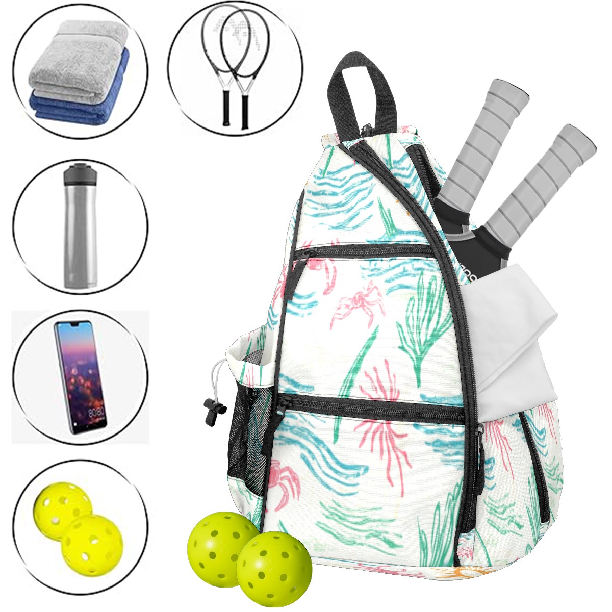 Pickleball Sling Bag for Women and Men - Backpack with Nylon Fabric/Woven Strap/Mesh Pocket/Fence Hook/Adjustable Bag Sunny Coastal Print Design