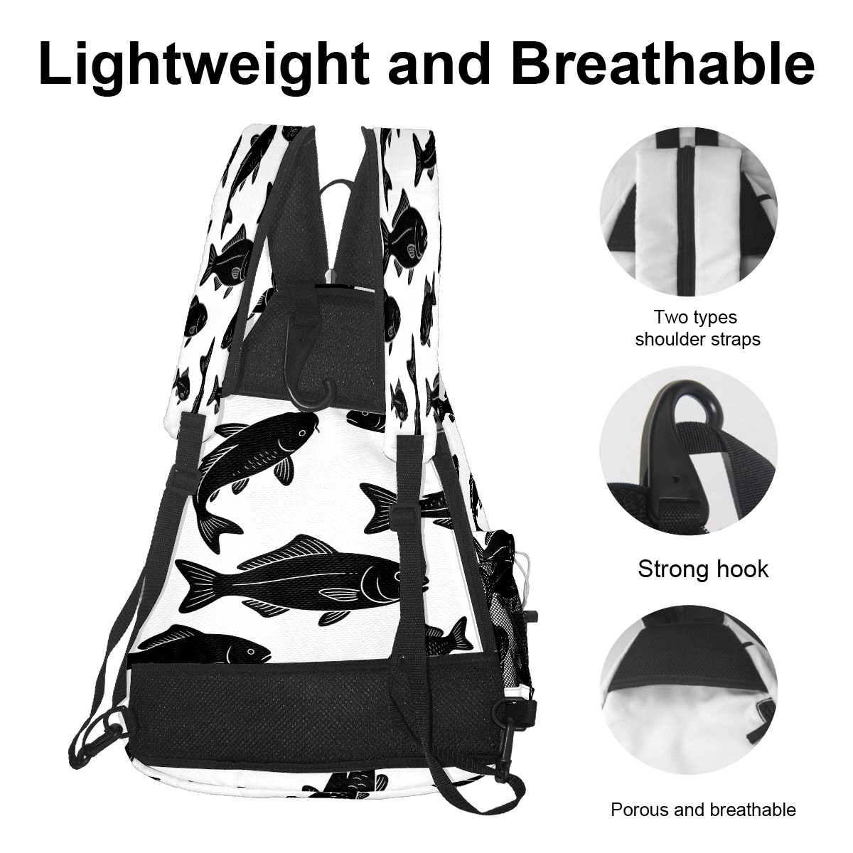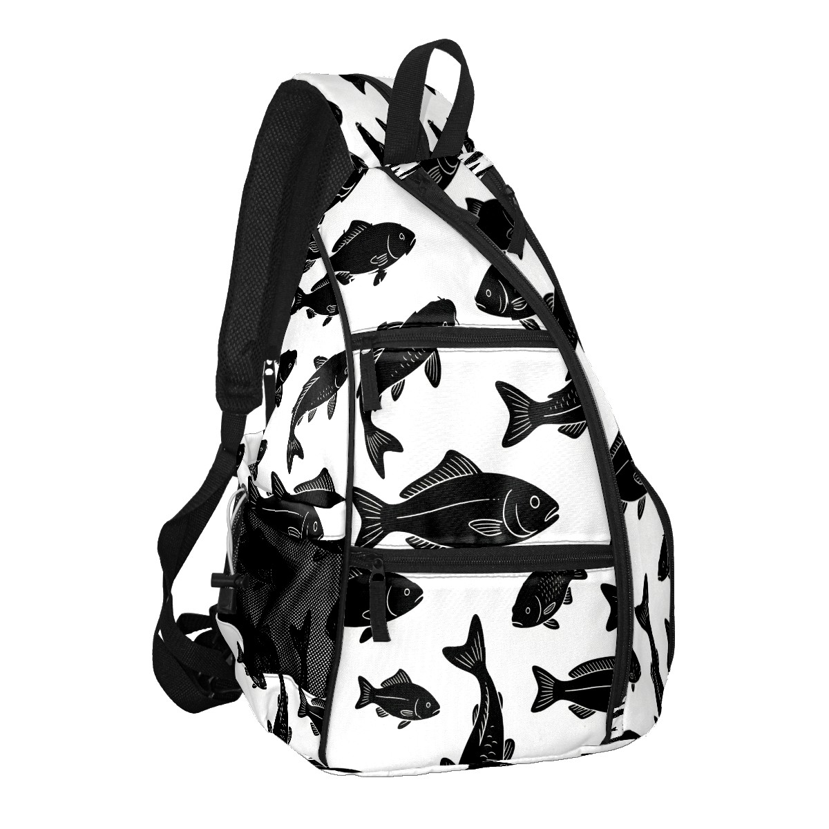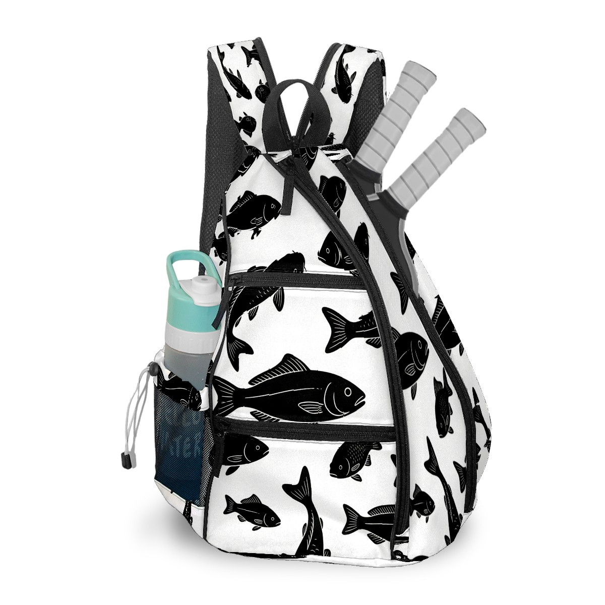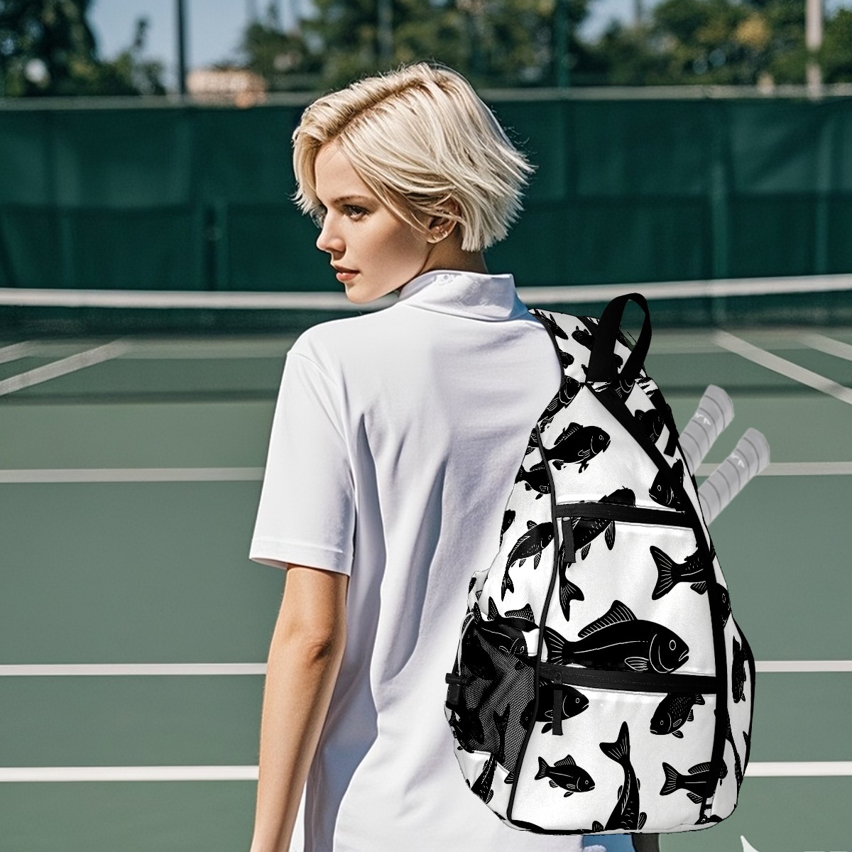 Pickleball Sling Bag for Women and Men - Backpack with Nylon Fabric/Woven Strap/Mesh Pocket/Fence Hook/Adjustable Bag Cool Fish Black