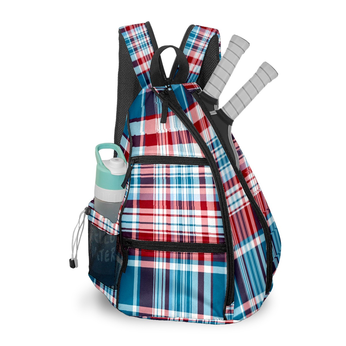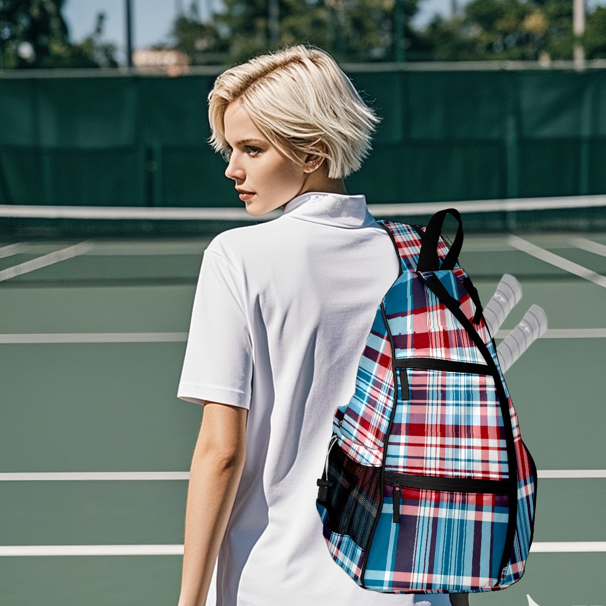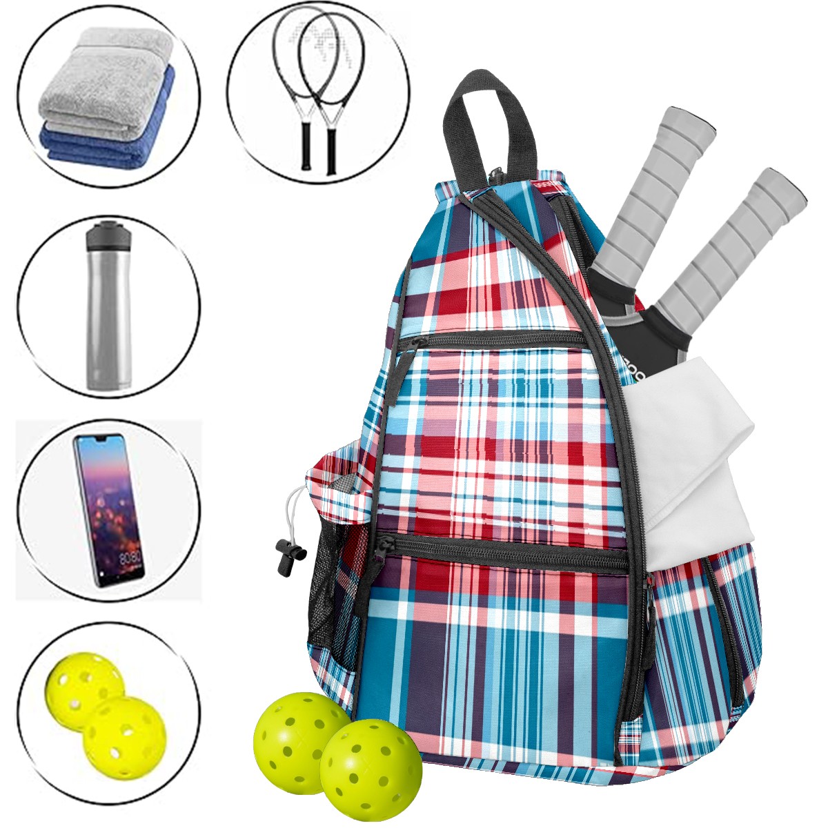 Pickleball Sling Bag for Women and Men - Backpack with Nylon Fabric/Woven Strap/Mesh Pocket/Fence Hook/Adjustable Bag Classic Plaid Blue