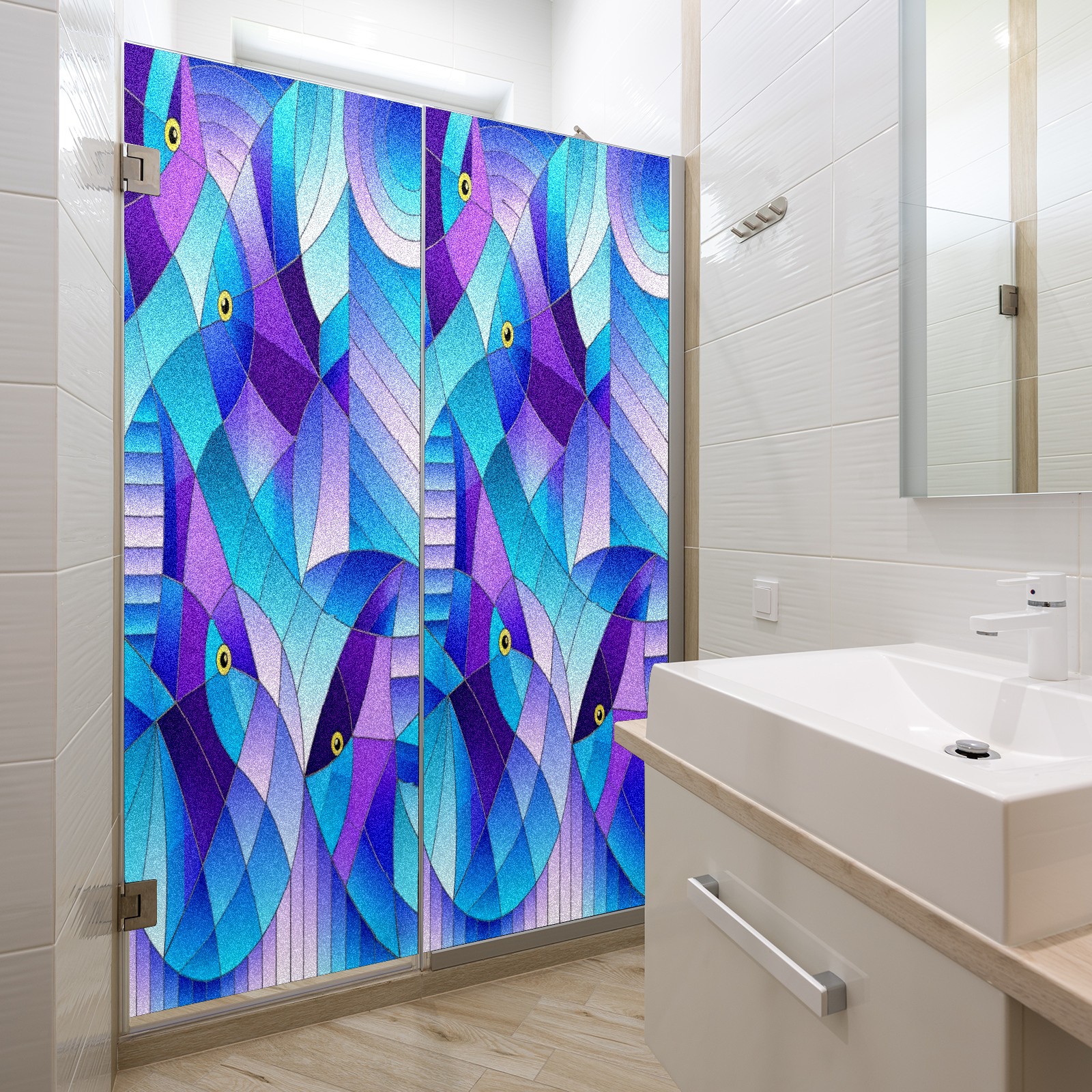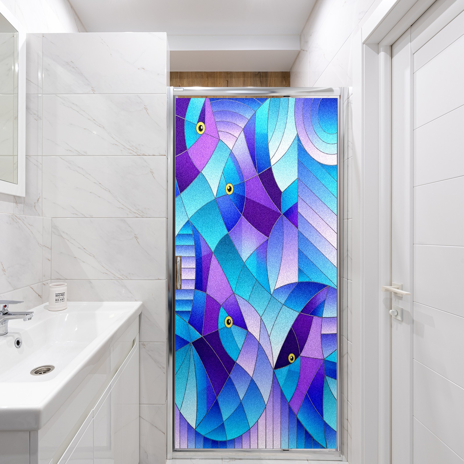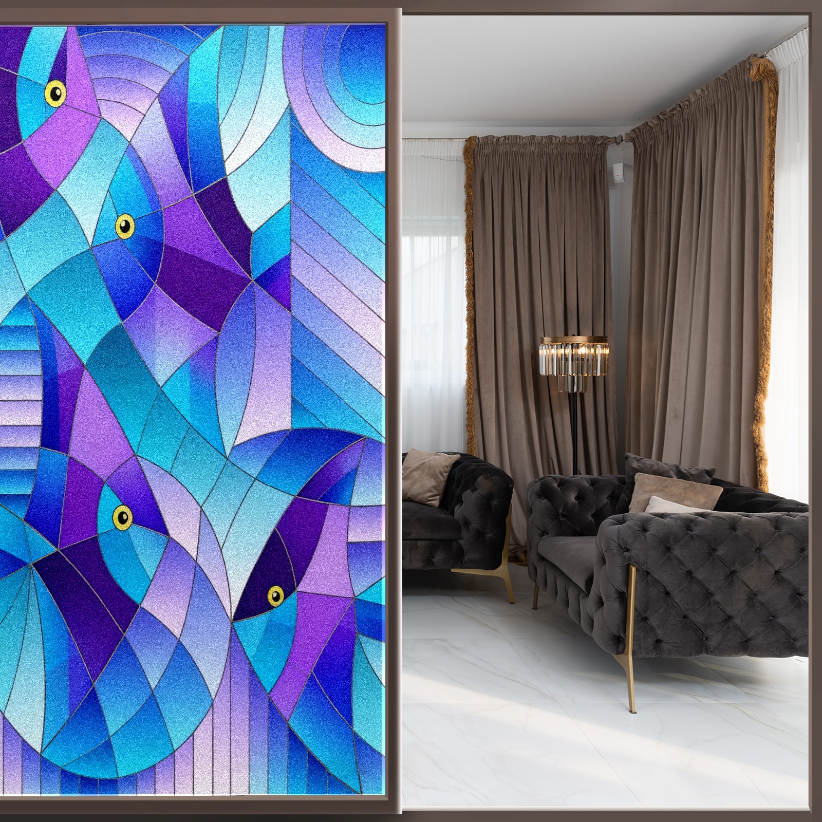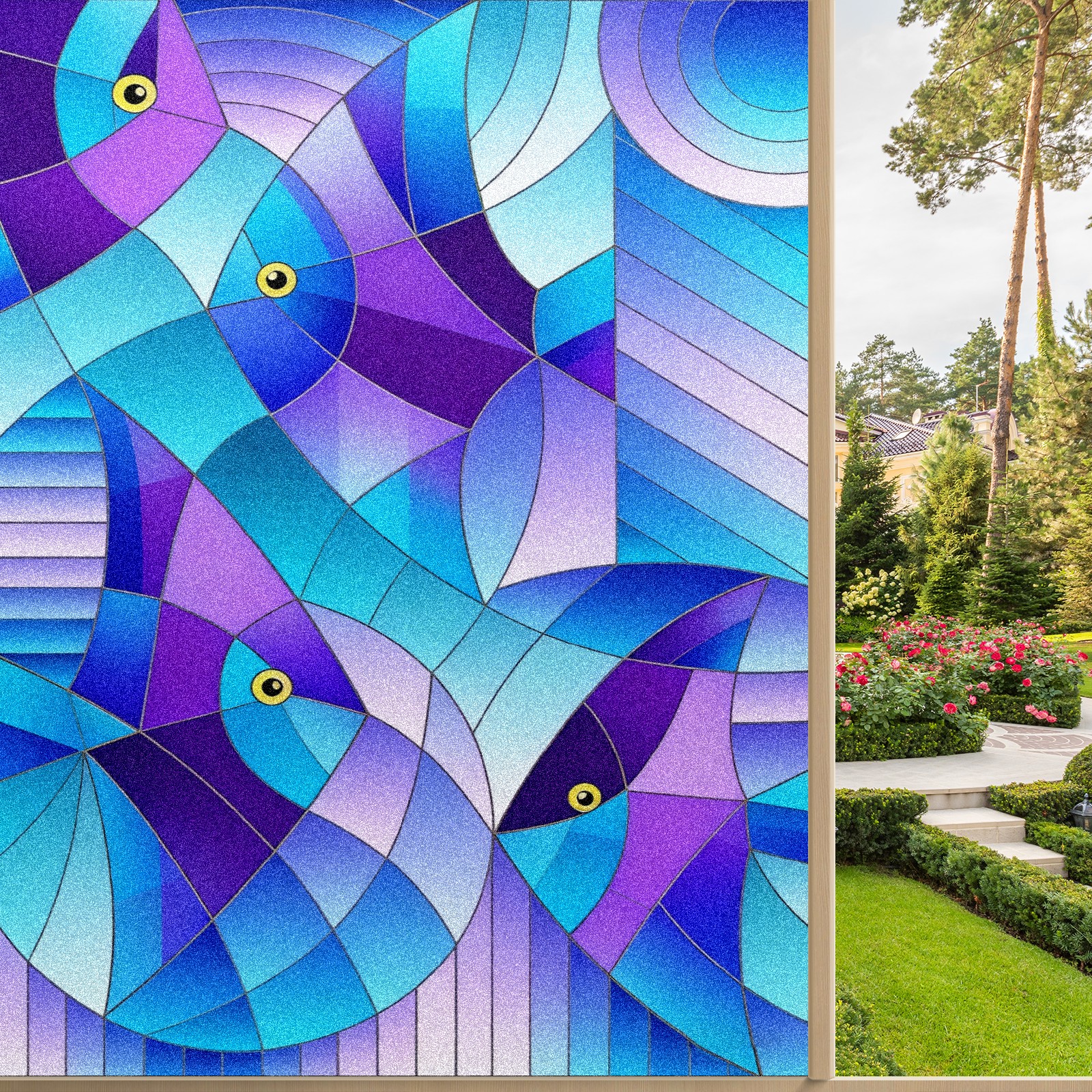 Counullo Frosted Glass Privacy Window Film, Blue Geometry Fish Non Adhesive Static Cling, Reusable PET Window Sticker for Bathroom Shower Door Bedroom Office Living Room (17.7x23.6in)